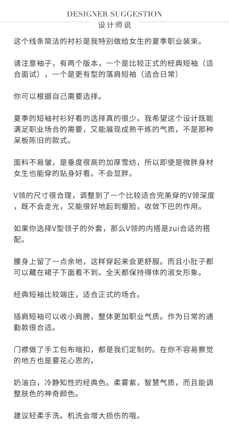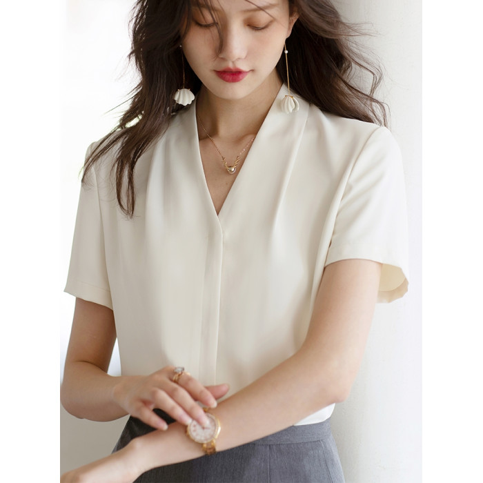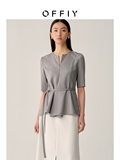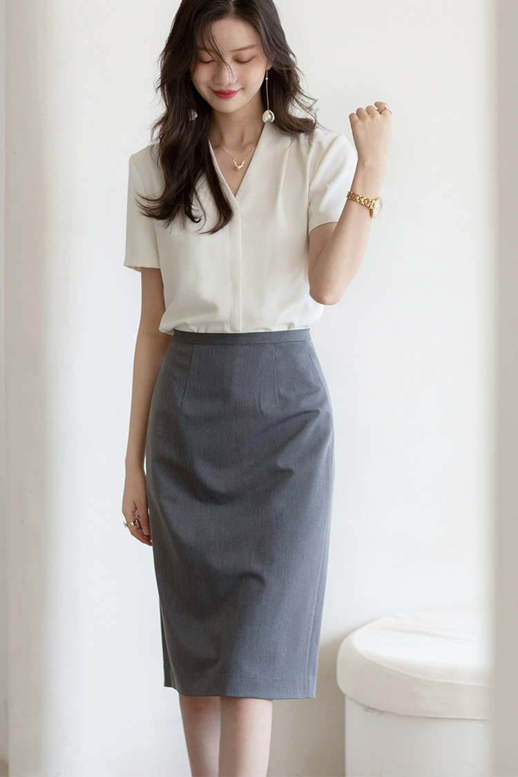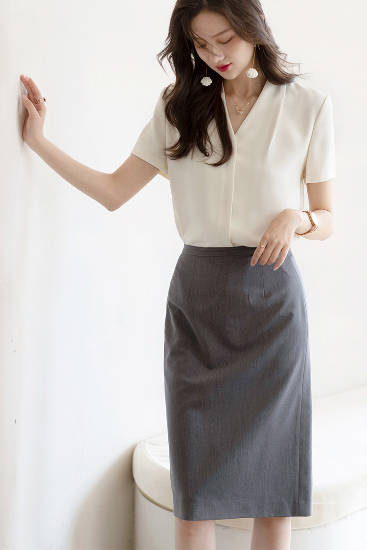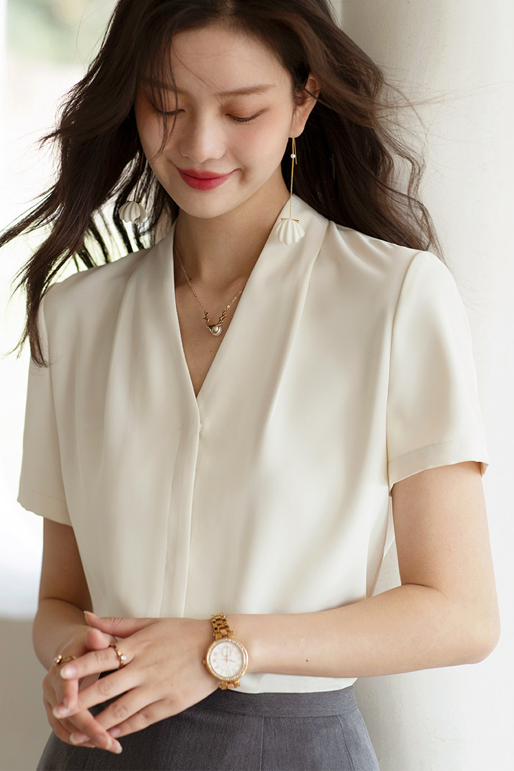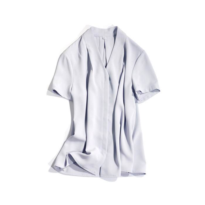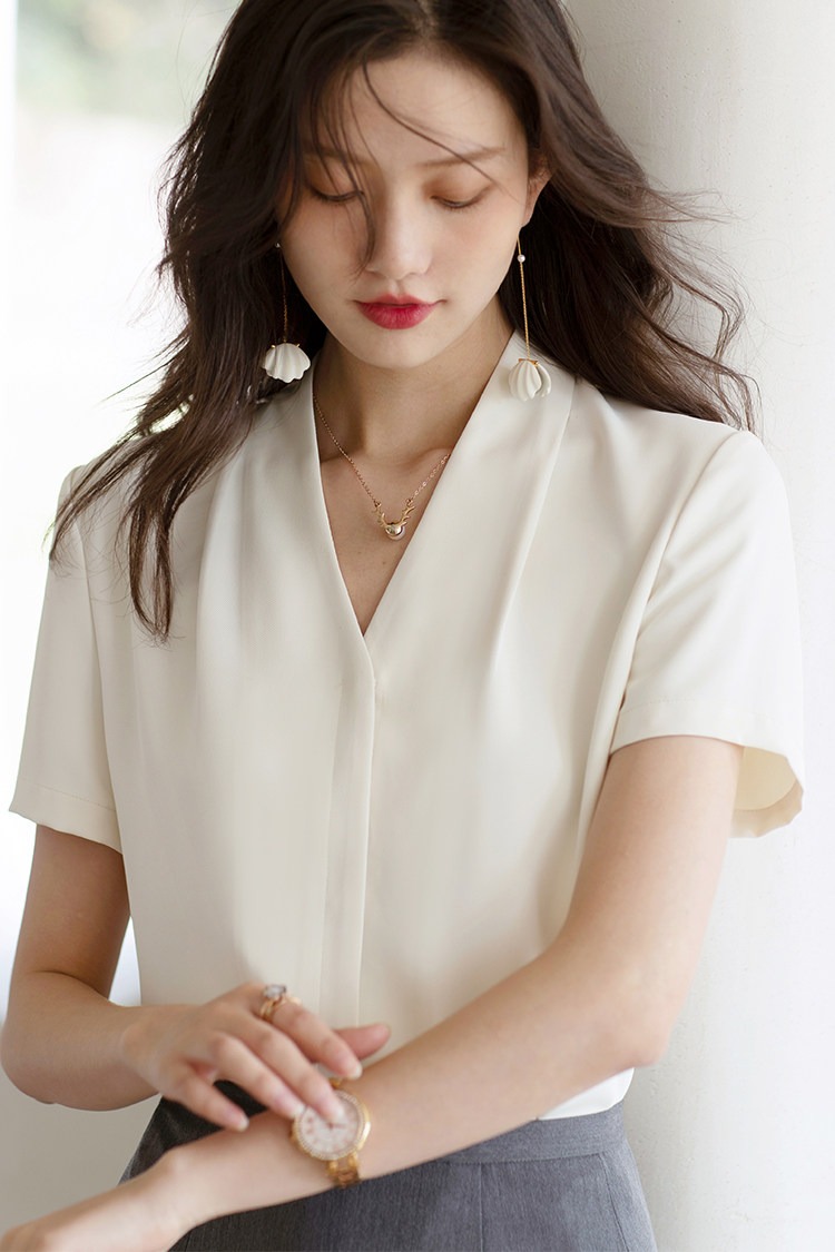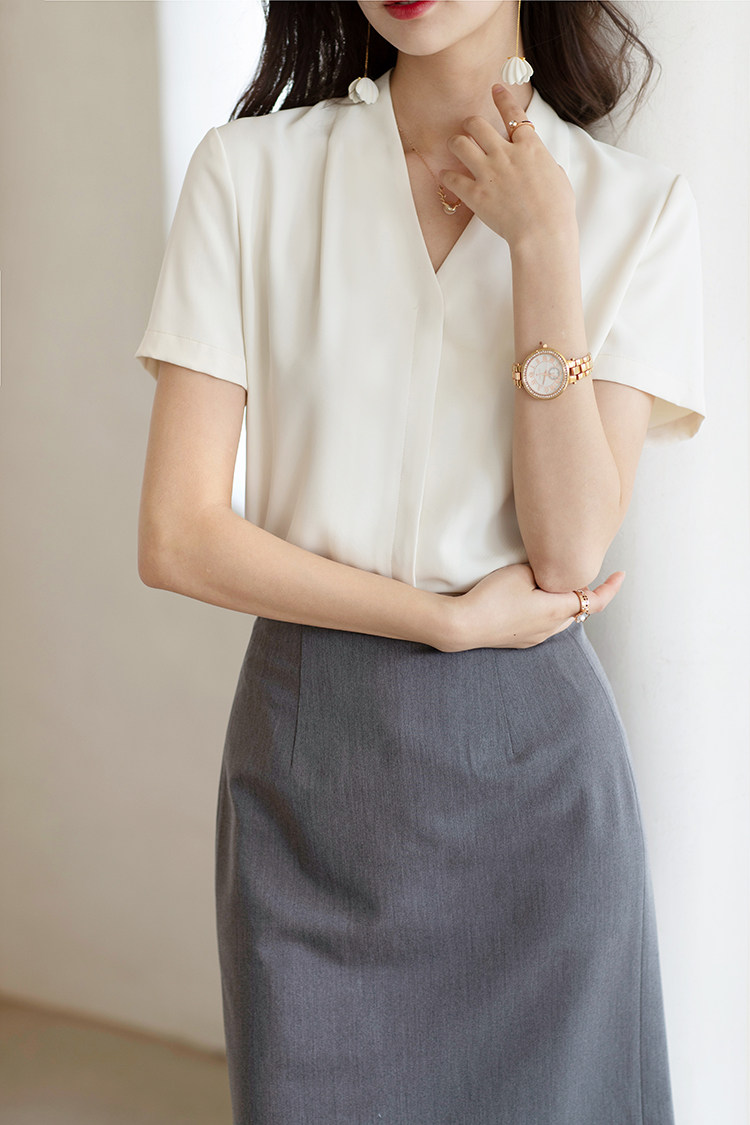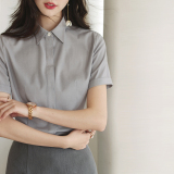 OFFIY 高智氣質 高級輕熟V領法式短袖職業通勤灰色白色襯衫女上衣