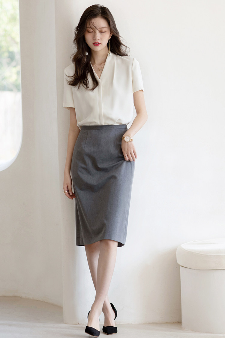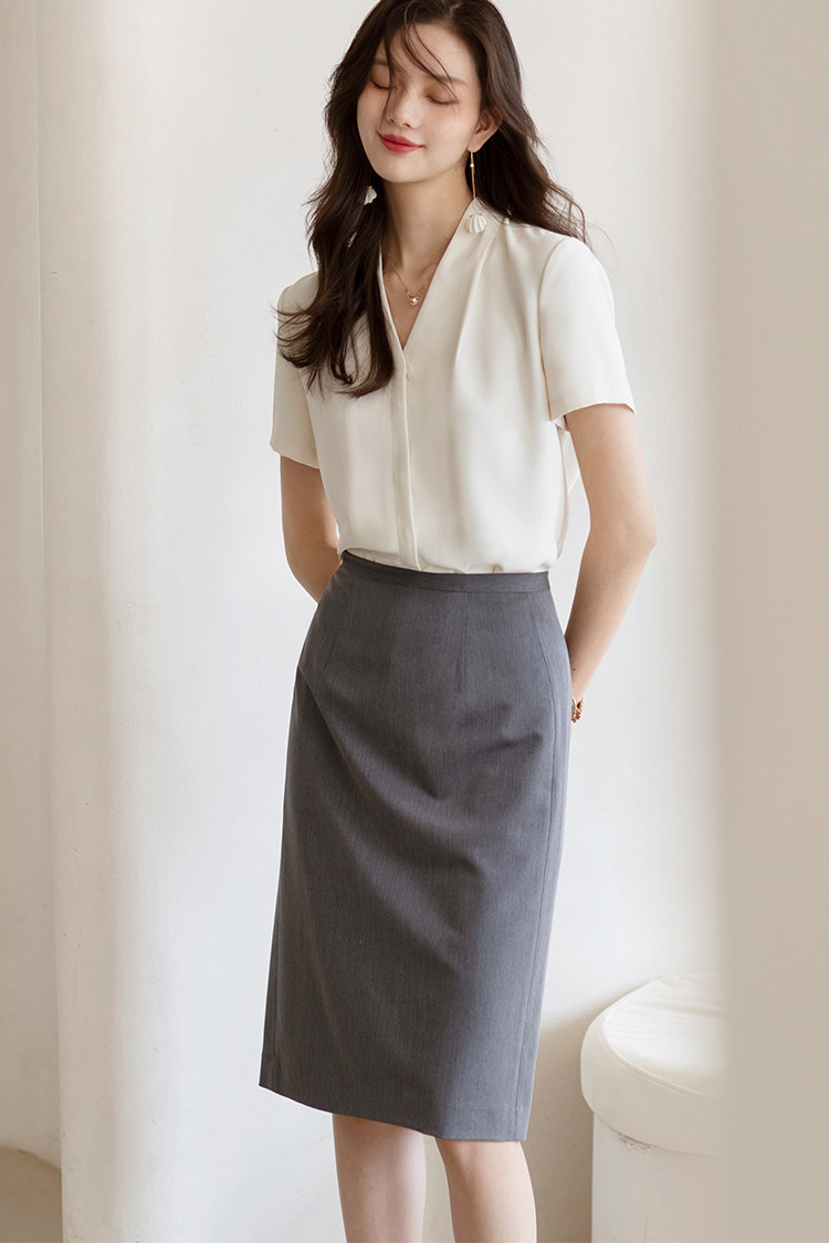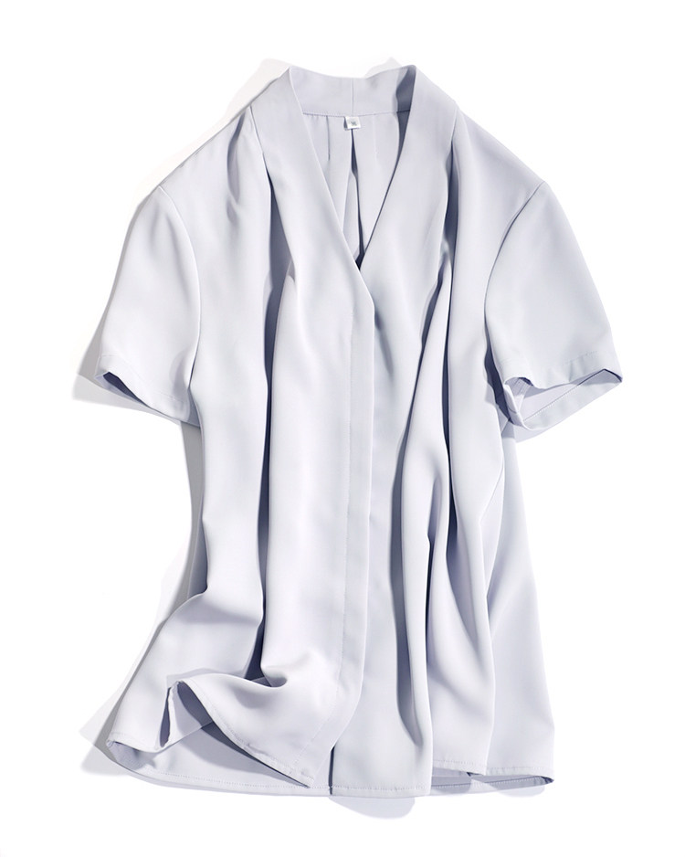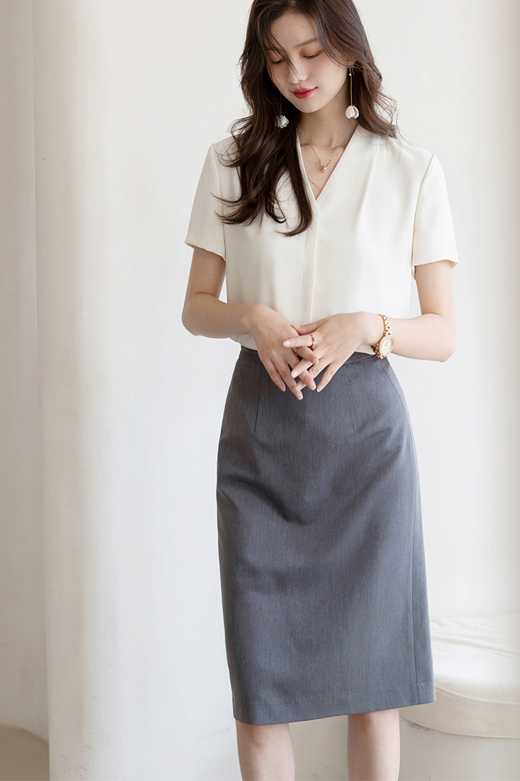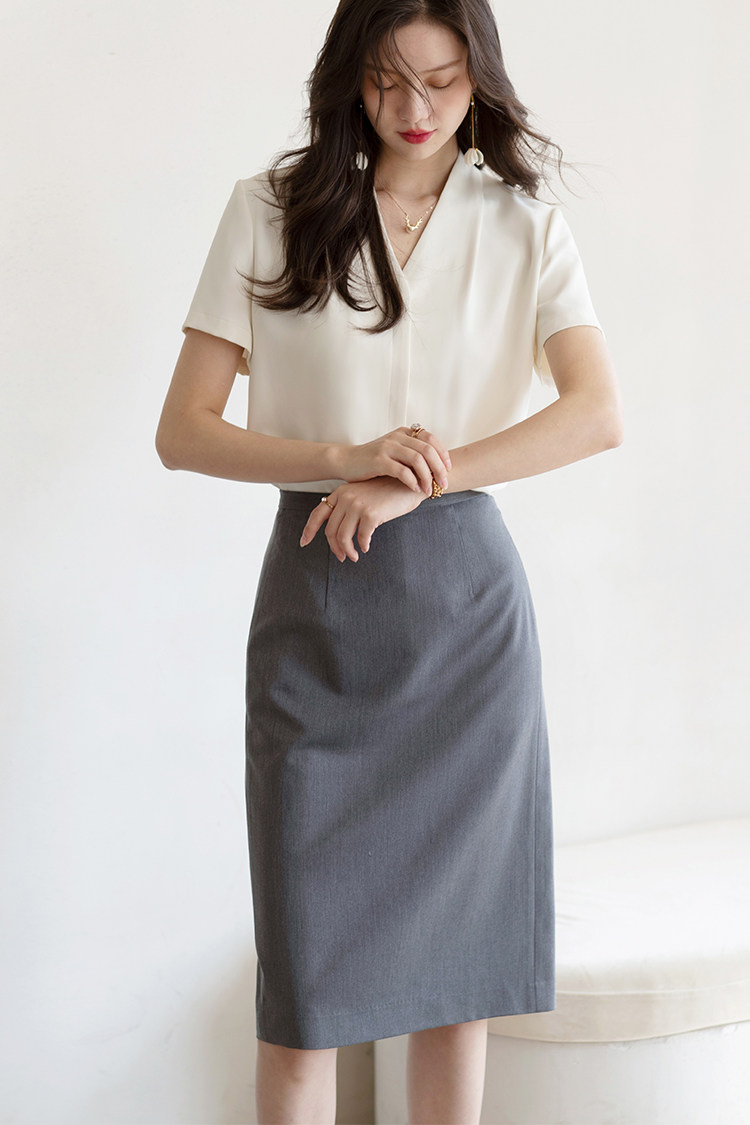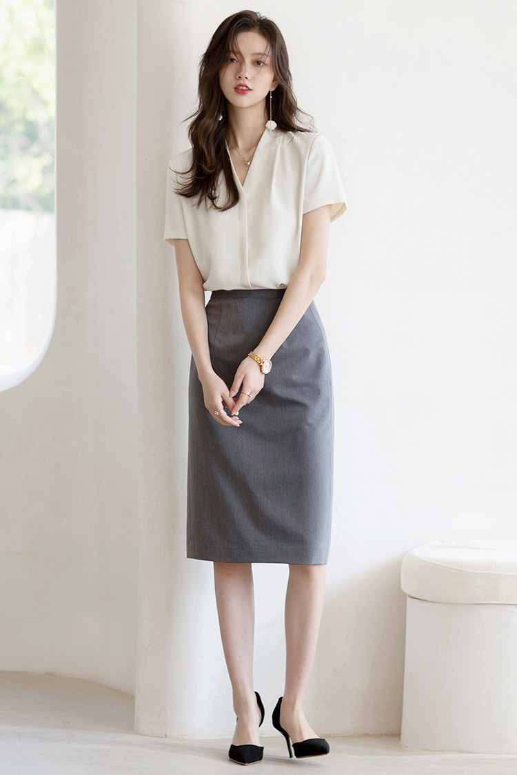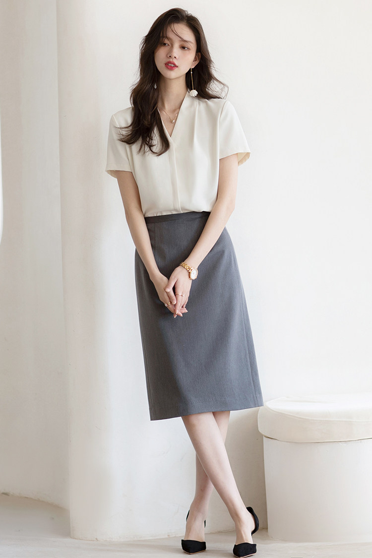 OFFIY 高智氣質 高級輕熟V領法式短袖職業通勤灰色白色襯衫女上衣