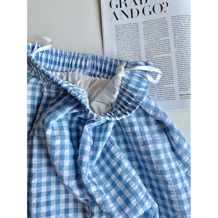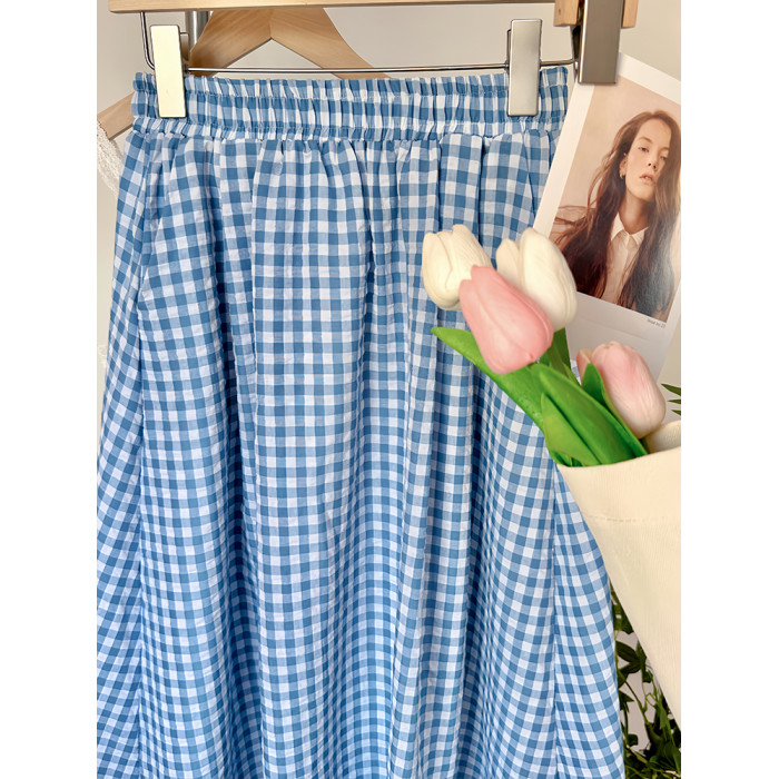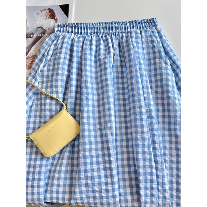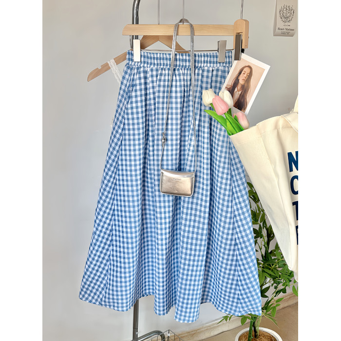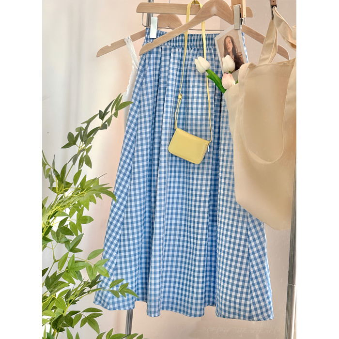 藍色格子半身裙女夏季2025新款小衆氣質巨好看文藝繖裙小清新半裙