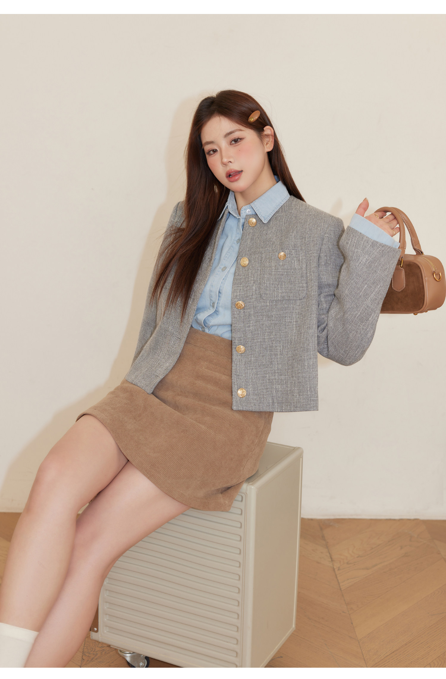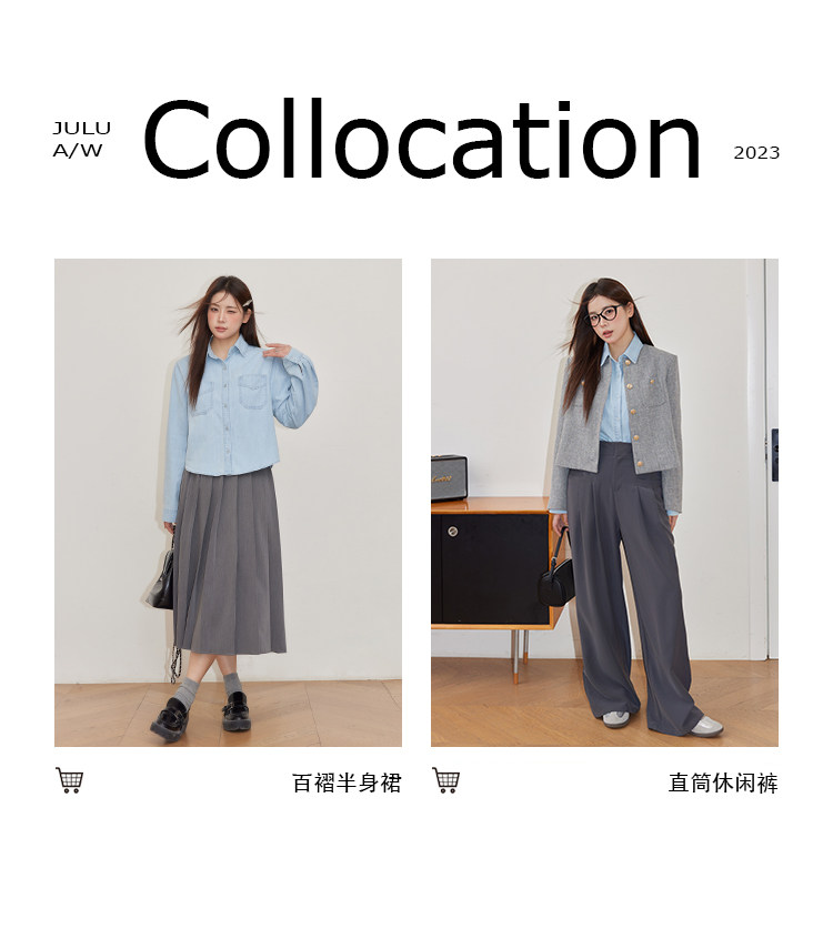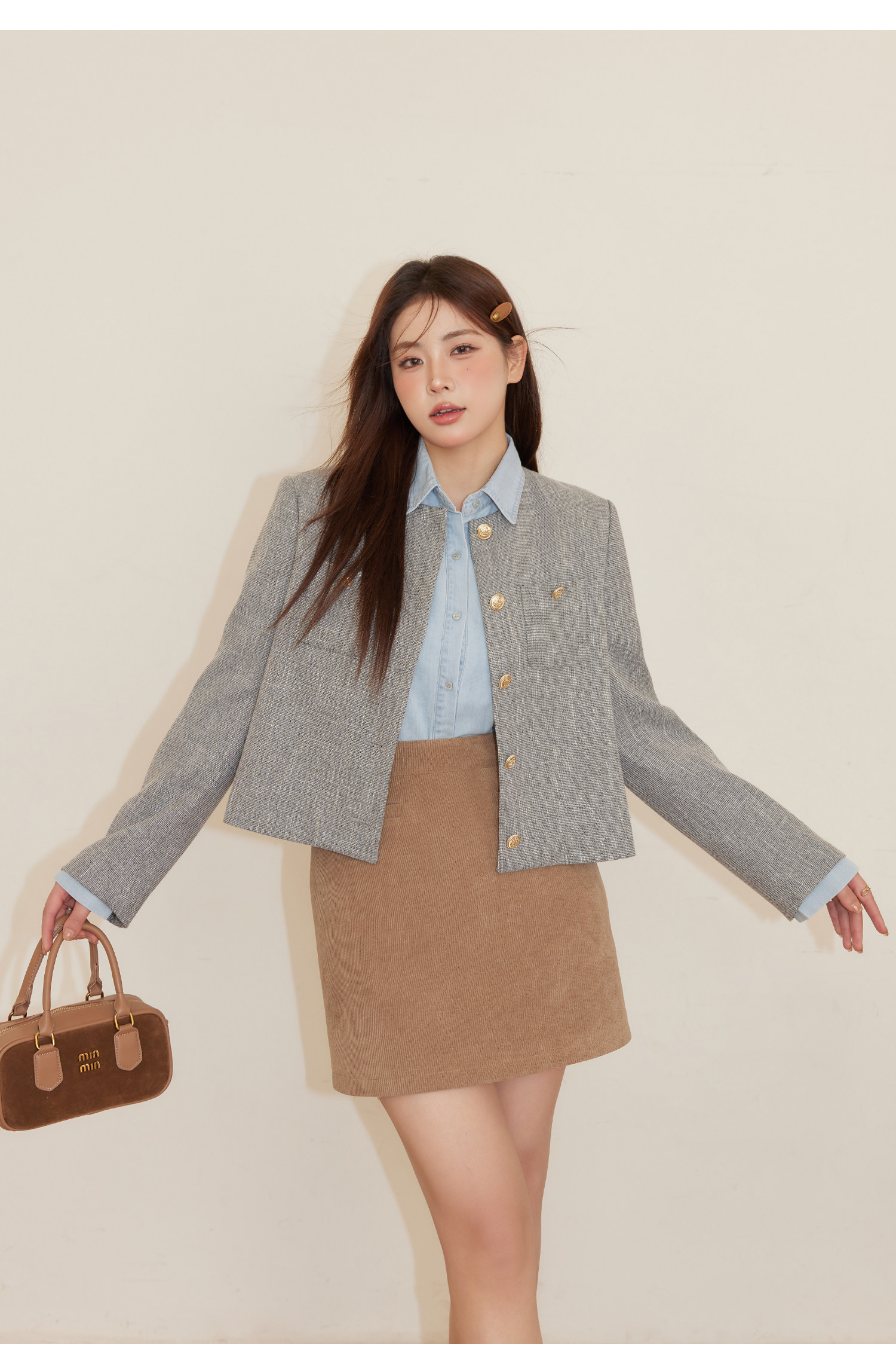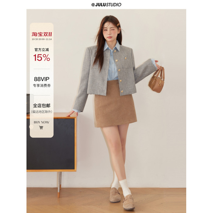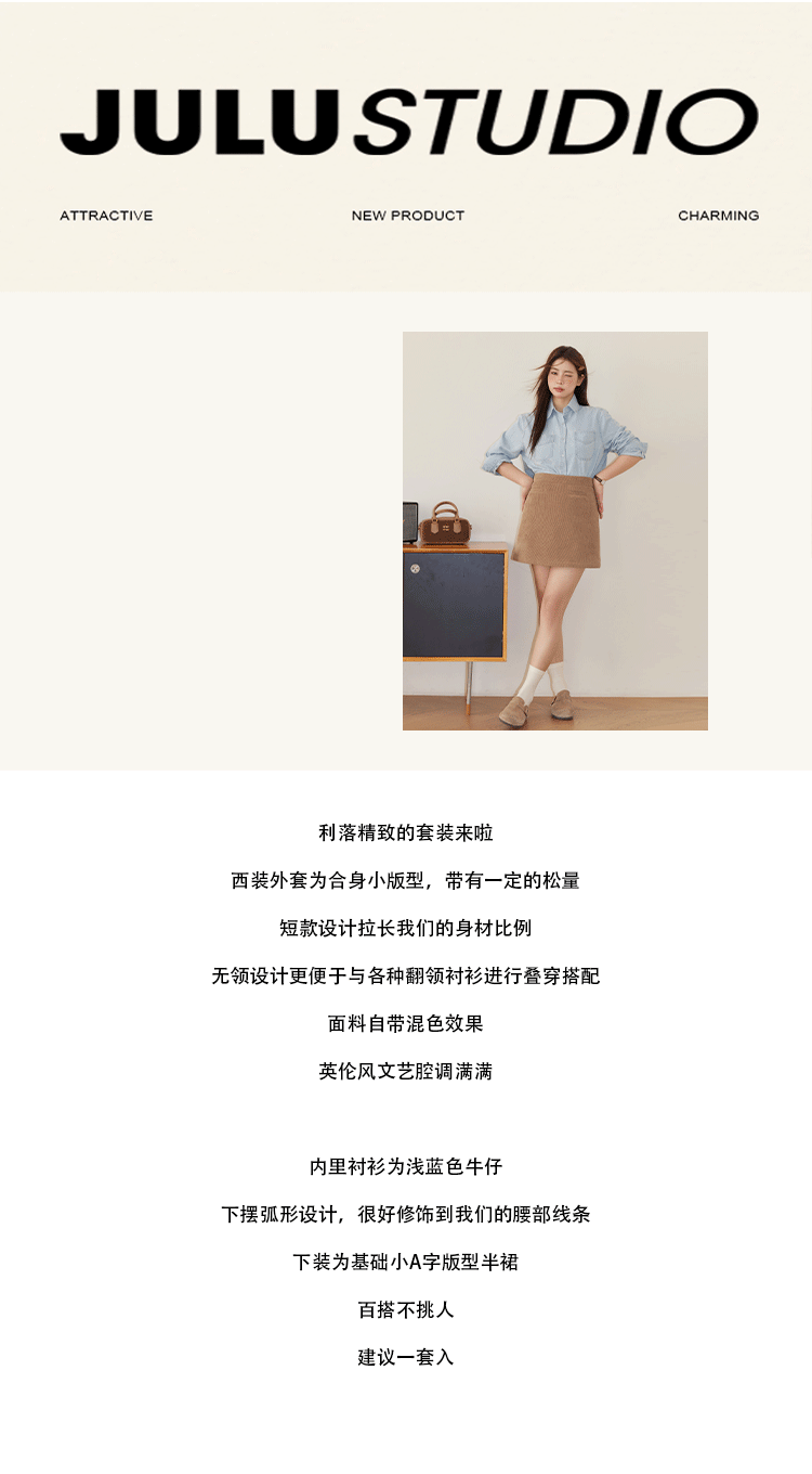 巨鹿工作室“珮斯畫廊”微胖mm無領西裝外套A字半裙牛仔襯衫套裝