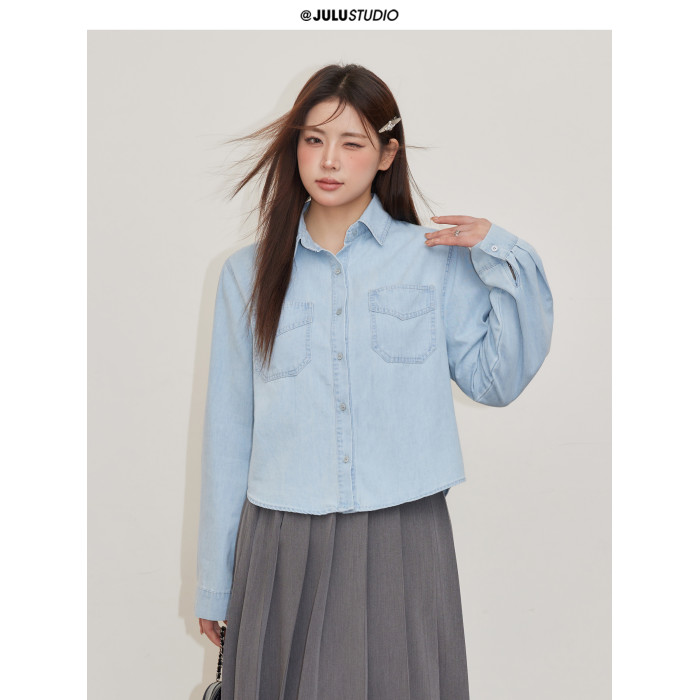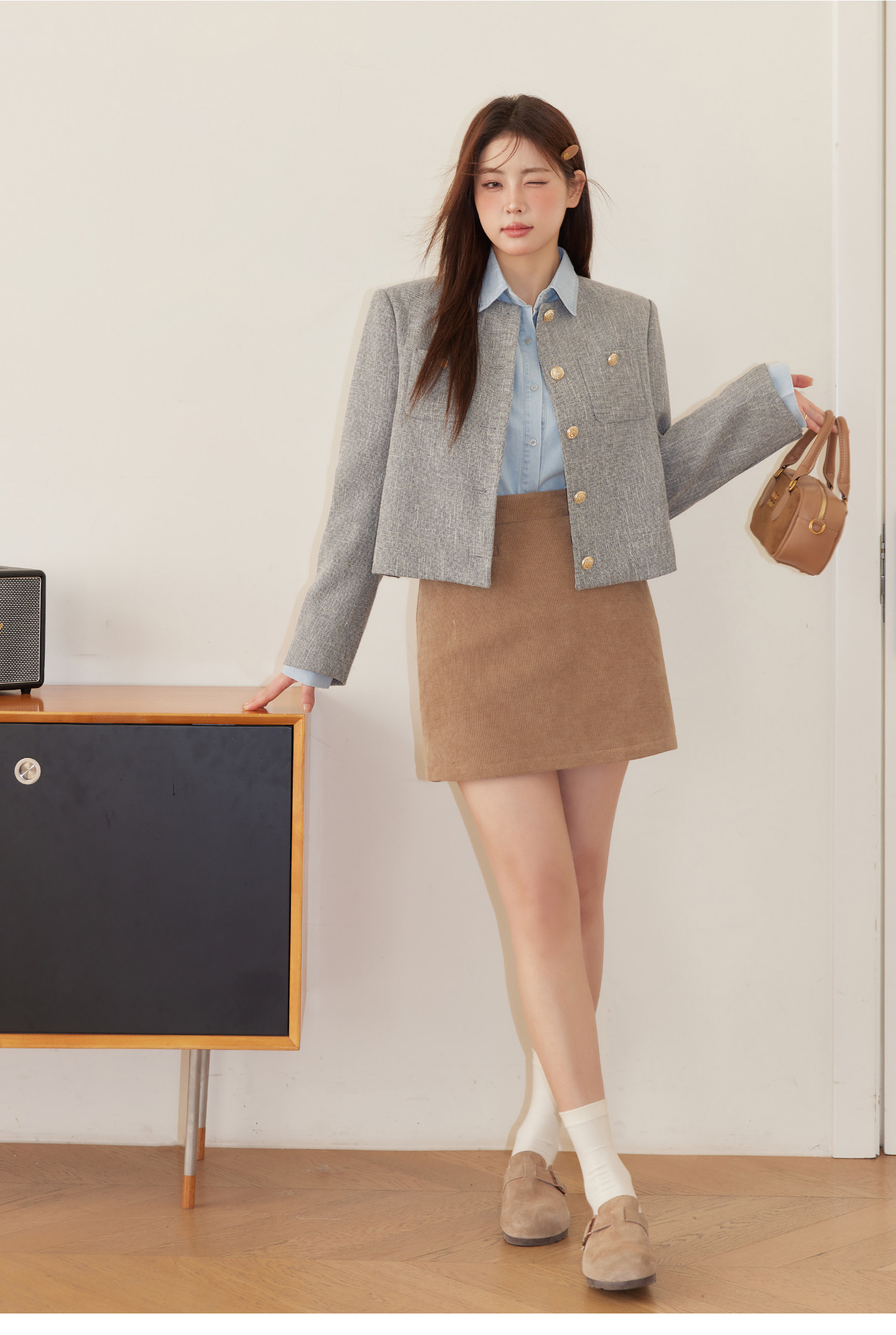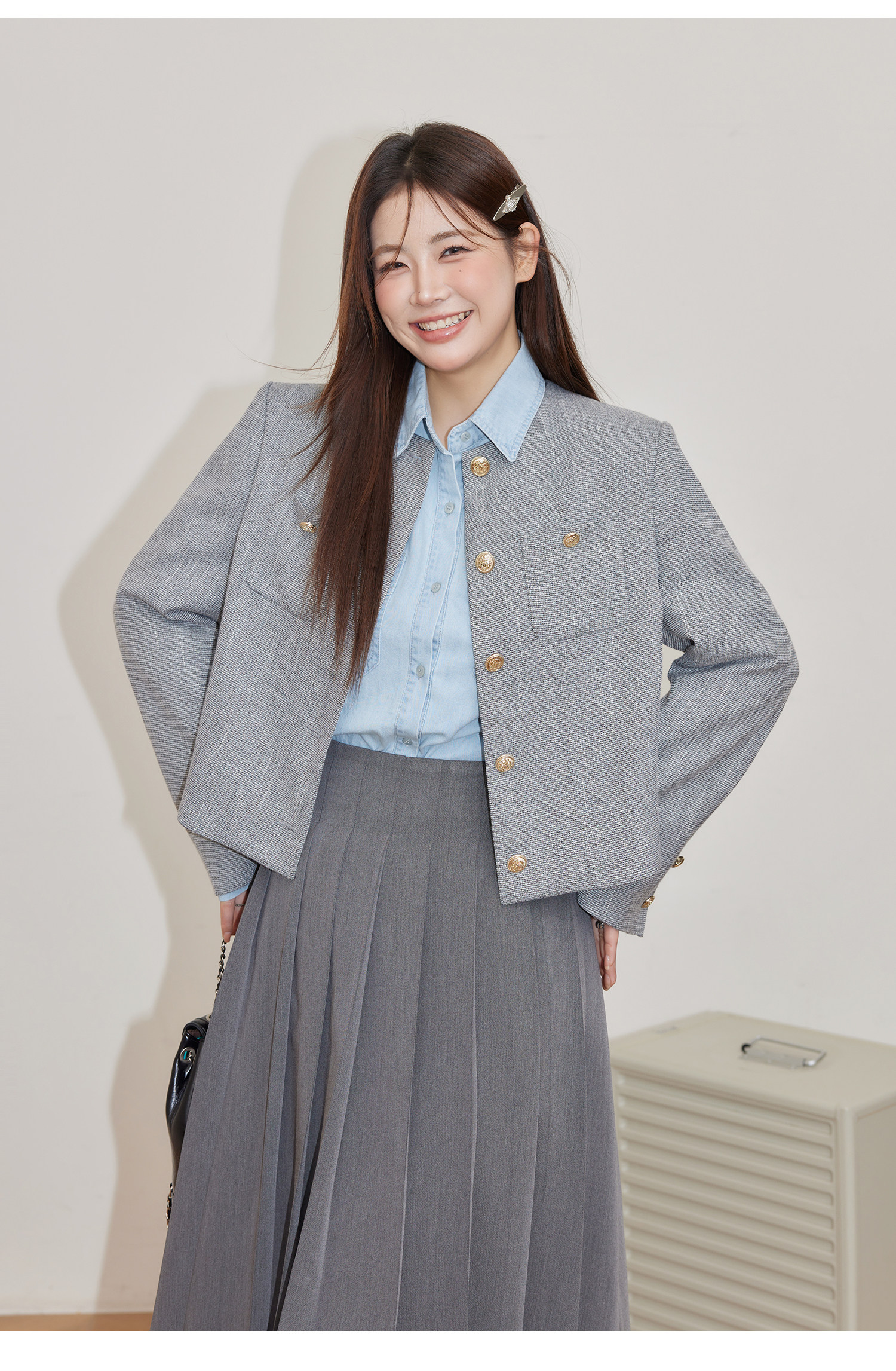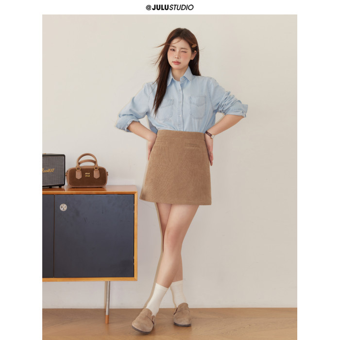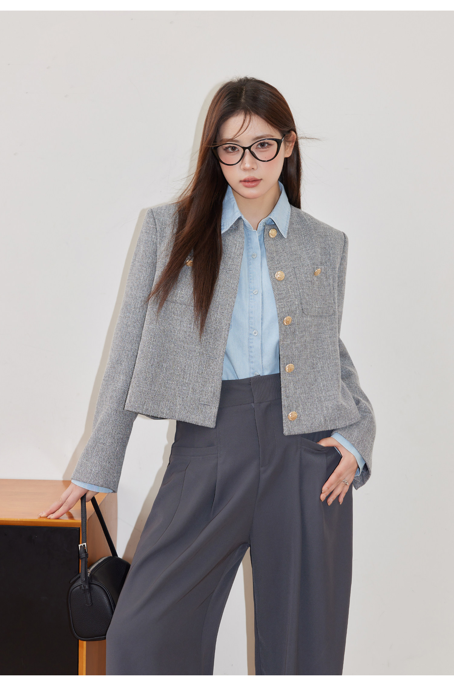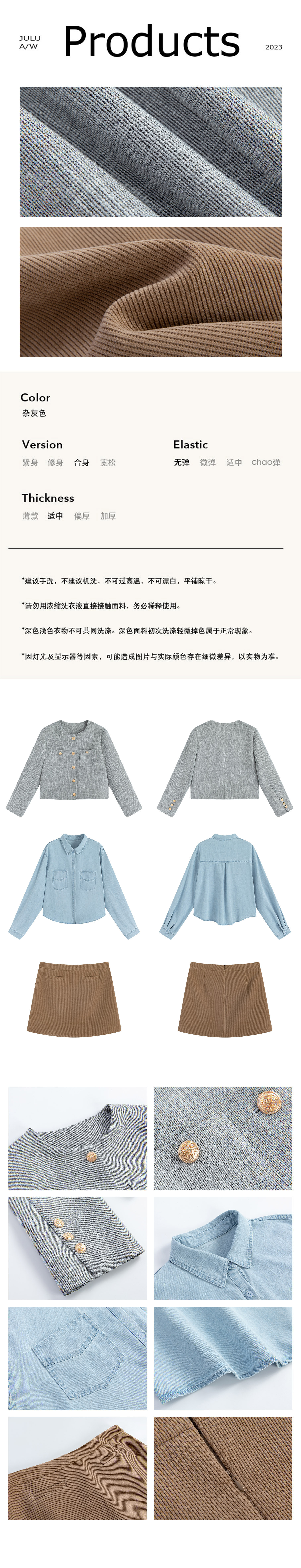 巨鹿工作室“珮斯畫廊”微胖mm無領西裝外套A字半裙牛仔襯衫套裝