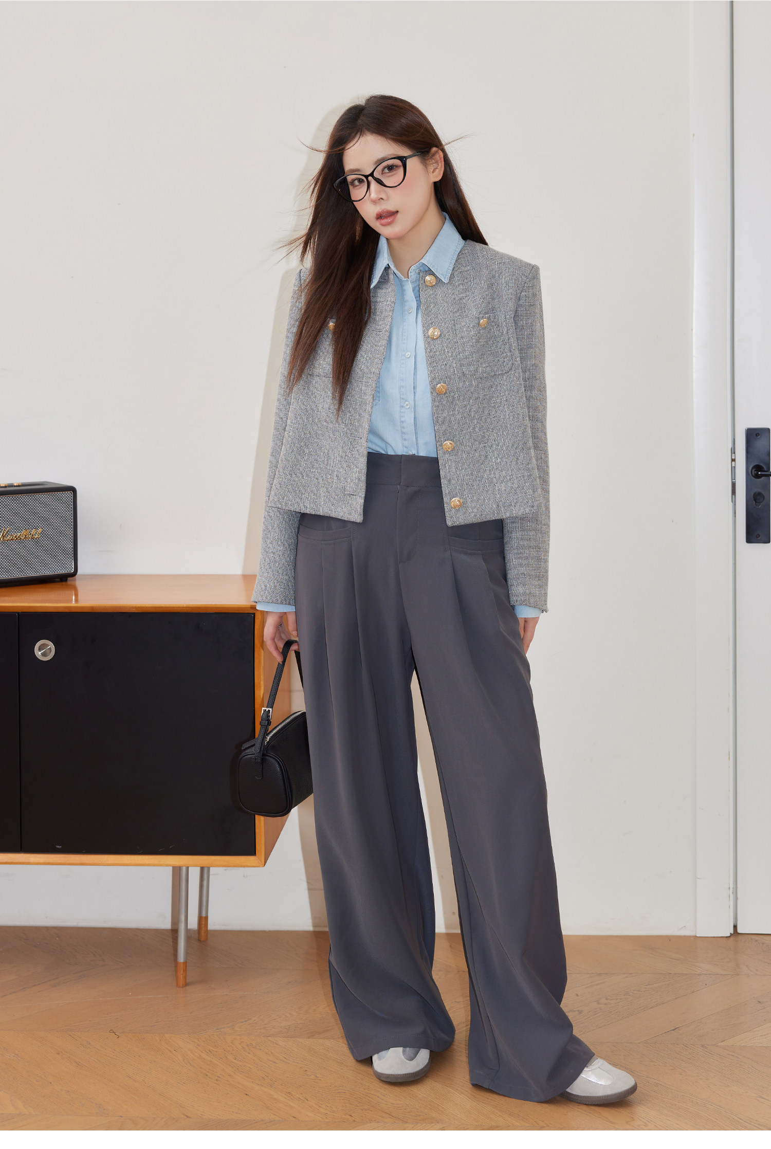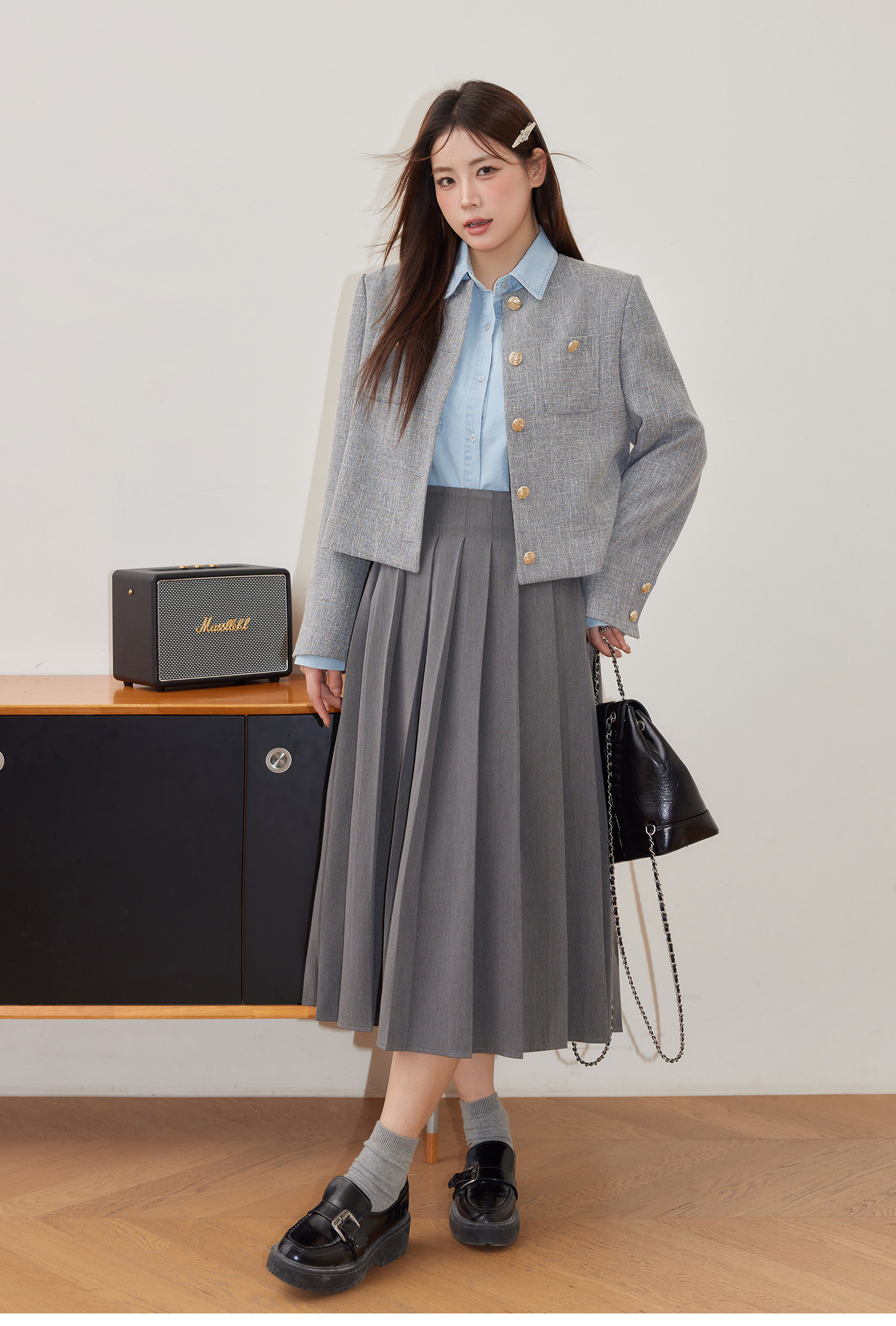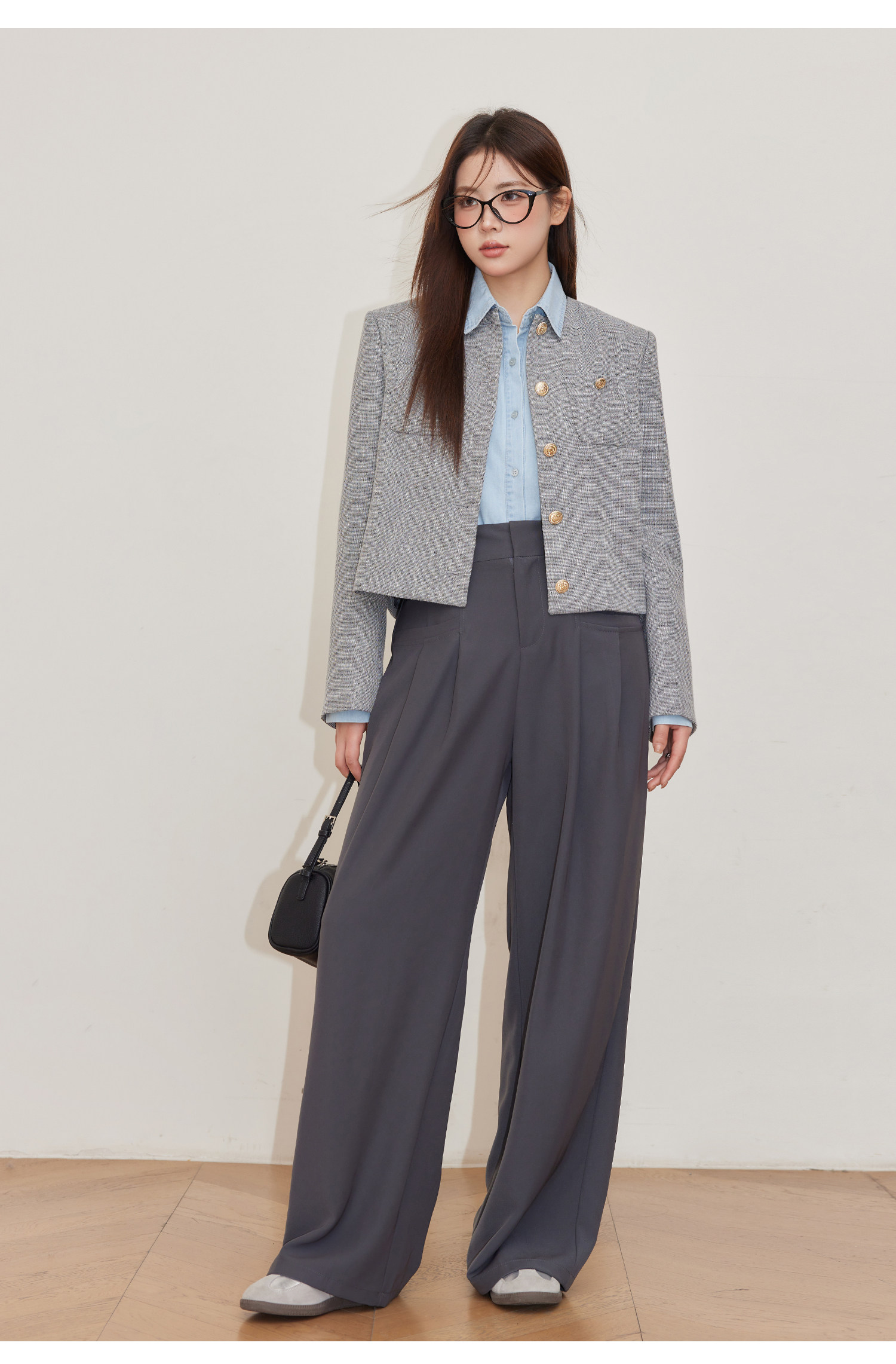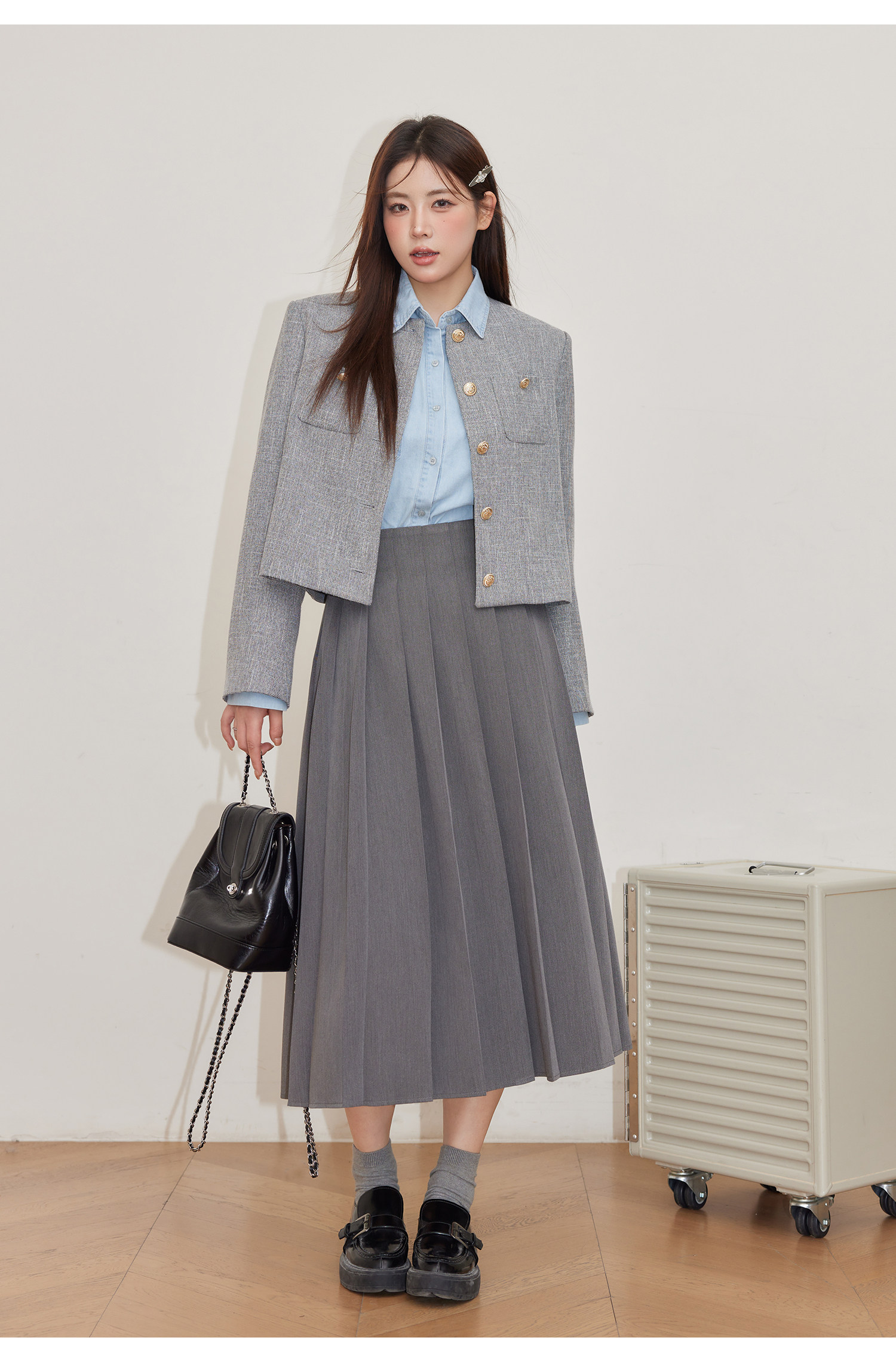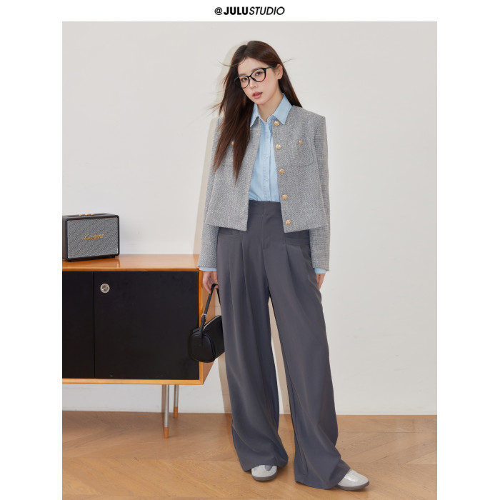 巨鹿工作室“珮斯畫廊”微胖mm無領西裝外套A字半裙牛仔襯衫套裝