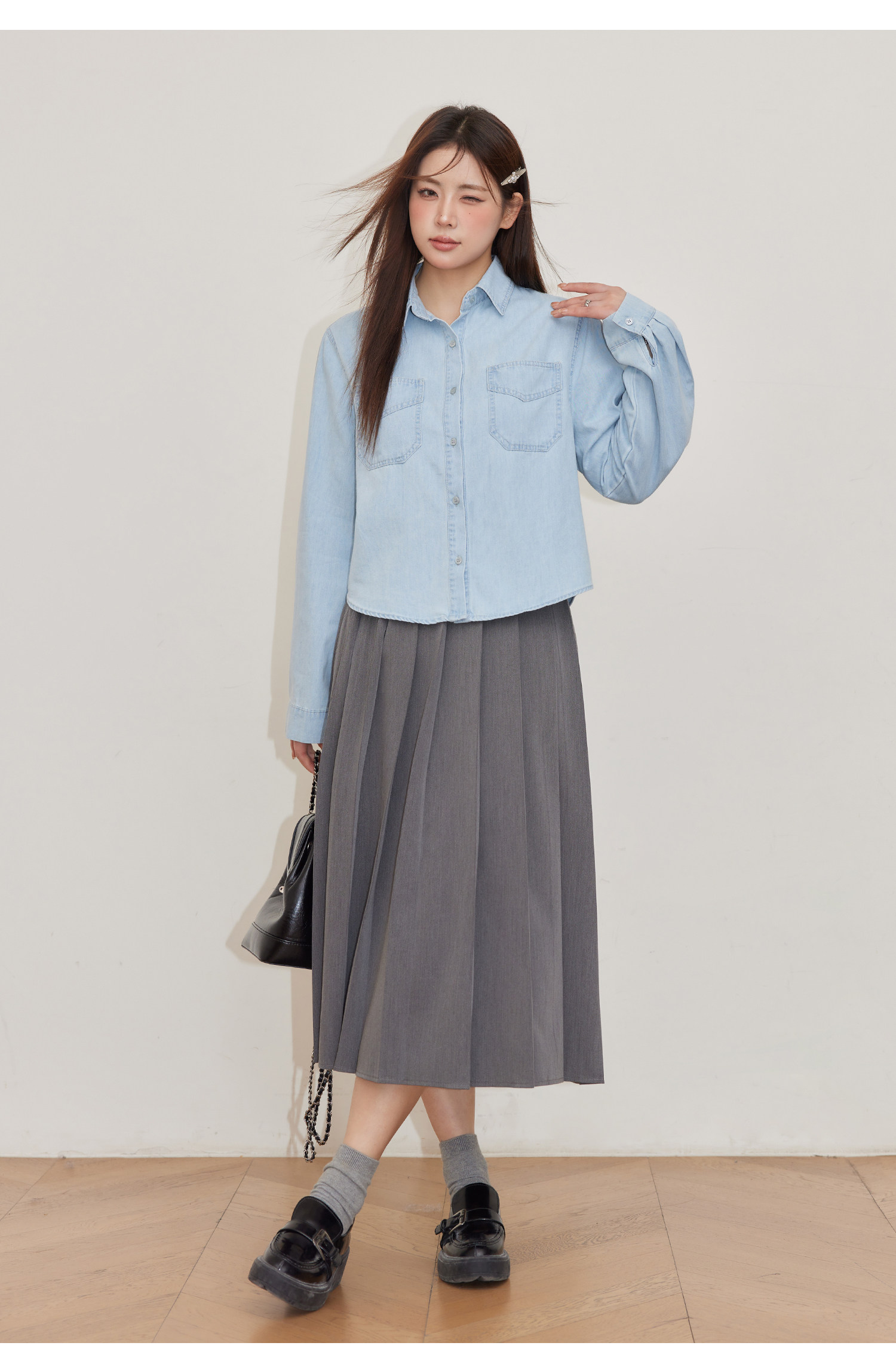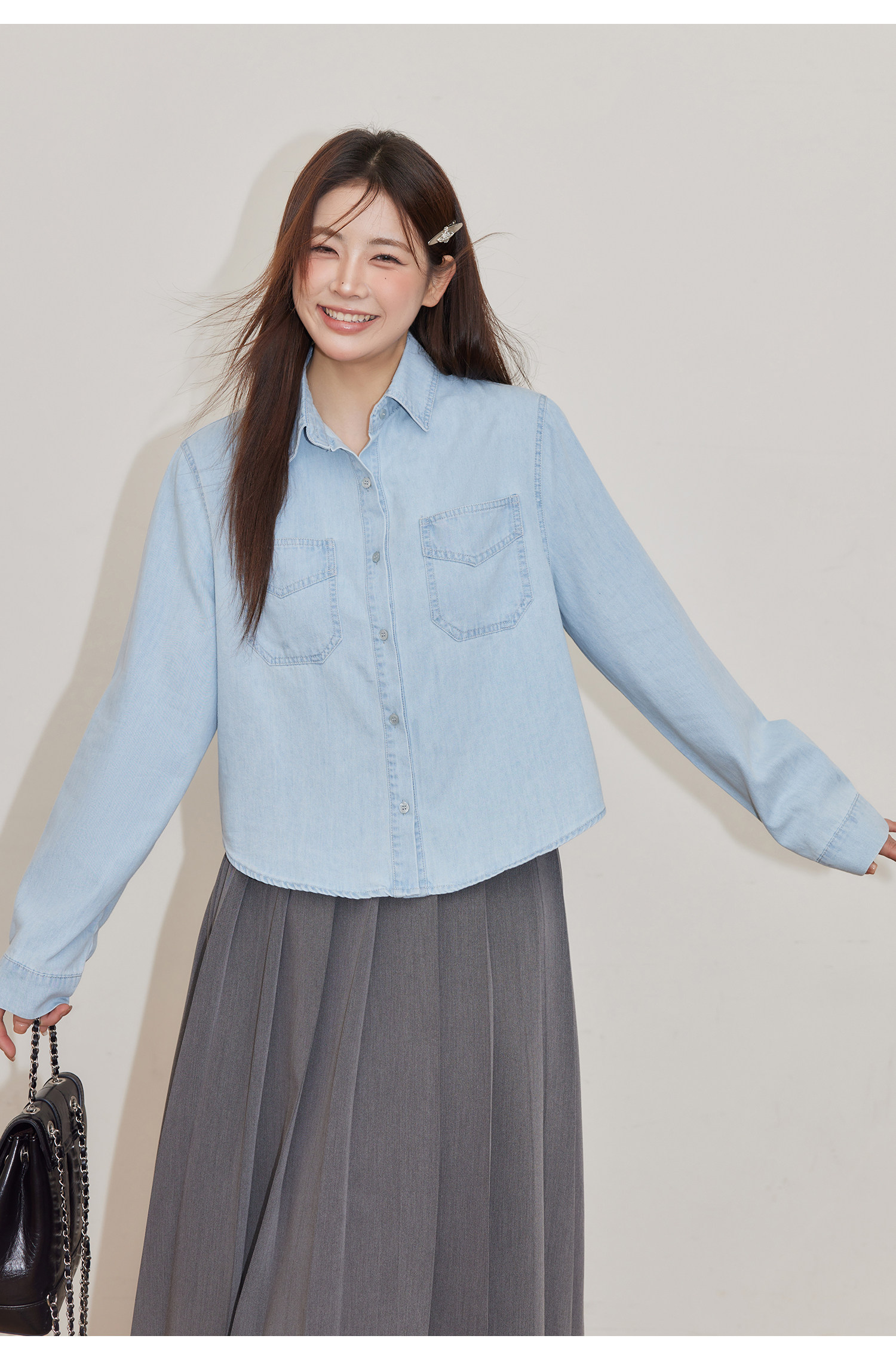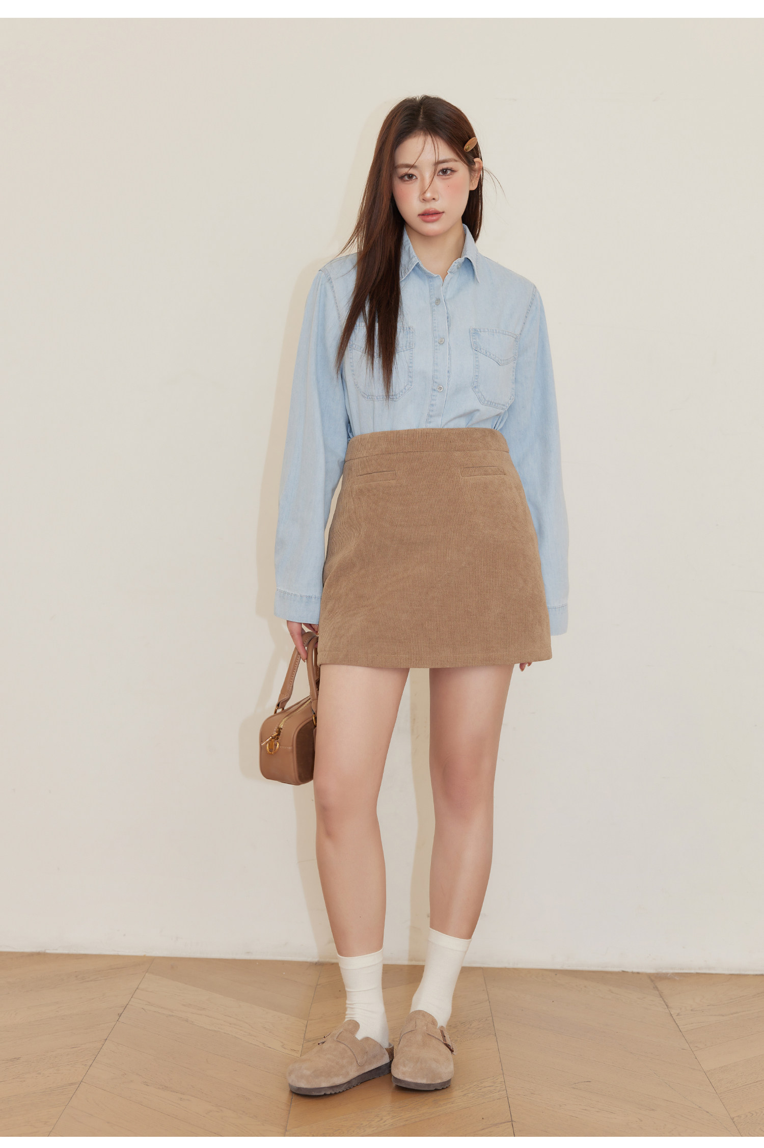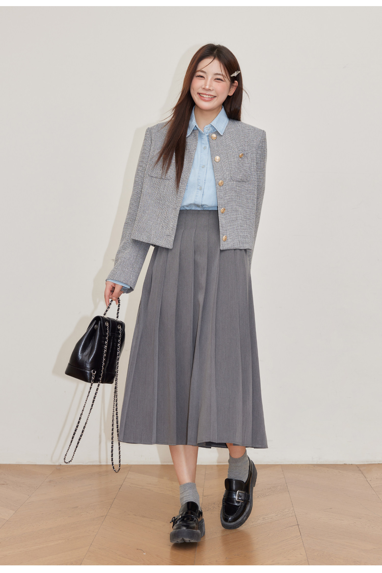 巨鹿工作室“珮斯畫廊”微胖mm無領西裝外套A字半裙牛仔襯衫套裝