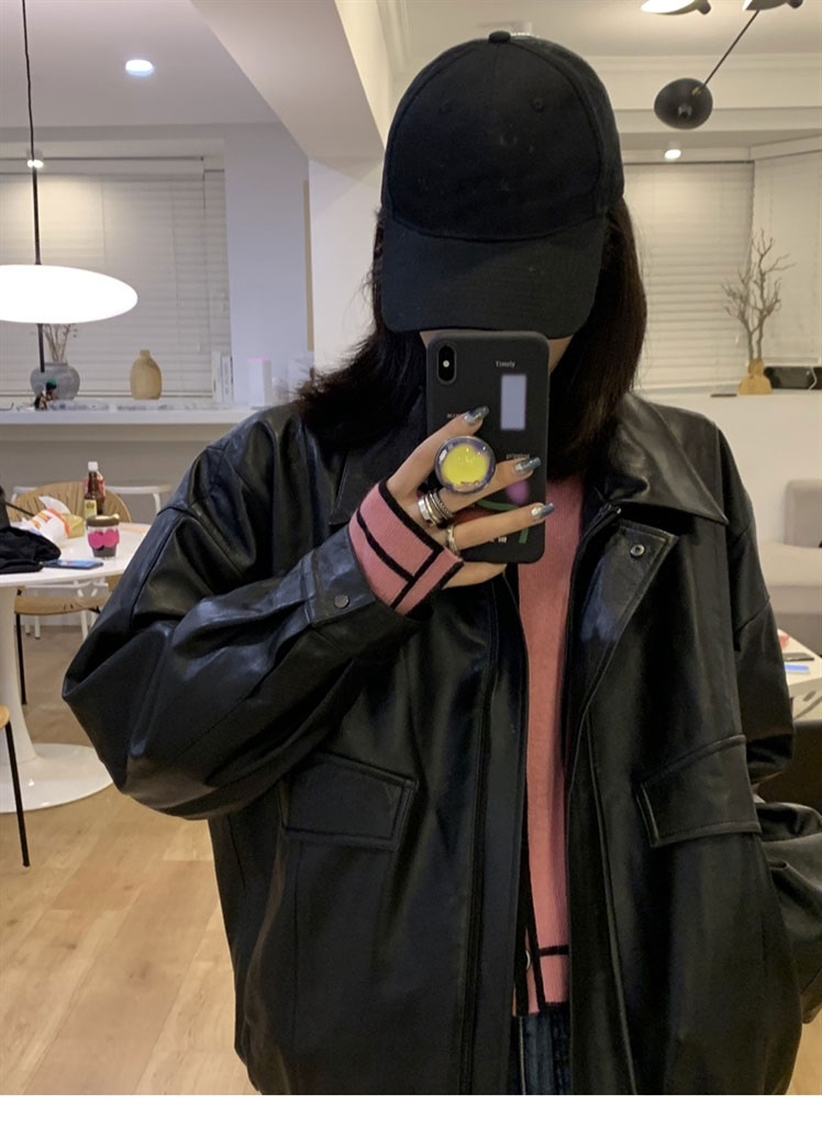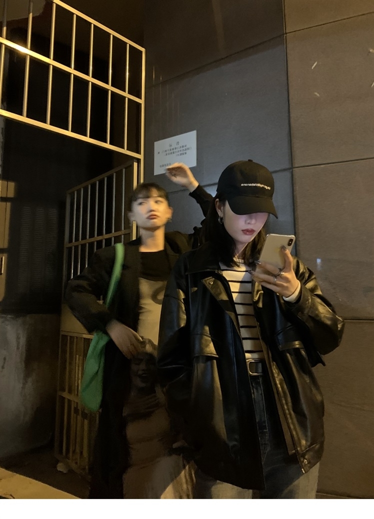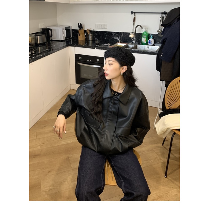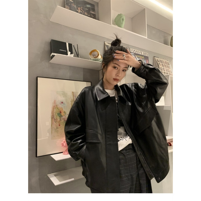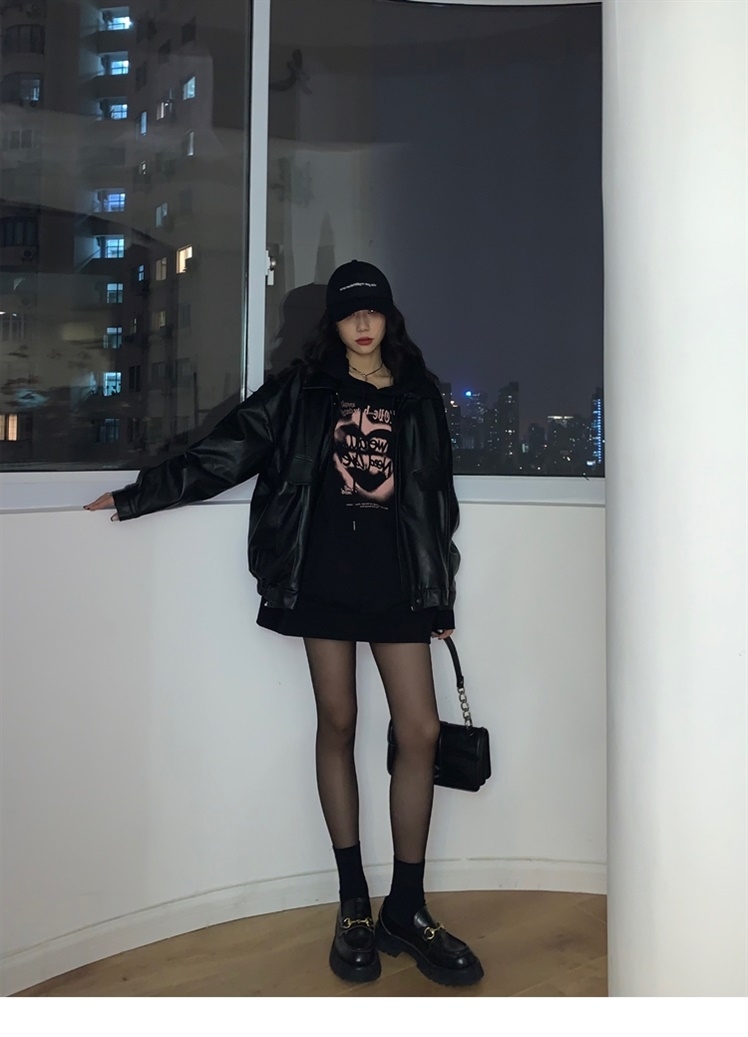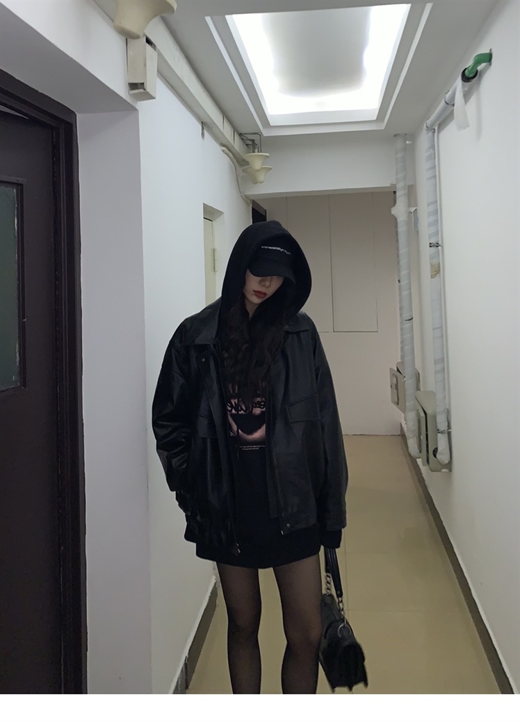 秋冬加絨港風復古休閒寬松廓形酷帥潮黑色拉鍊機車皮衣夾克外套女