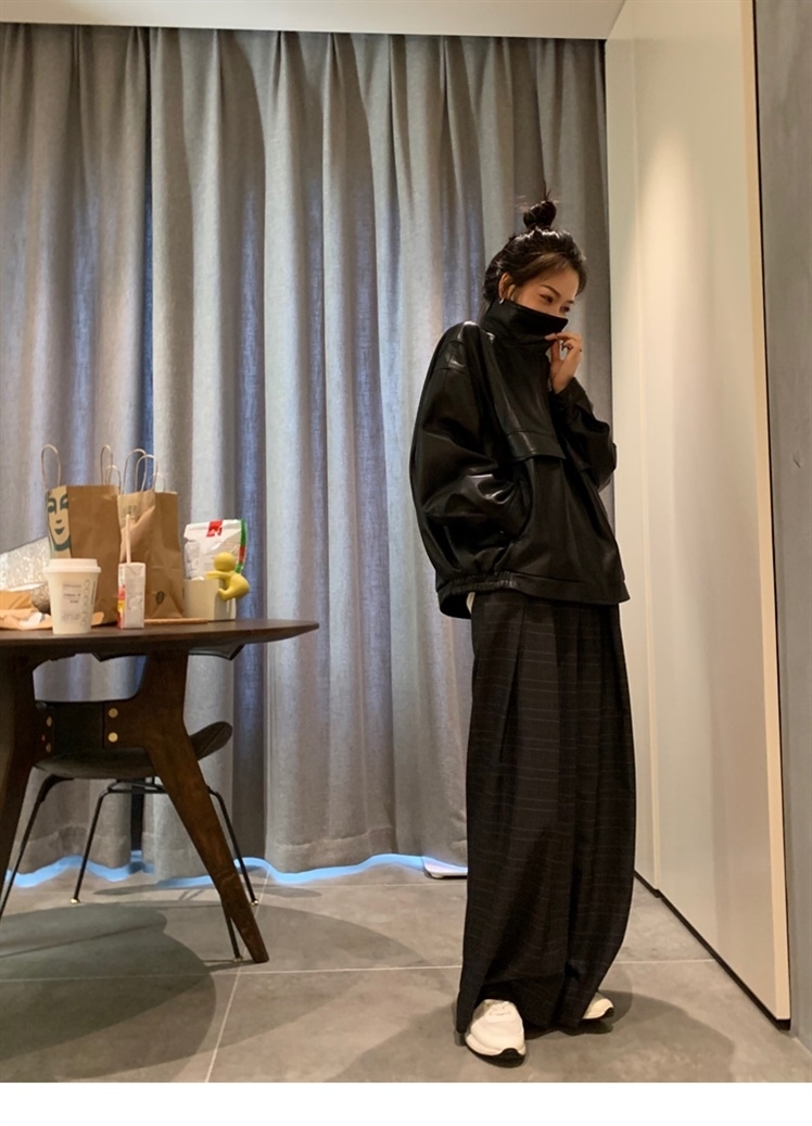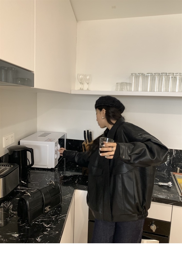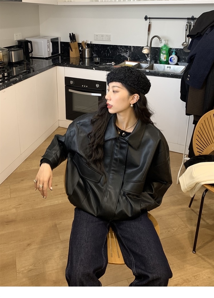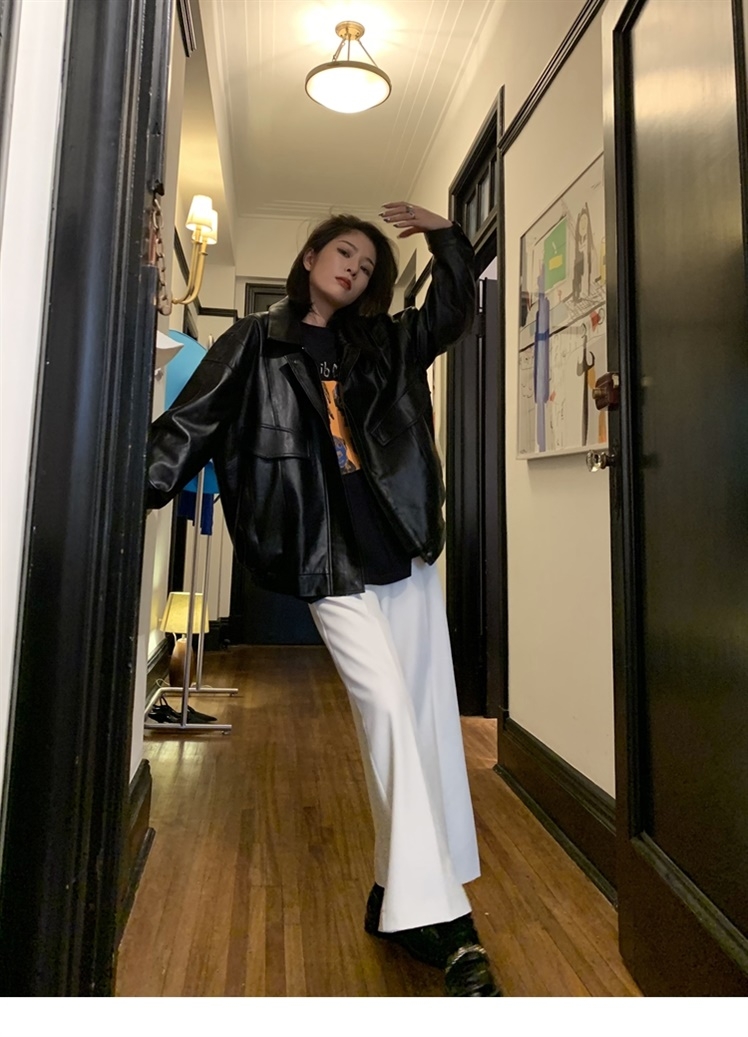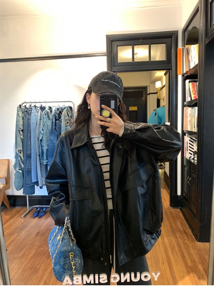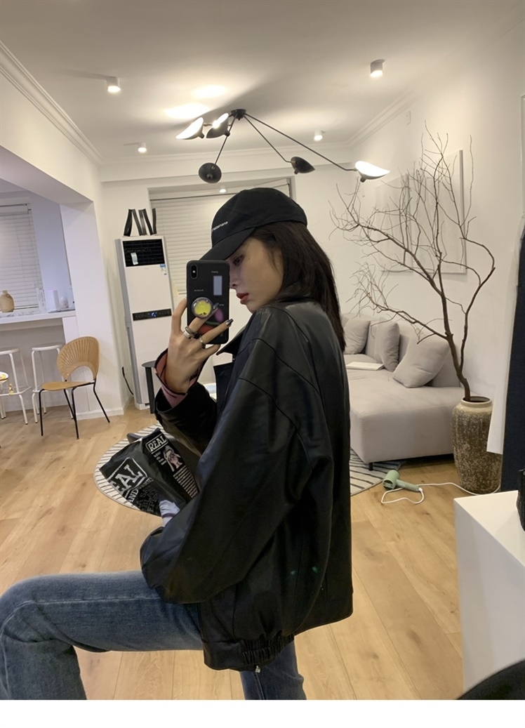 秋冬加絨港風復古休閒寬松廓形酷帥潮黑色拉鍊機車皮衣夾克外套女