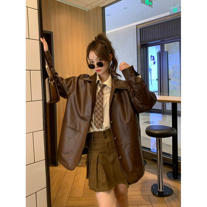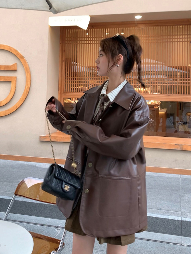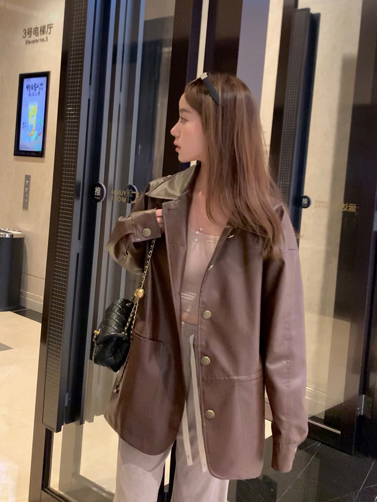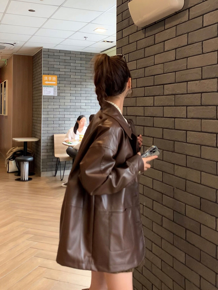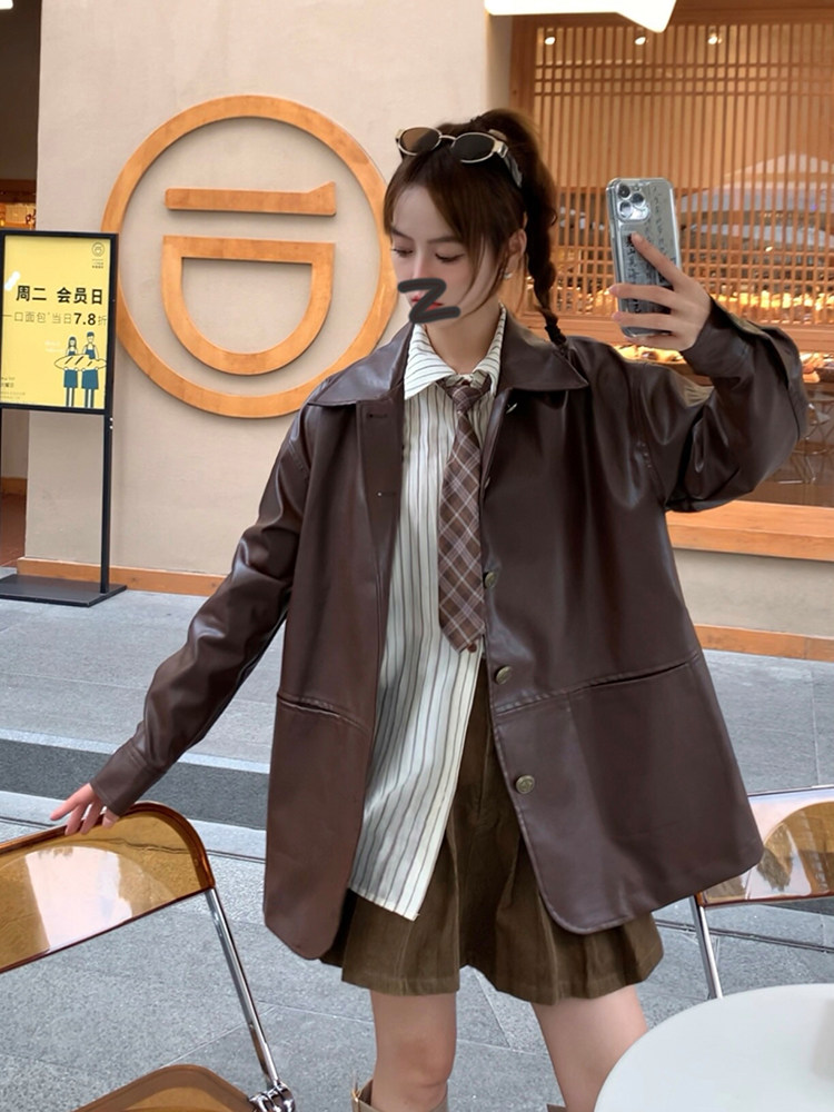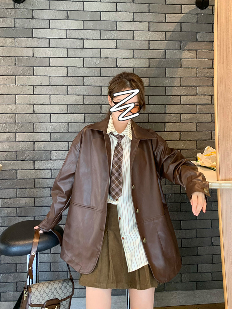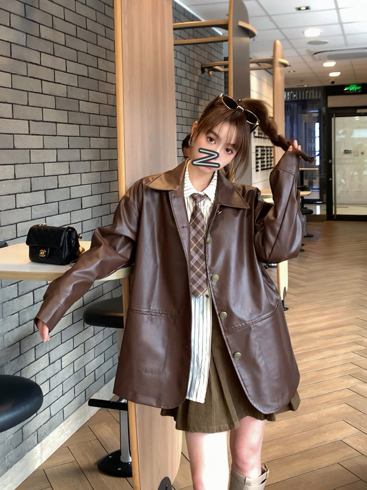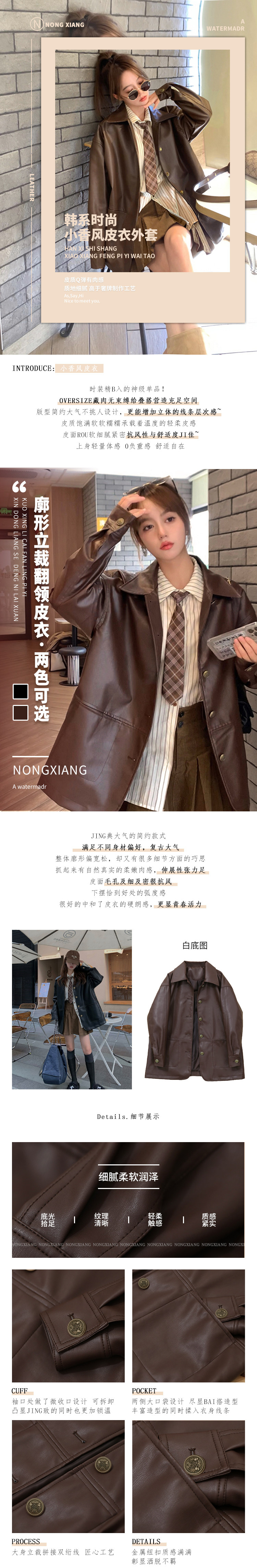 2025年春秋新款韓系時尚咖色寬鬆顯瘦小香風pu皮衣外套女棕色爆款