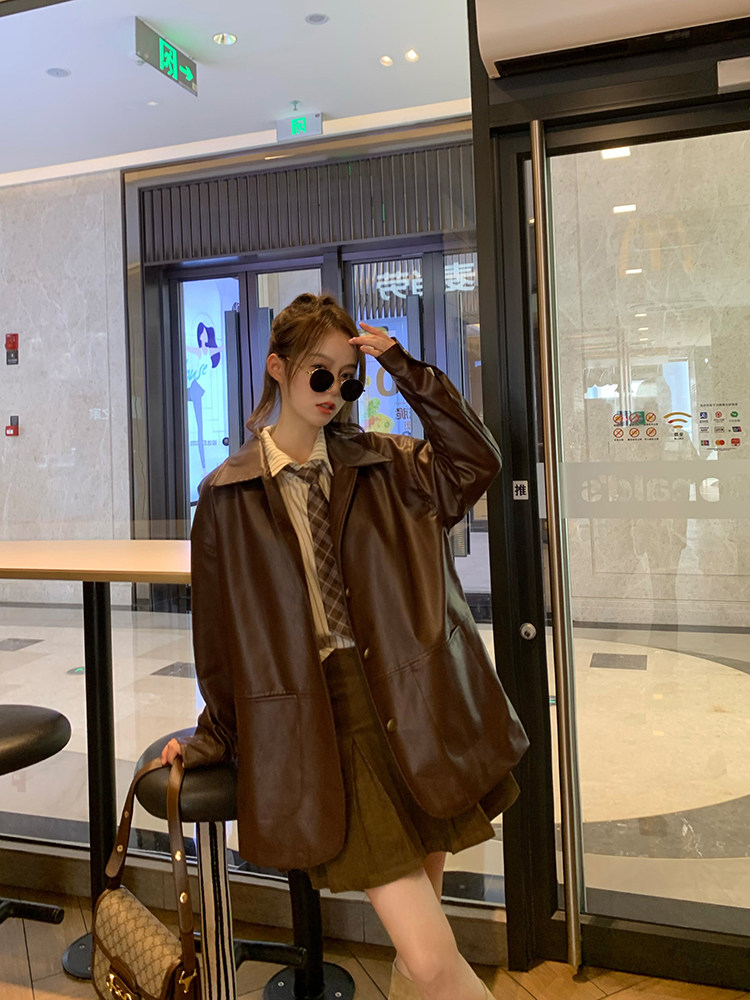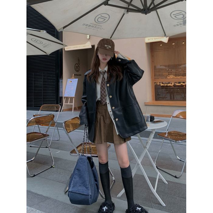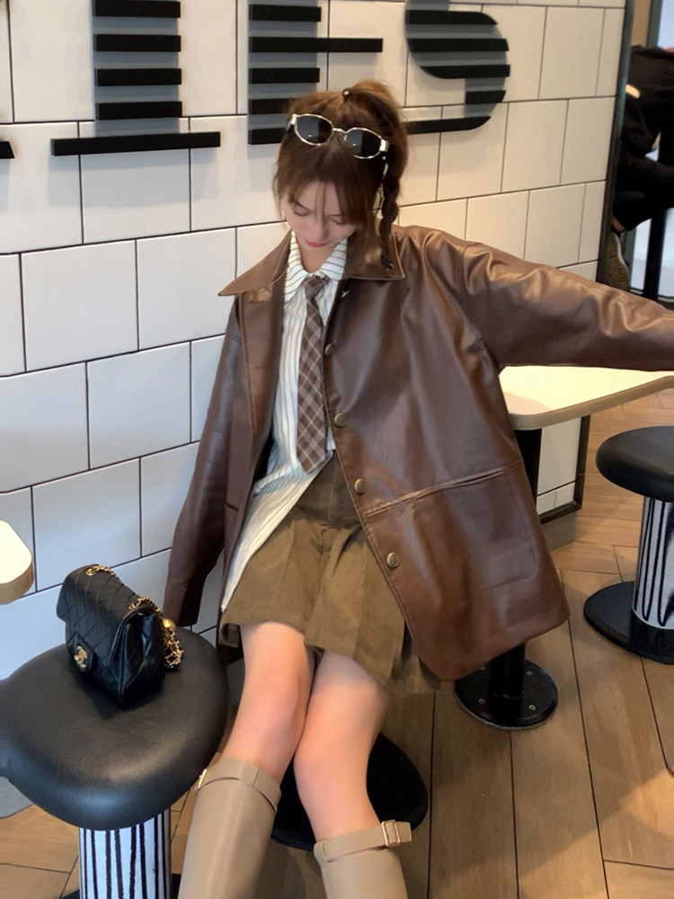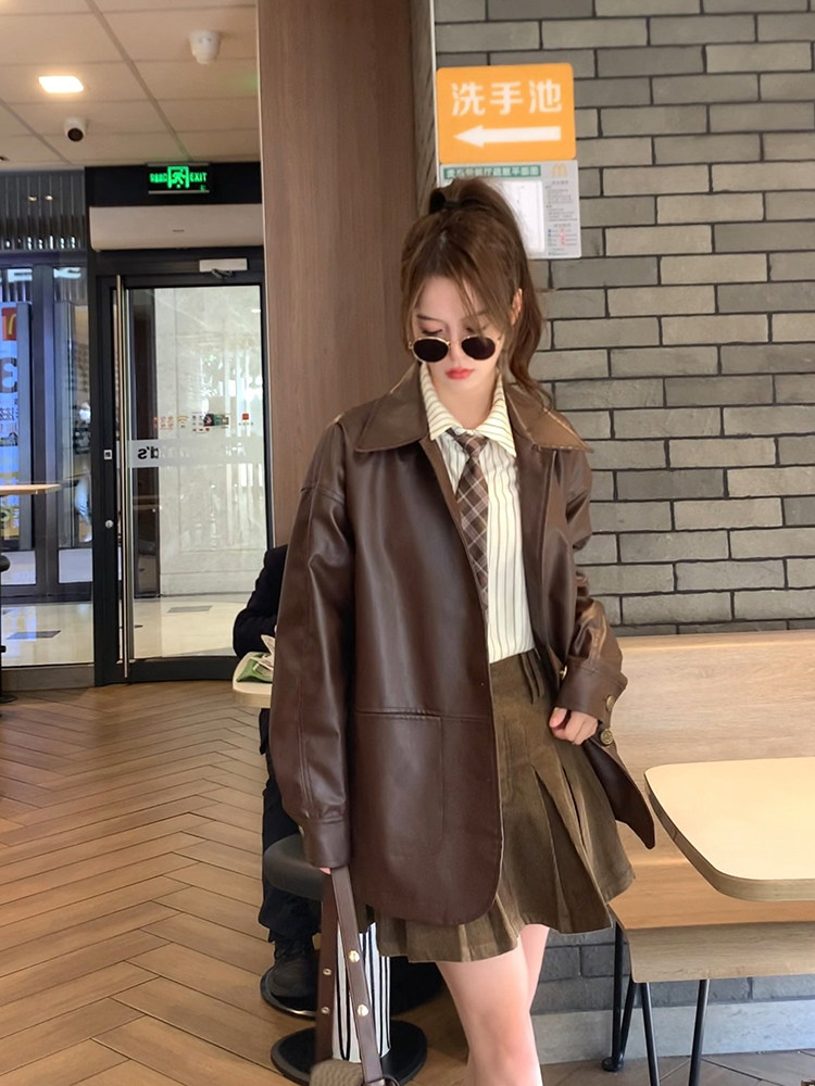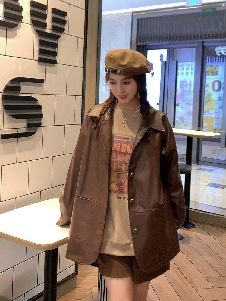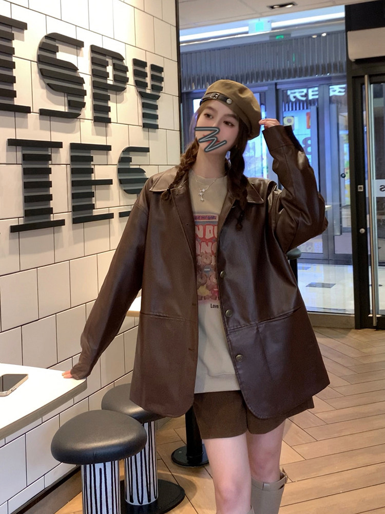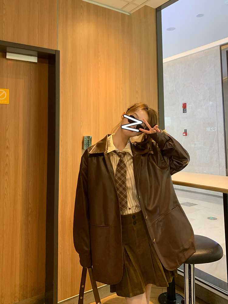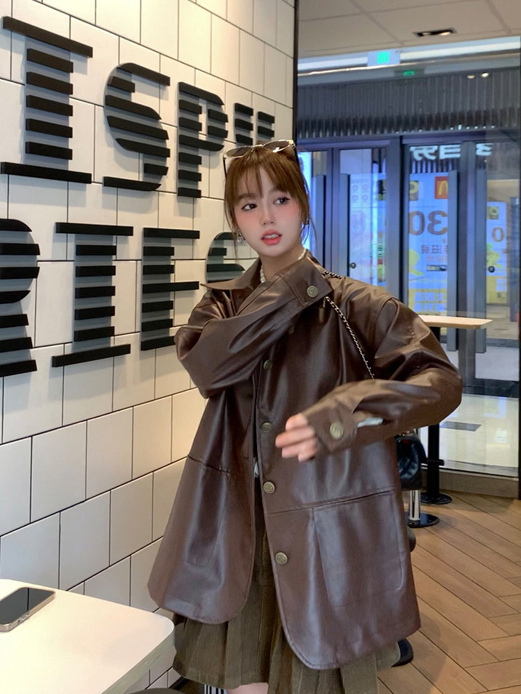 2025年春秋新款韓系時尚咖色寬鬆顯瘦小香風pu皮衣外套女棕色爆款