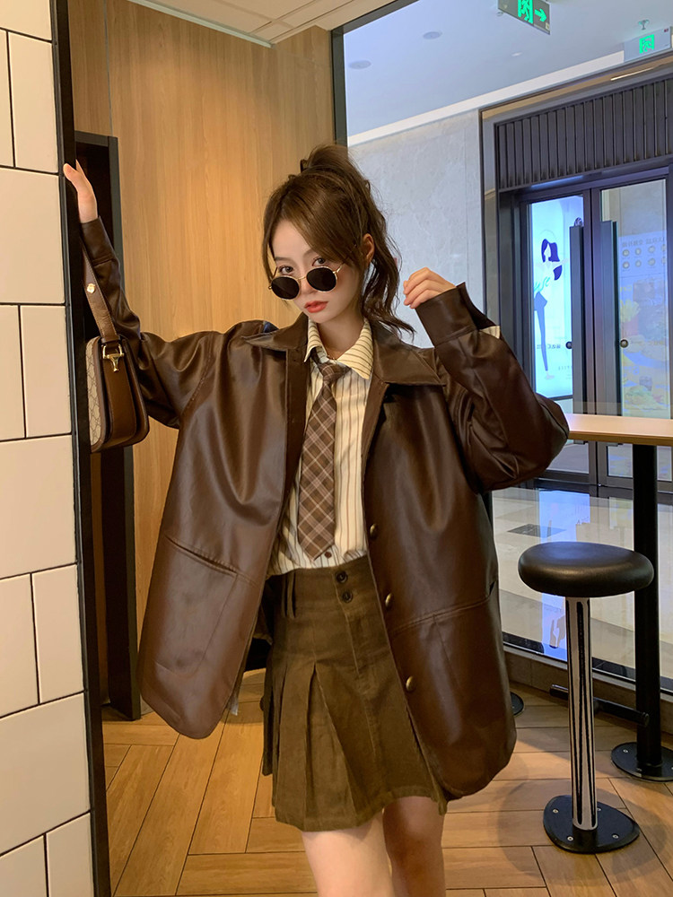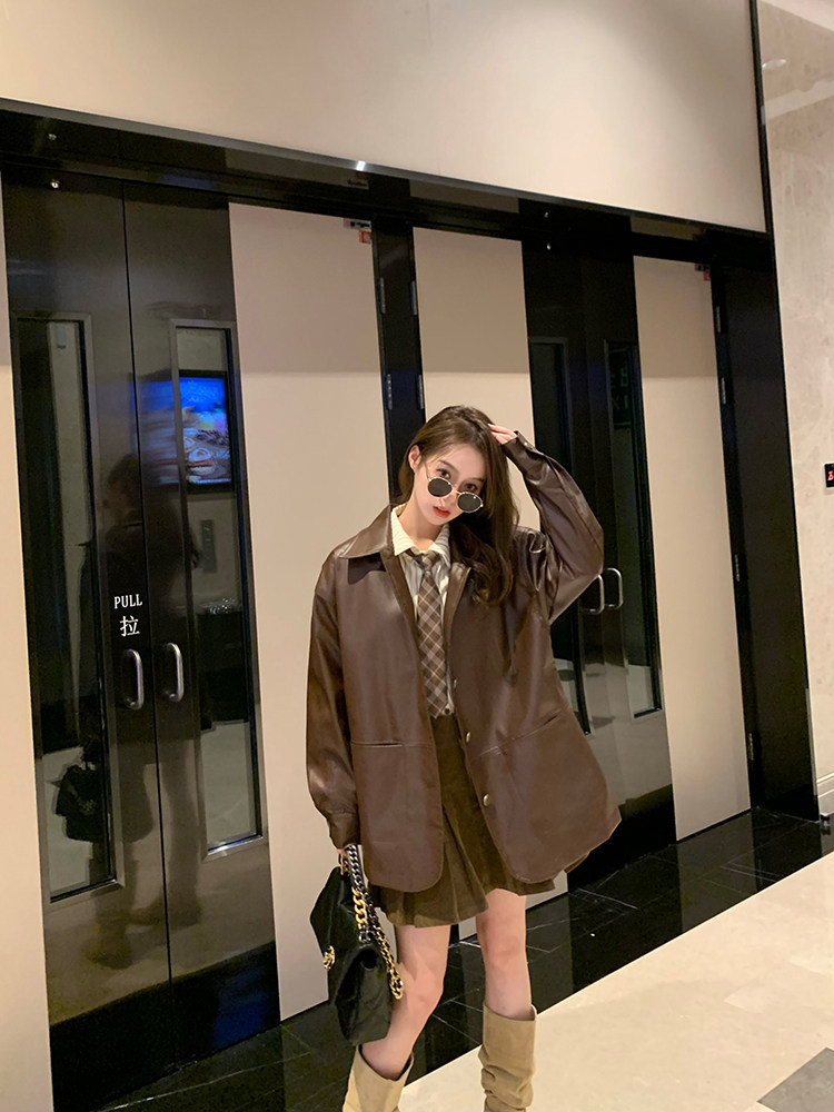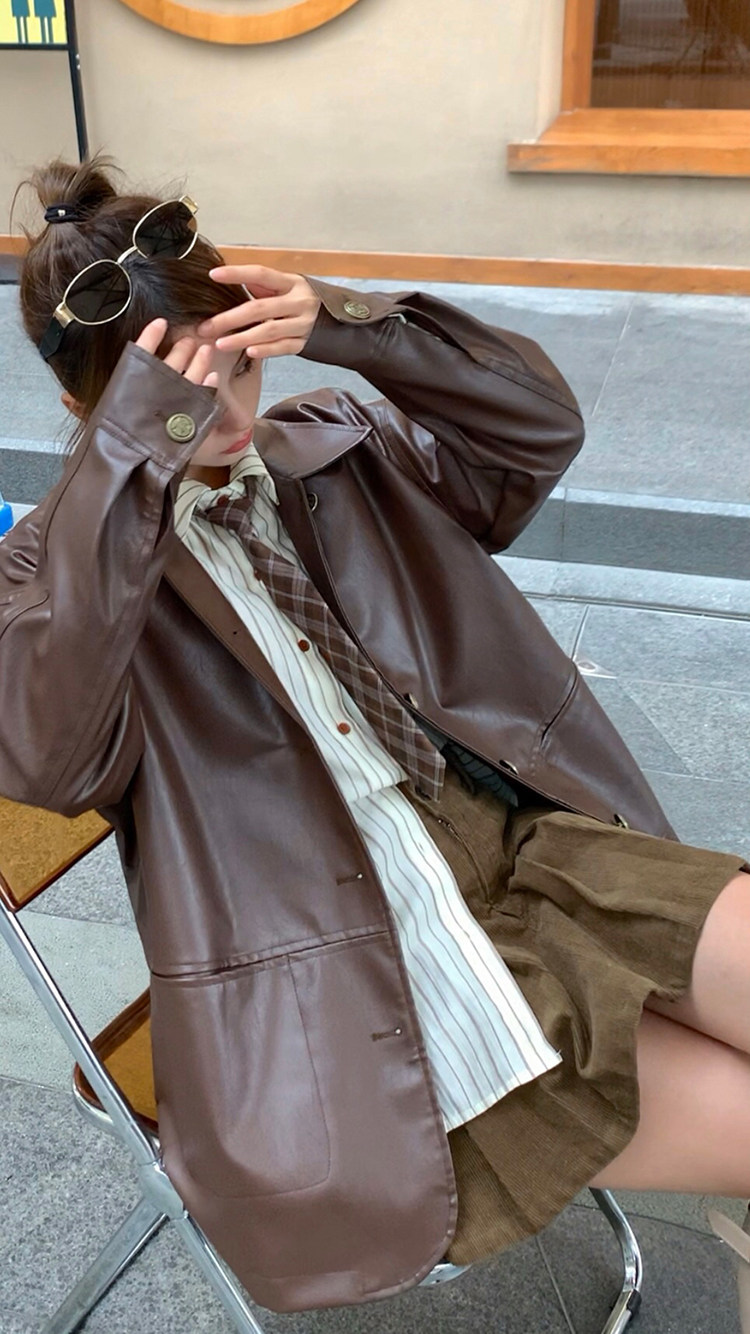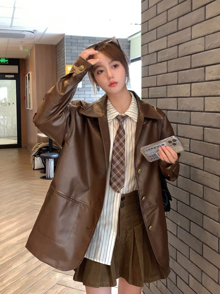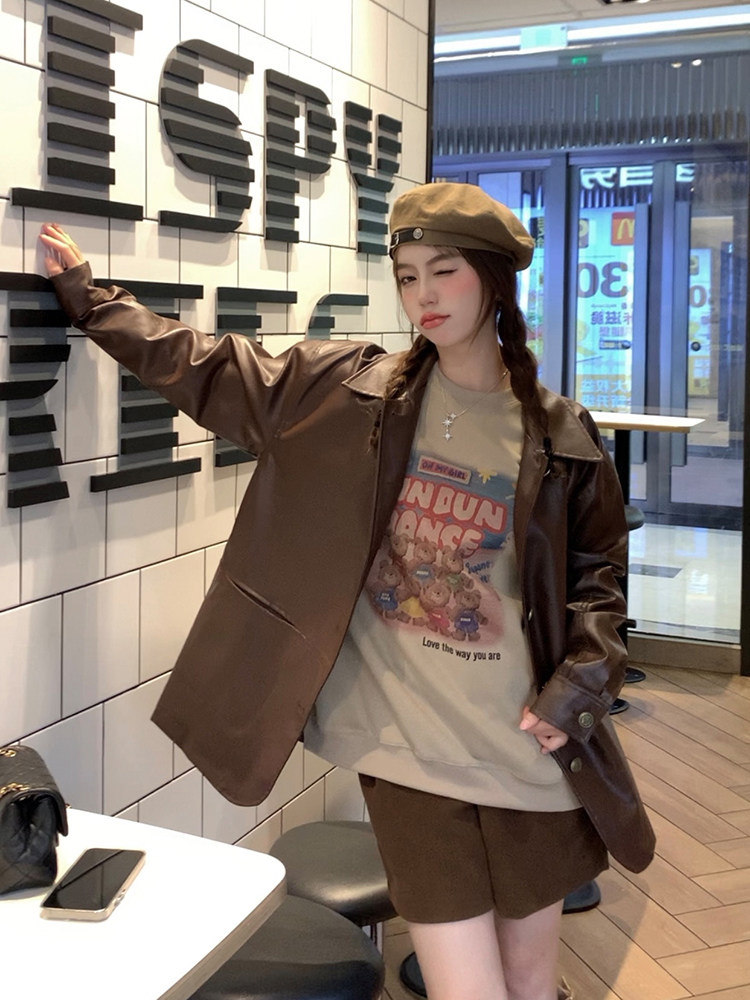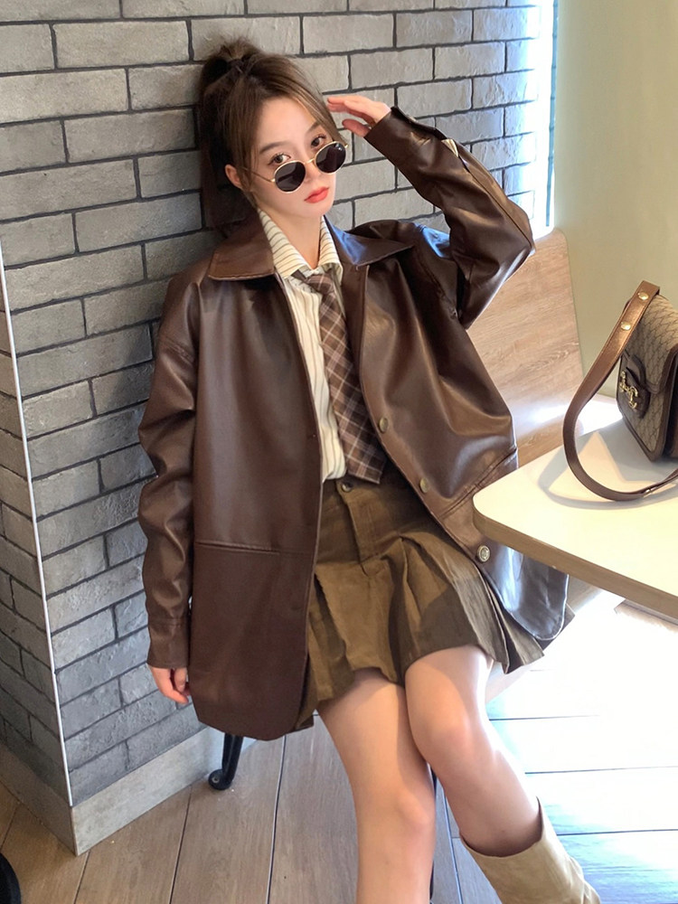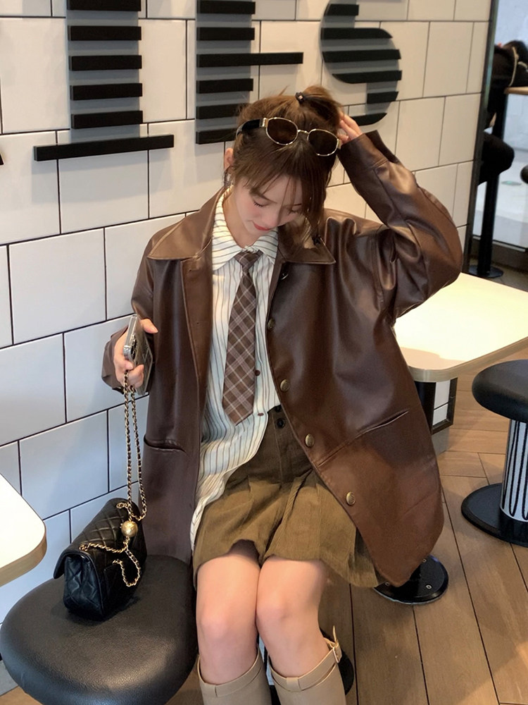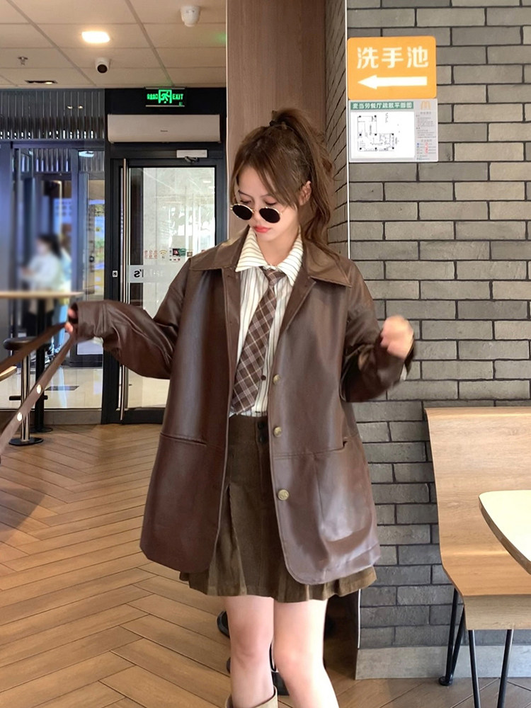 2025年春秋新款韓系時尚咖色寬鬆顯瘦小香風pu皮衣外套女棕色爆款