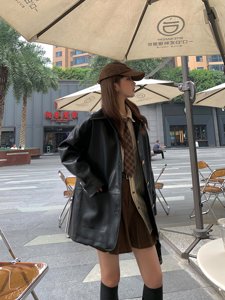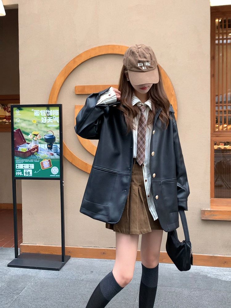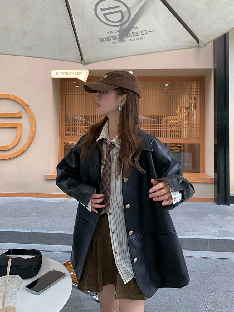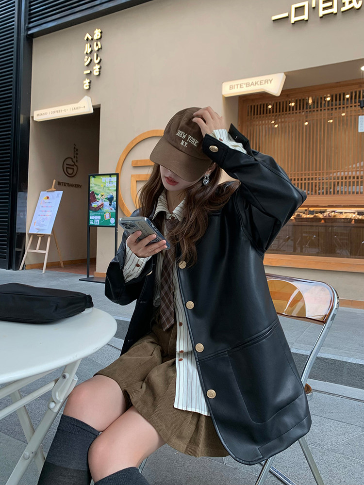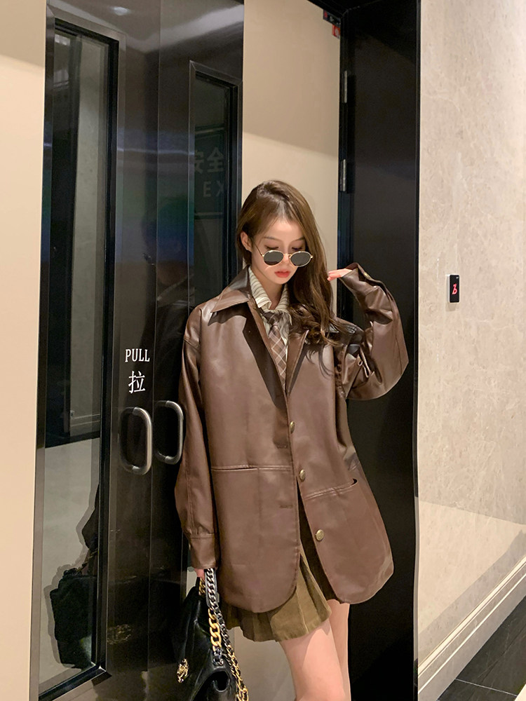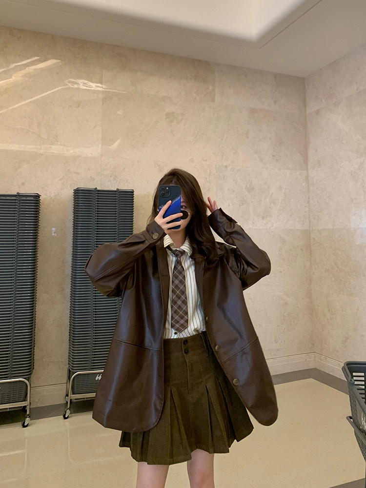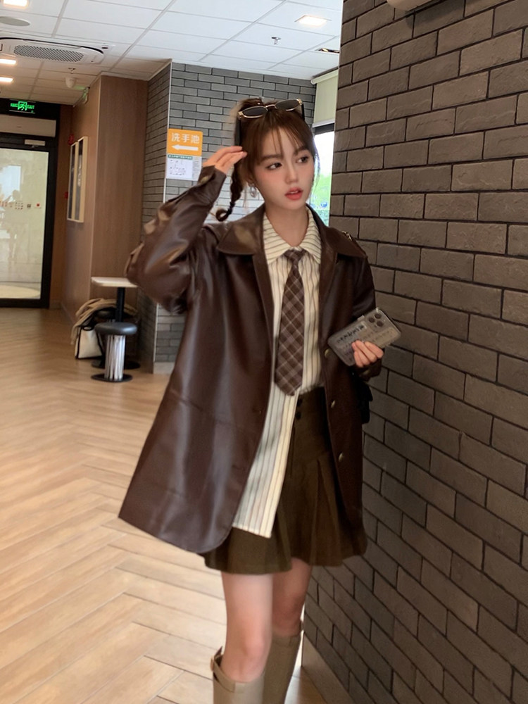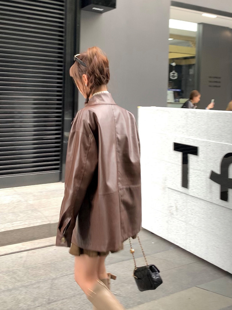 2025年春秋新款韓系時尚咖色寬鬆顯瘦小香風pu皮衣外套女棕色爆款