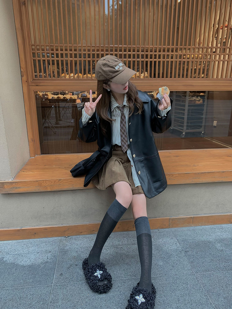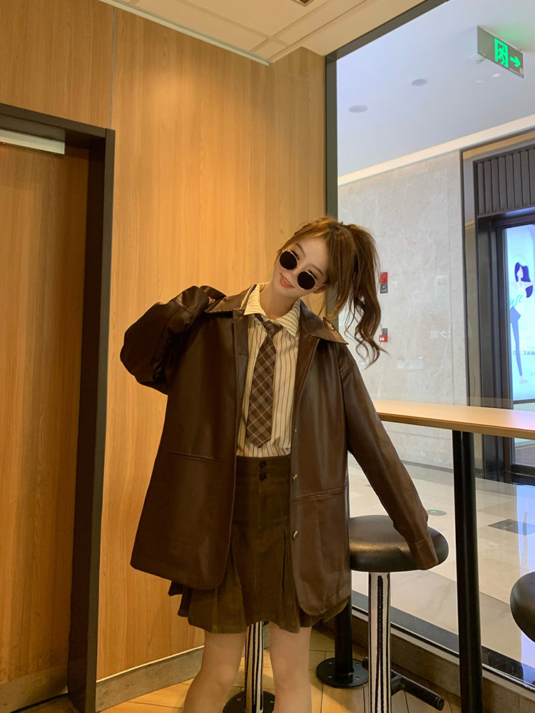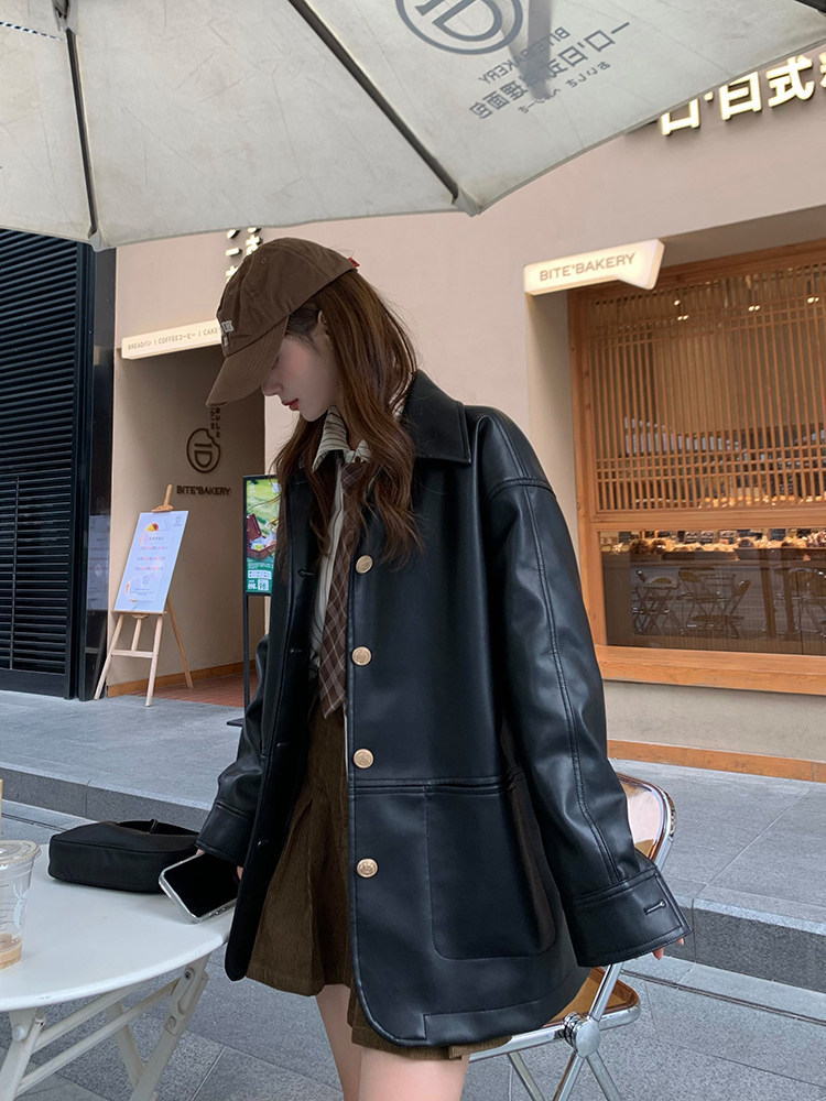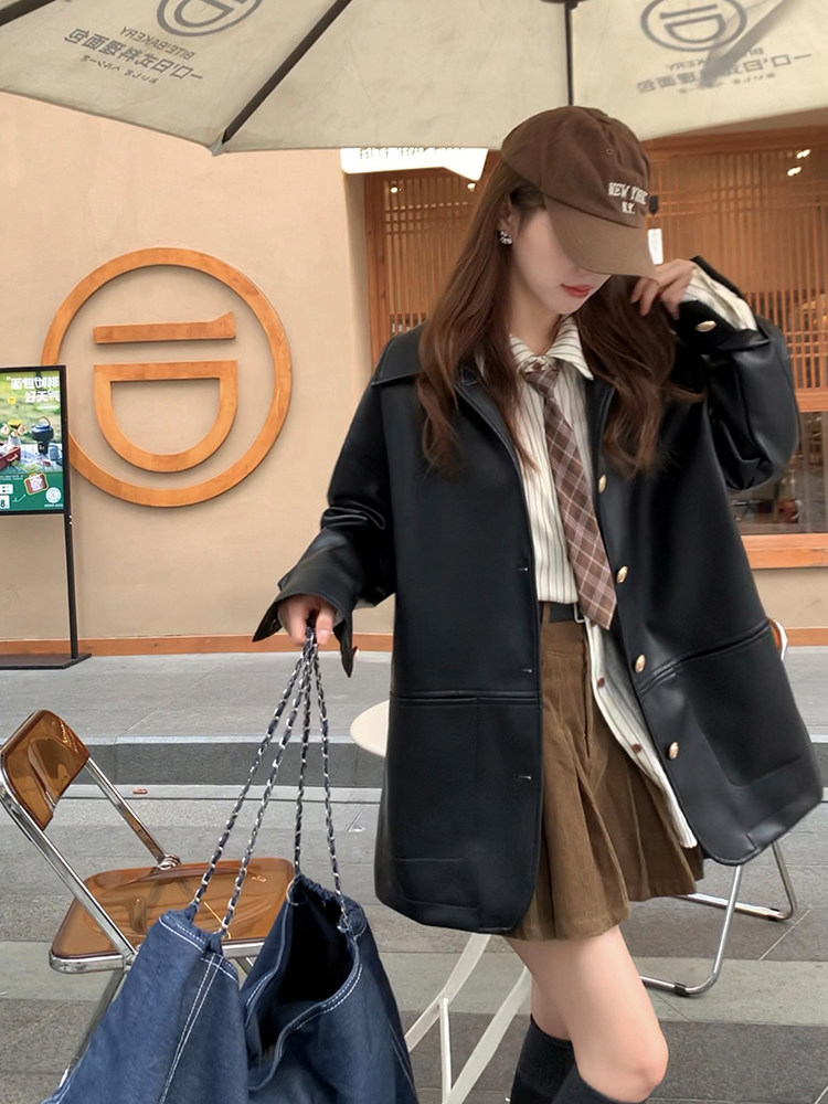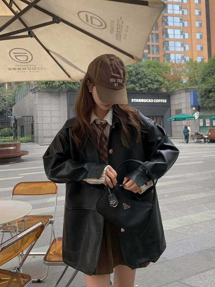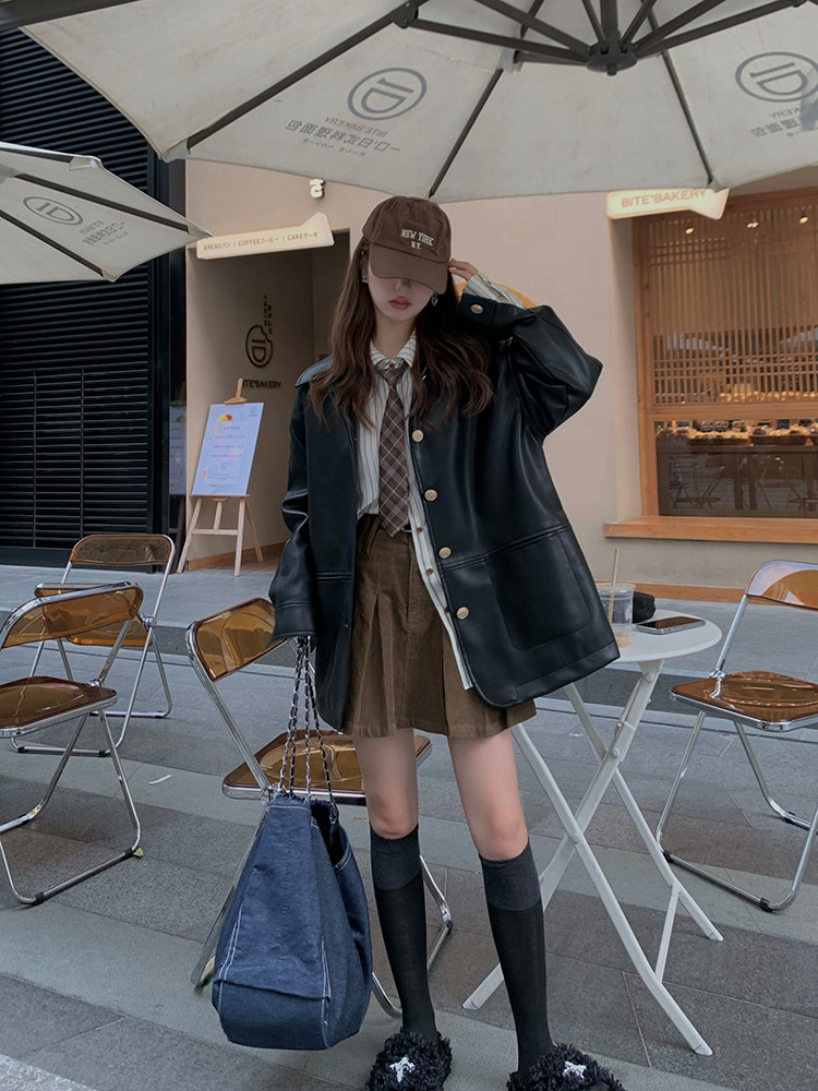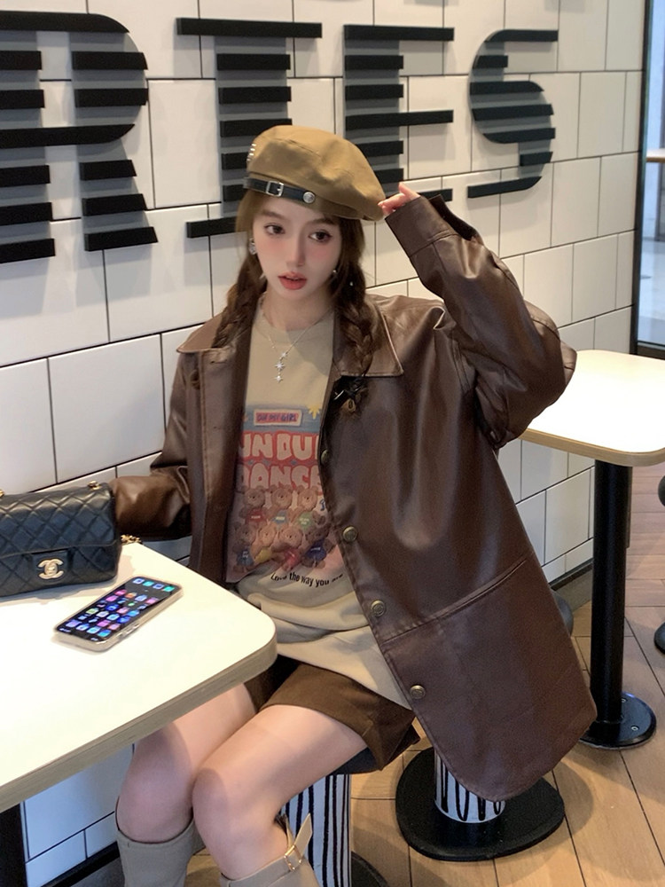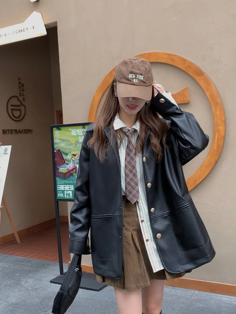 2025年春秋新款韓系時尚咖色寬鬆顯瘦小香風pu皮衣外套女棕色爆款