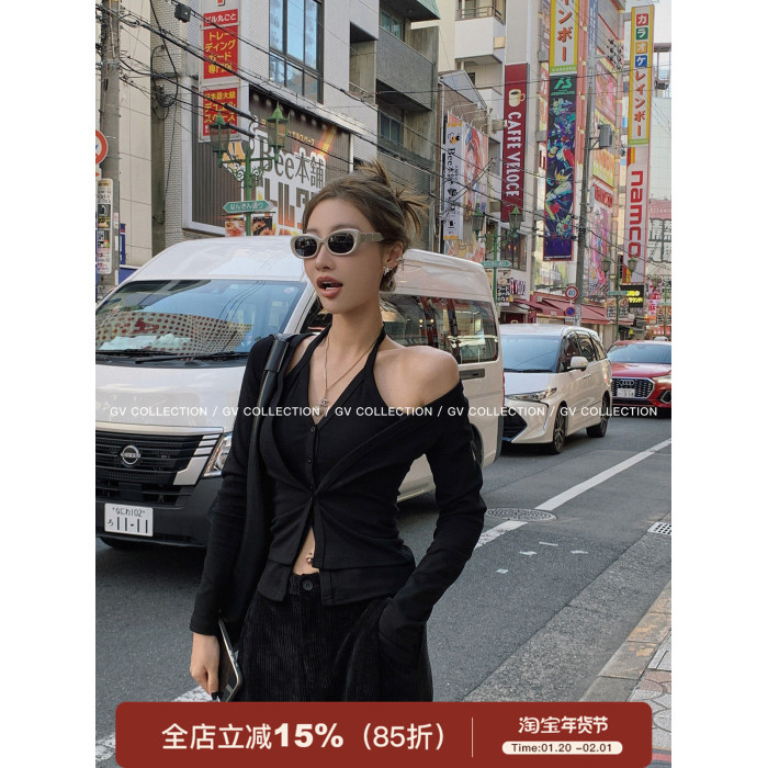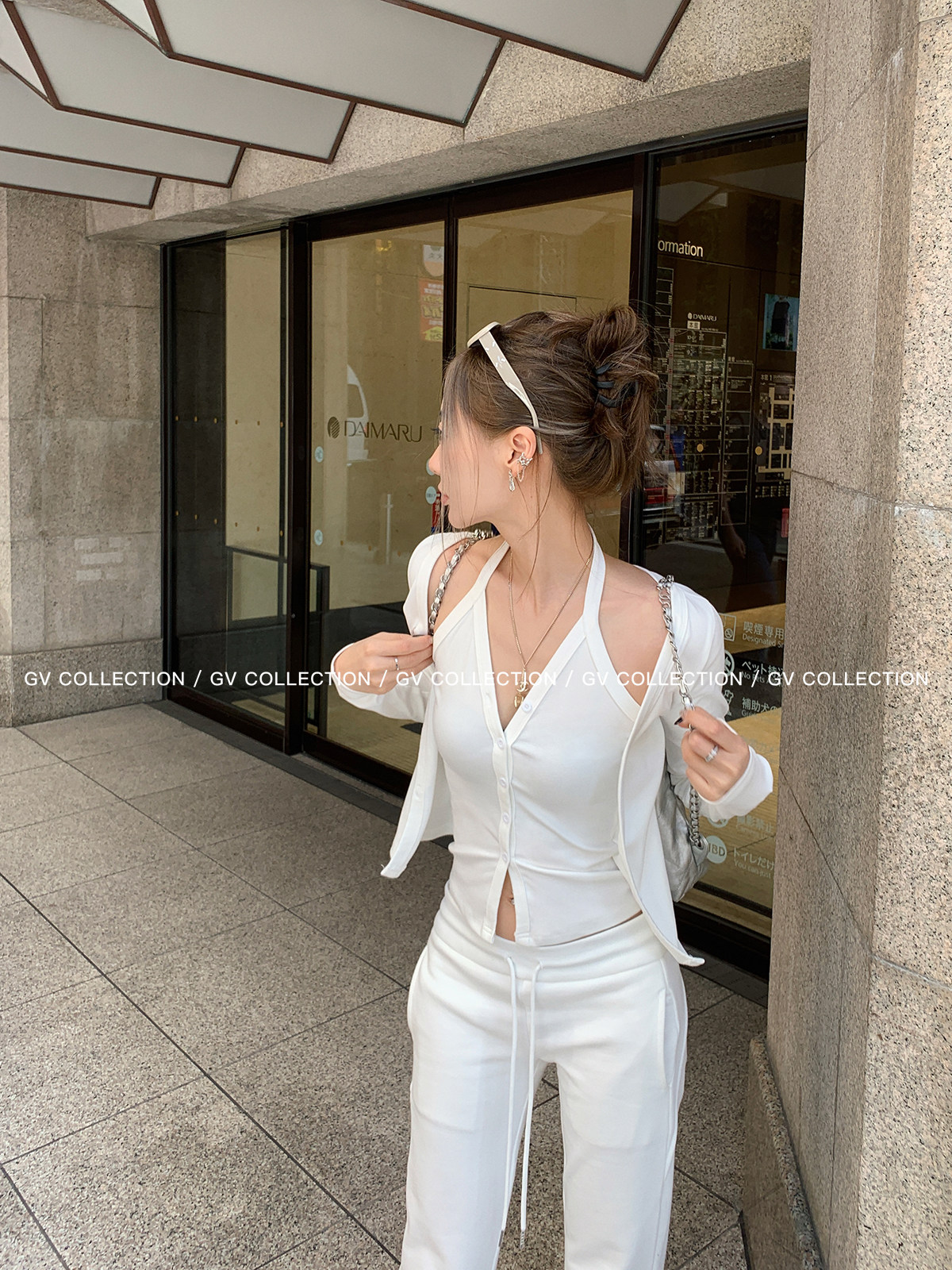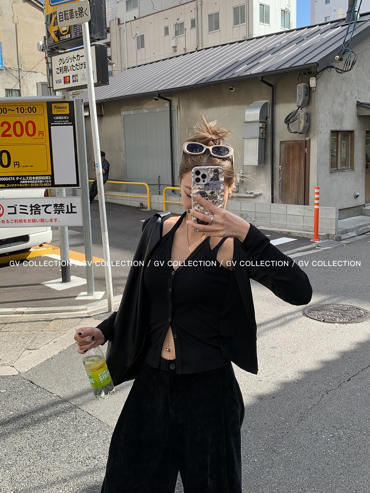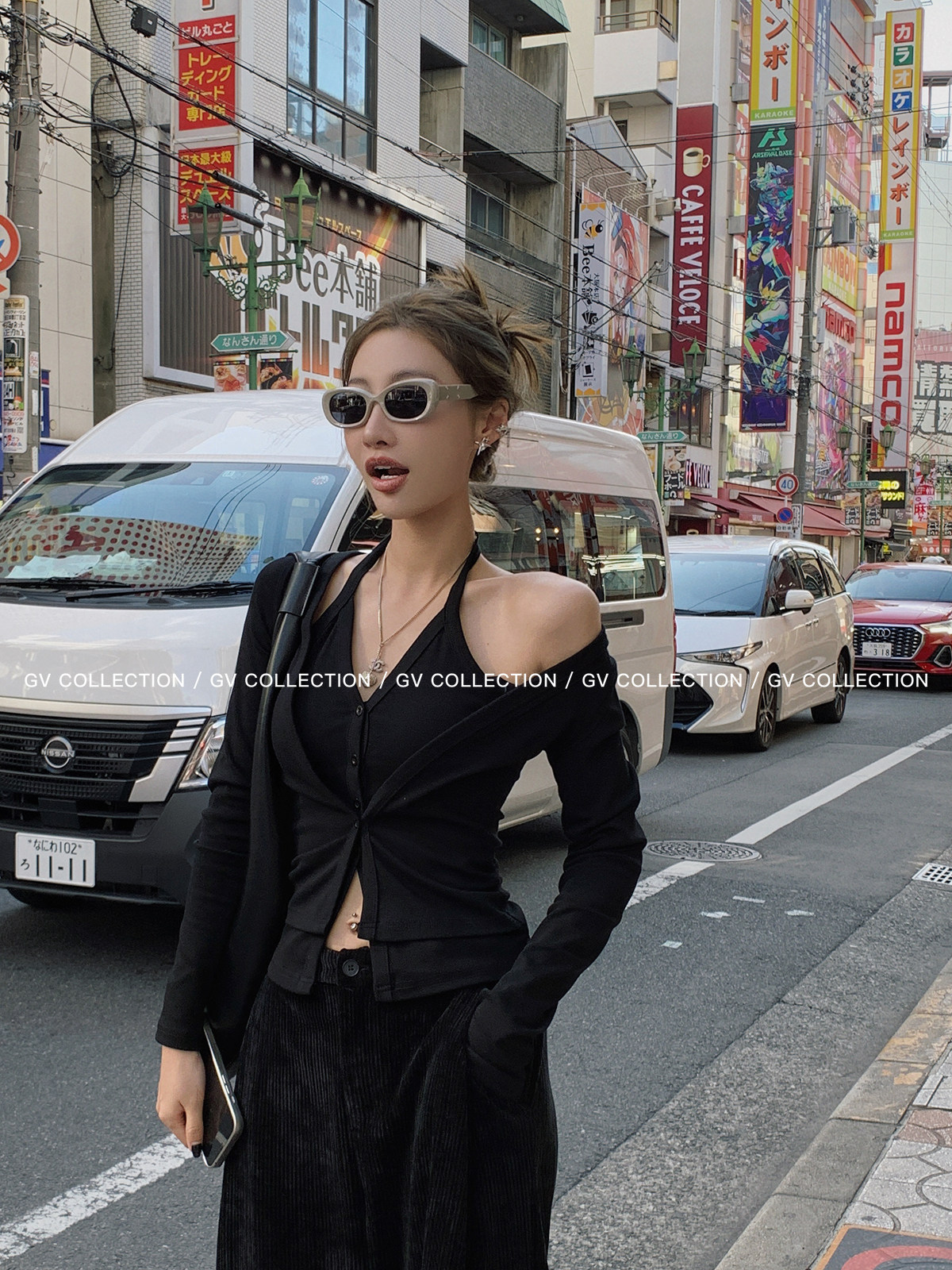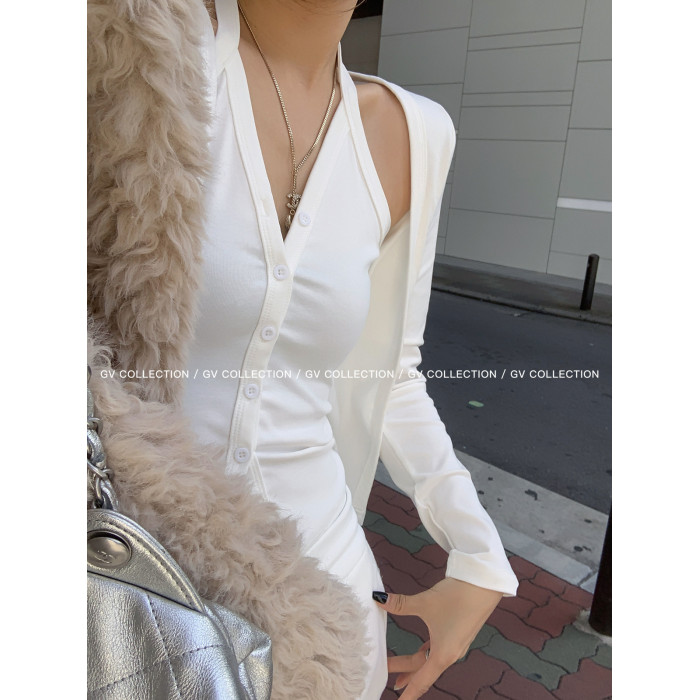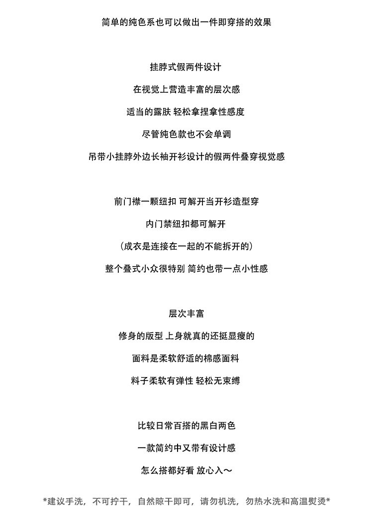 GV大白哥 Bi入!簡約心機 假兩件吊帶掛脖上衣性感小衆修身開衫女