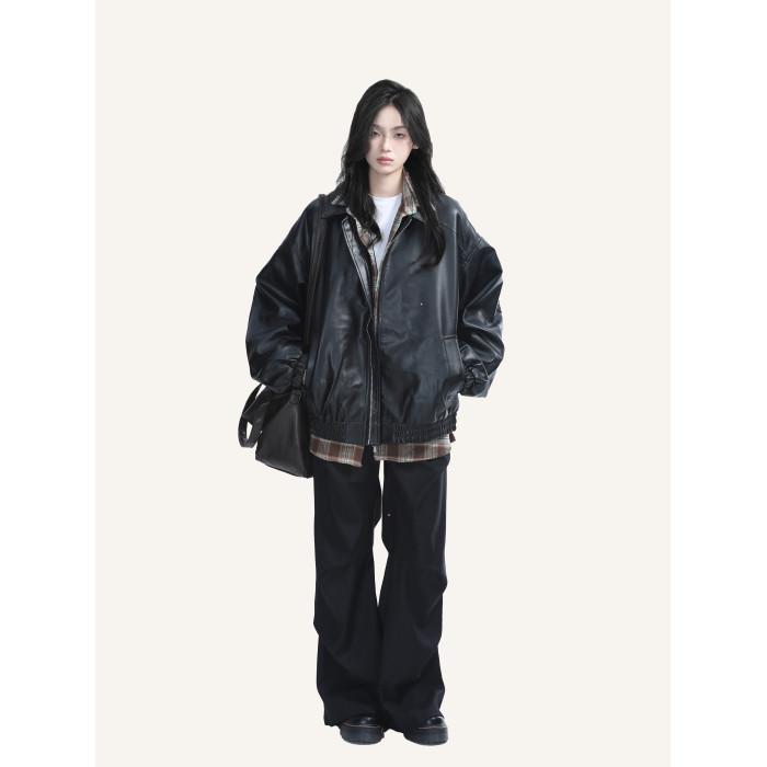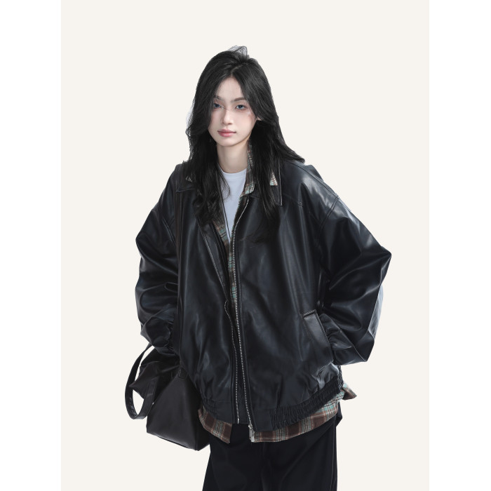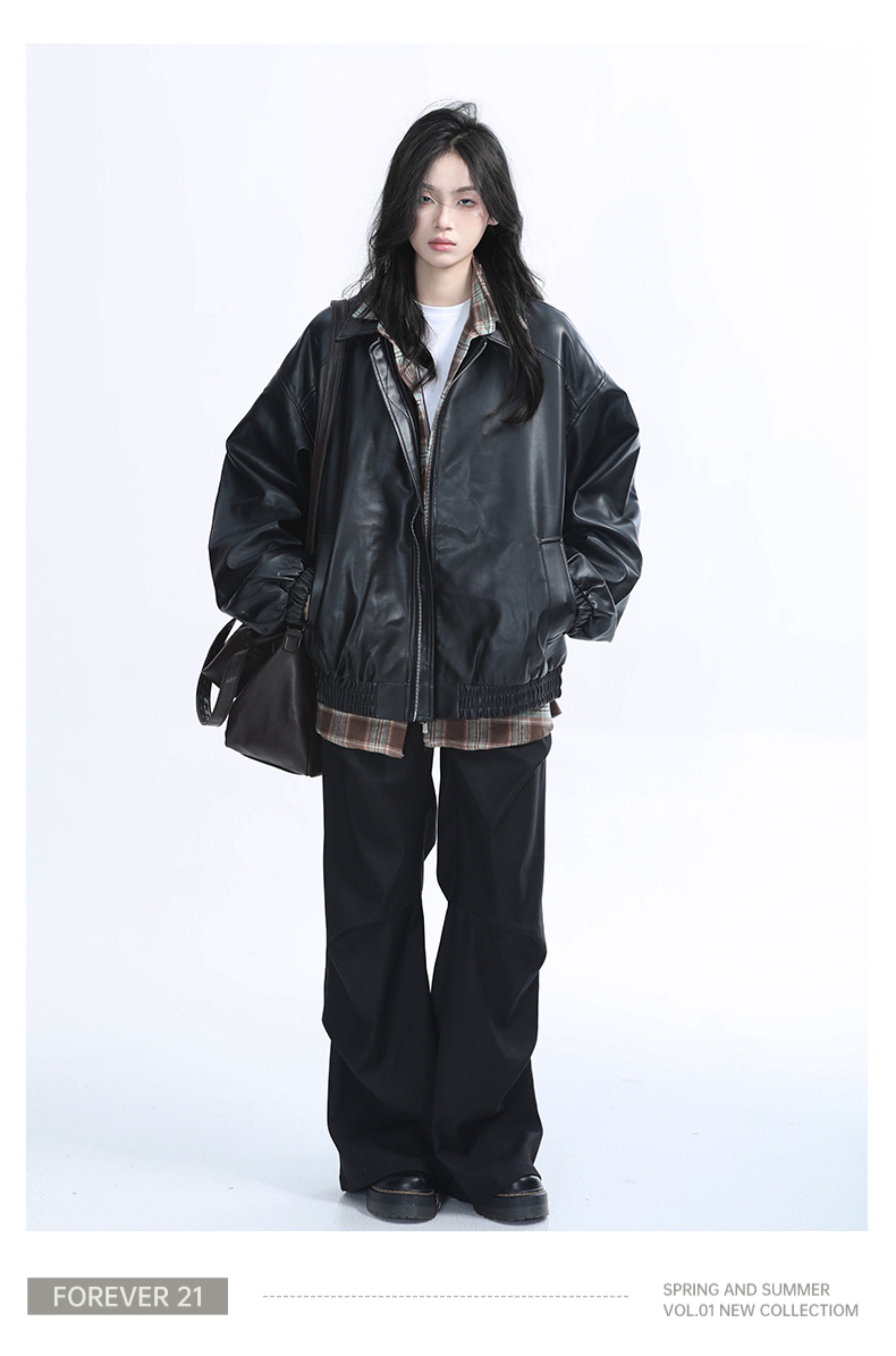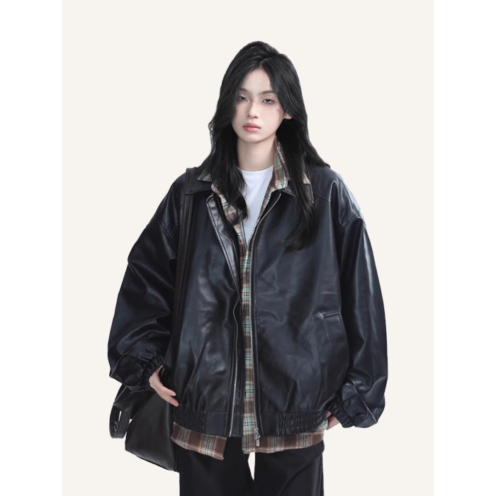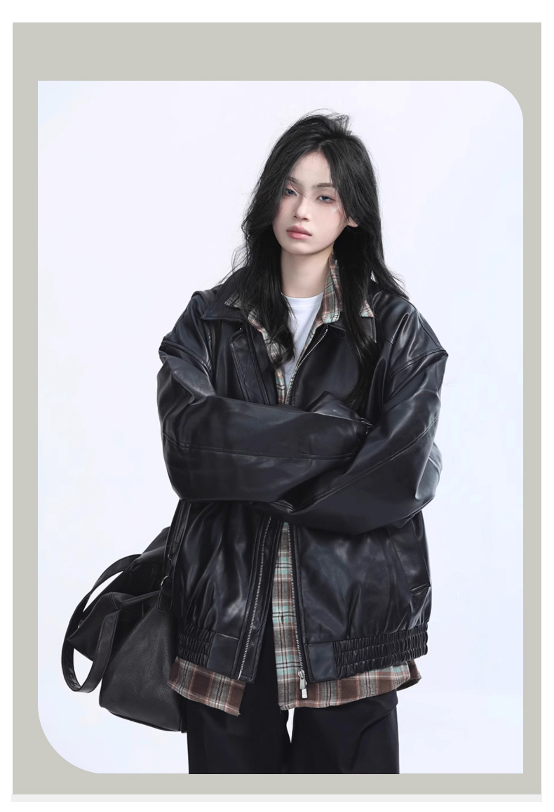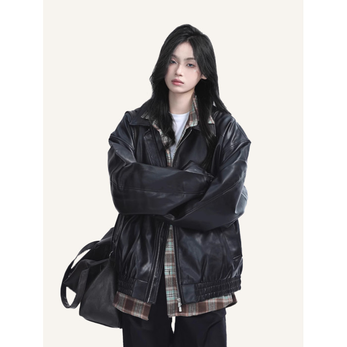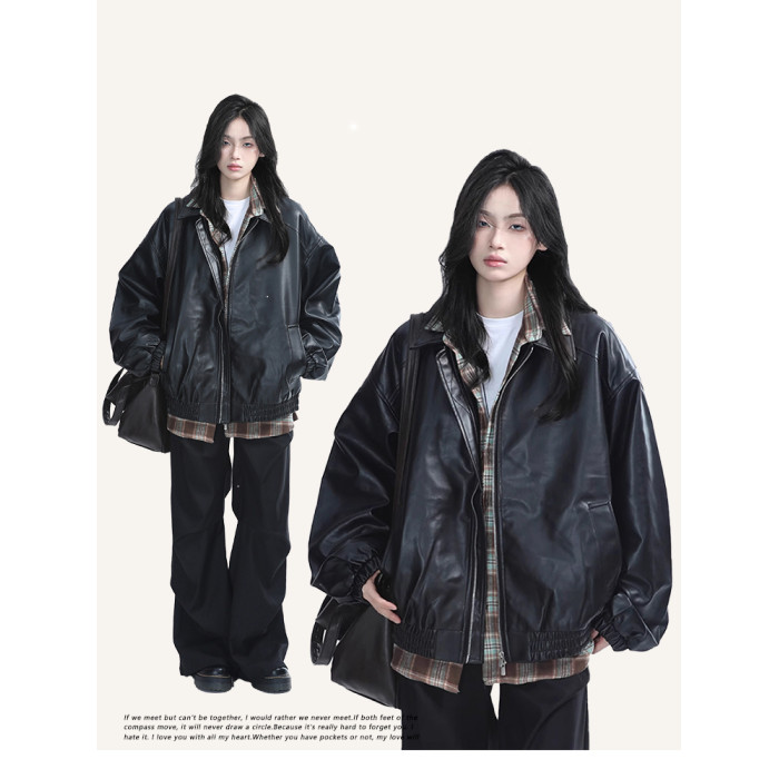 街頭ins美式復古翻領皮衣外套女2025年春秋季寬松機車風夾克上衣
