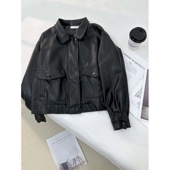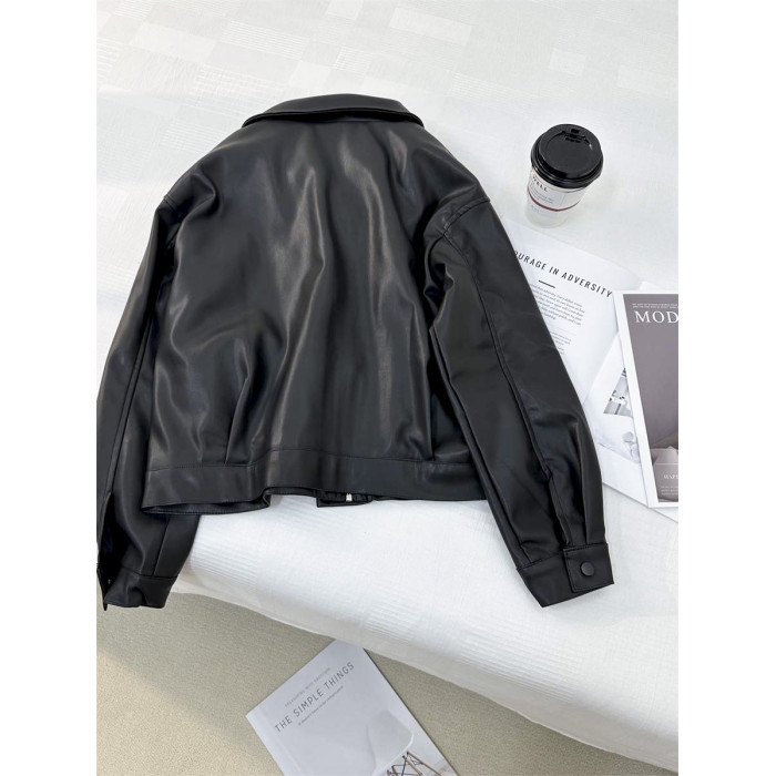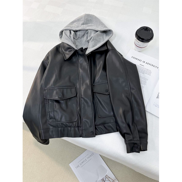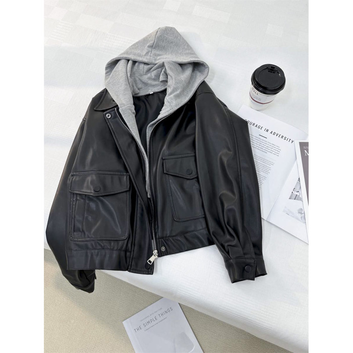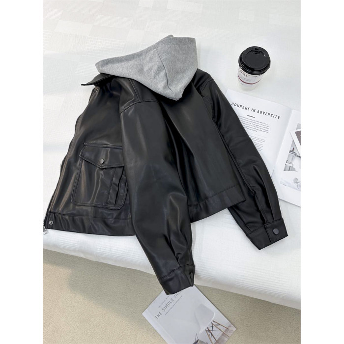 小個子俏皮減齡假兩件連帽皮衣外套女2024秋季新款學院風夾克上衣