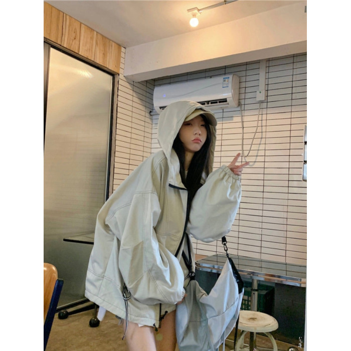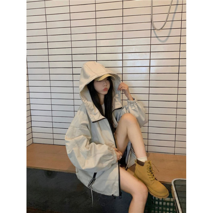 胖MM大碼300斤美式復古連帽沖鋒衣外套女春秋設計感小衆夾克上衣