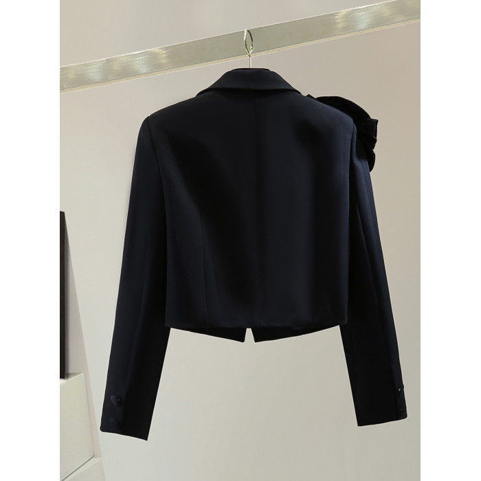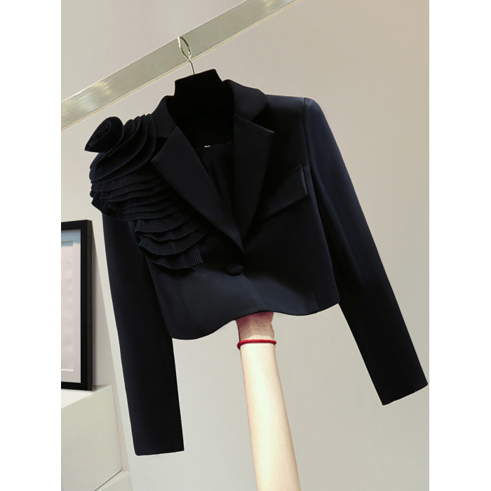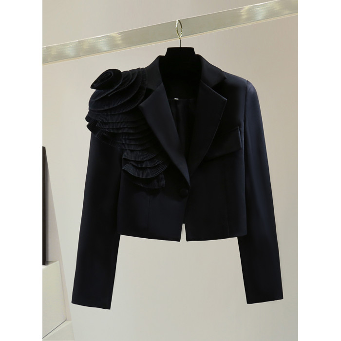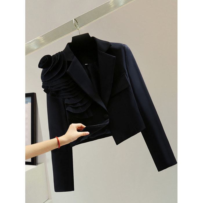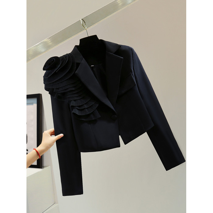 手工花朵長袖高腰短款小西裝秋冬韓版顯瘦純色休閒百褶女士短外套
