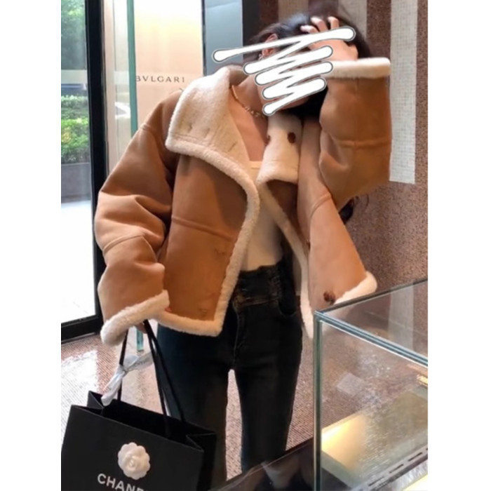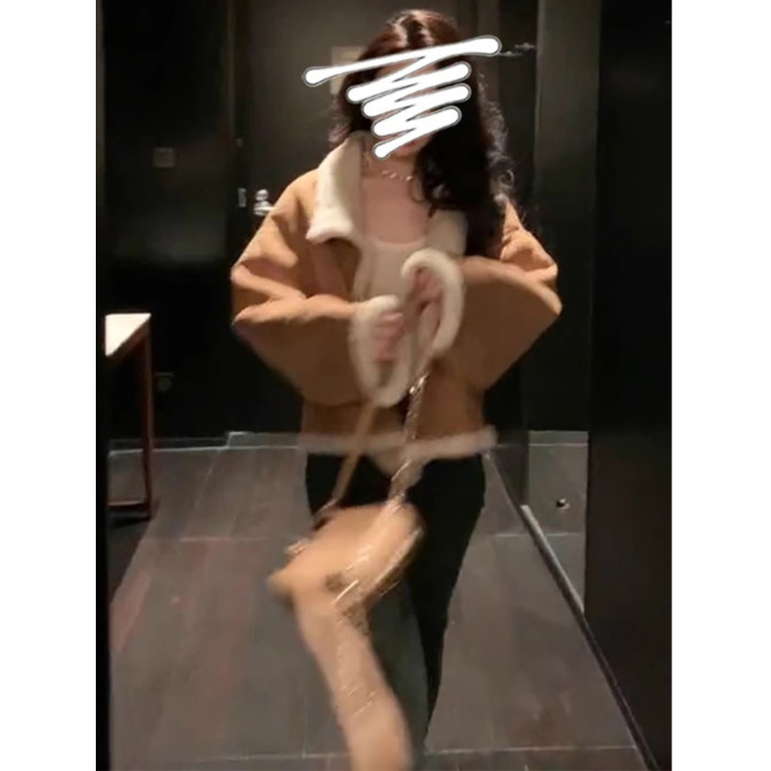 麂皮絨皮毛一體羊羔毛翻領外套女秋冬小個子短款加厚夾克上衣棉服