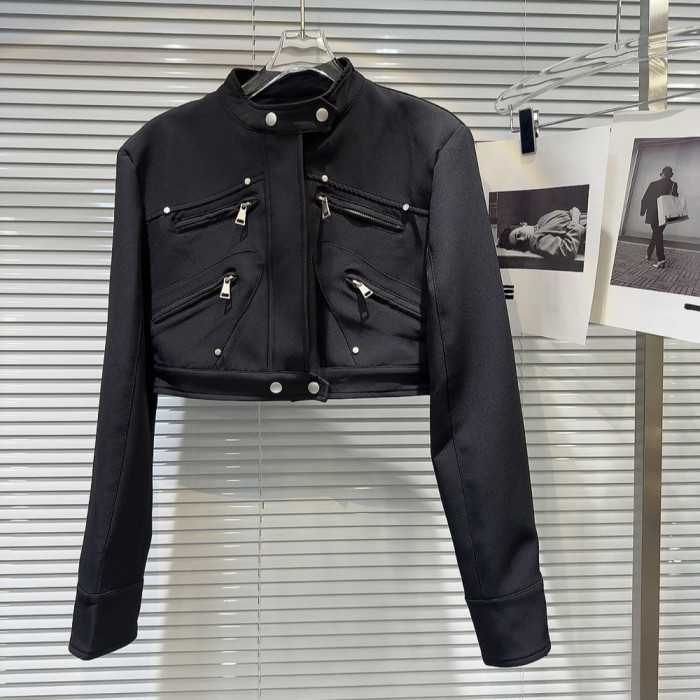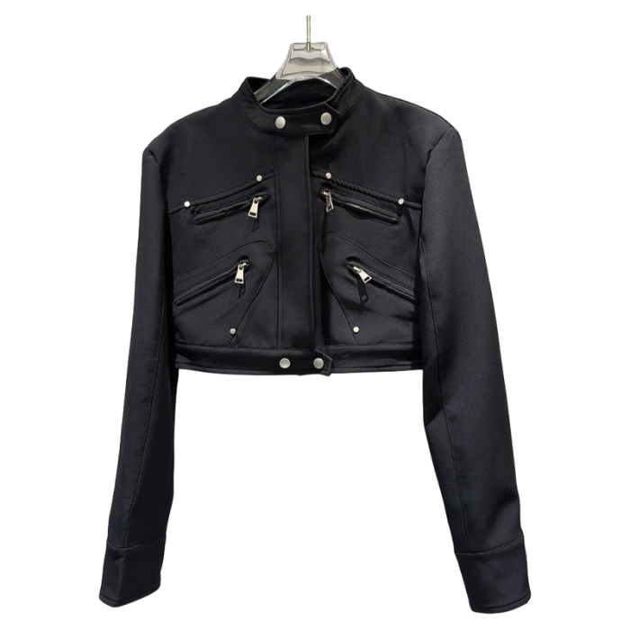 網紅同款2025秋季新款小衆辣妹金屬拉鍊設計墊肩立領夾克短外套女