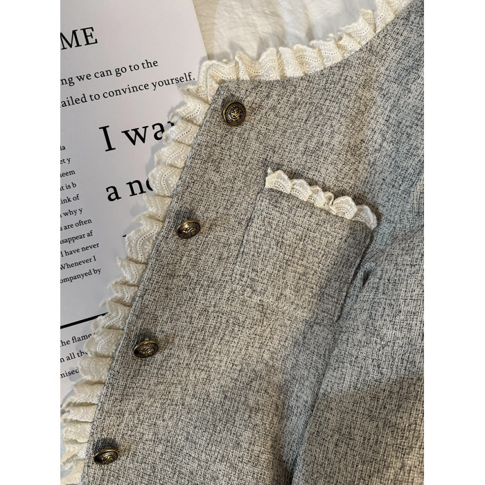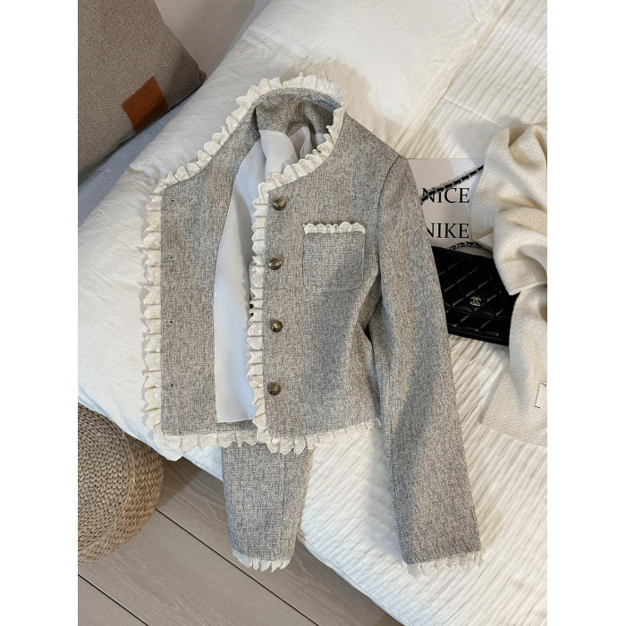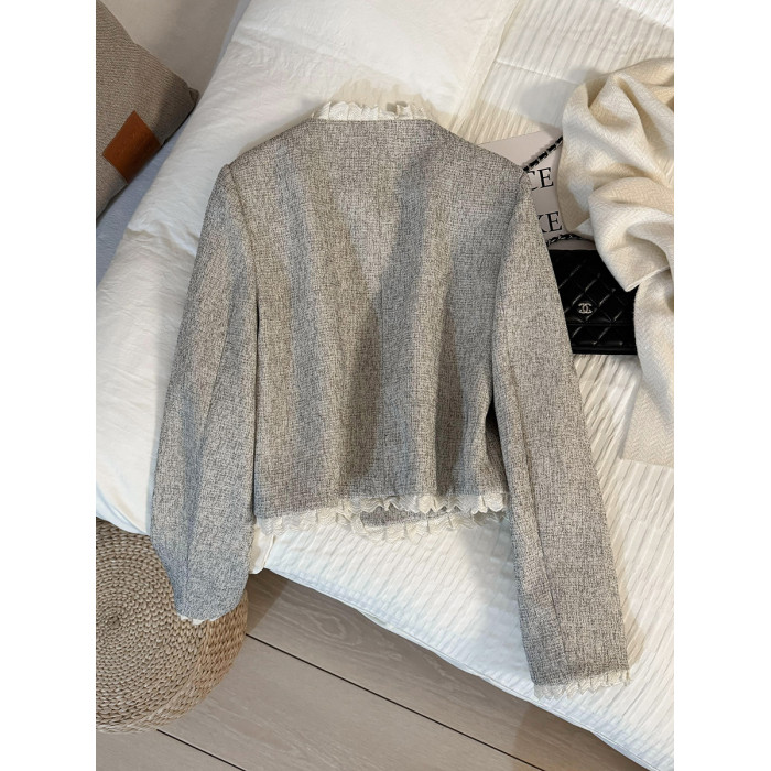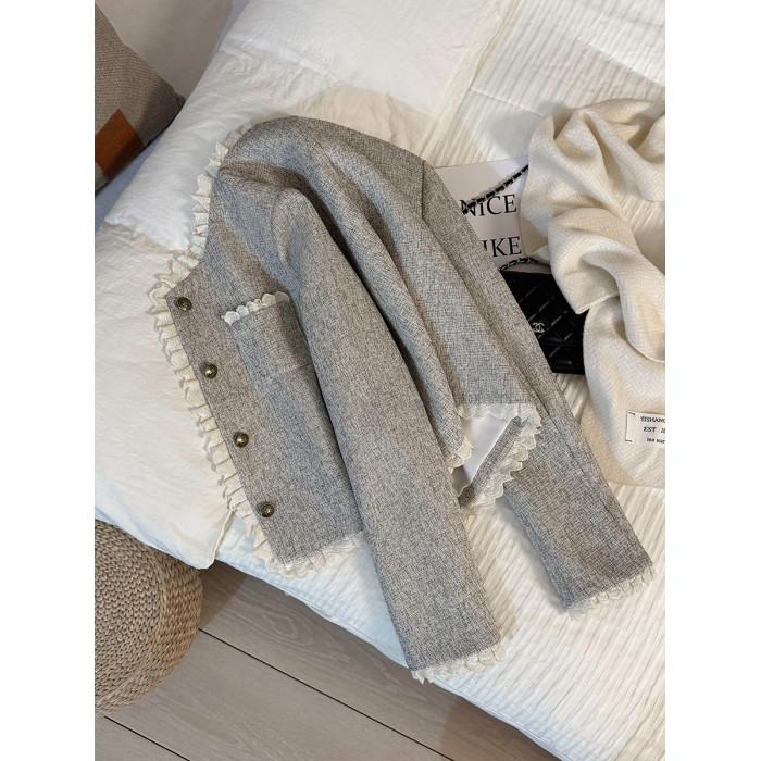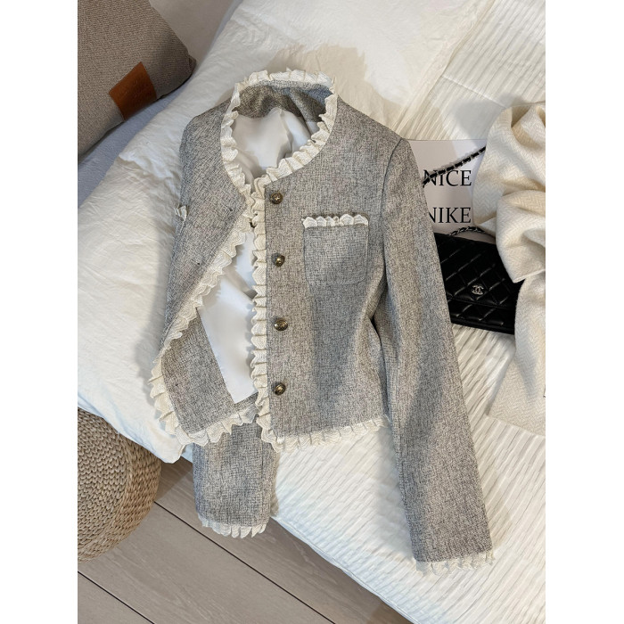 2025新款米灰色溫柔甜美花邊小香風短外套女秋冬爆款女神範上衣潮