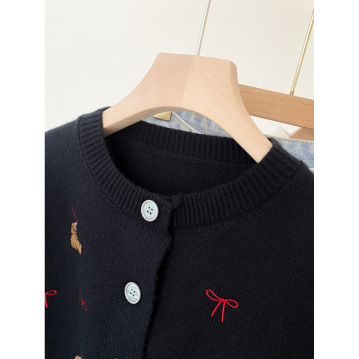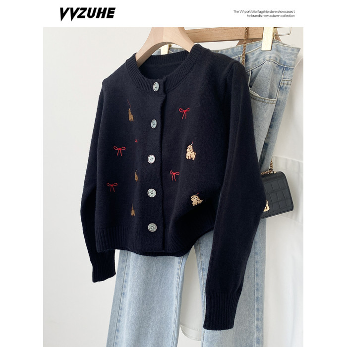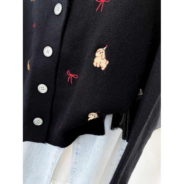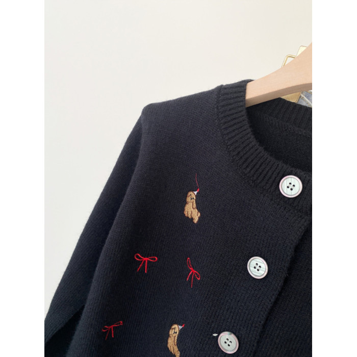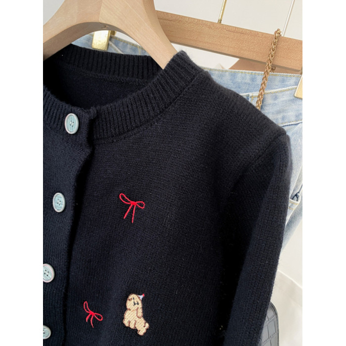 韓系小狗刺綉針織開衫長袖短外套女2025年冬季新款流行修身潮上衣