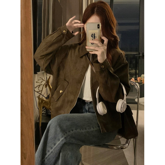 甜酷咖色麂皮絨外套女春秋新款復古小衆短款美拉德上衣夾克小個子