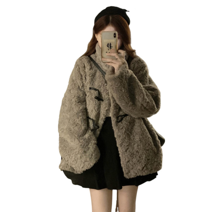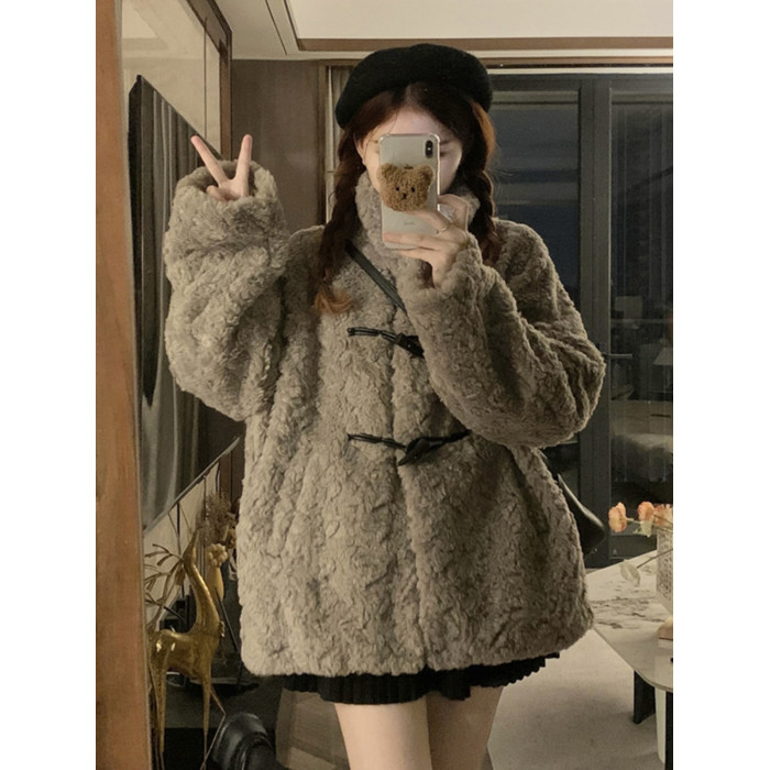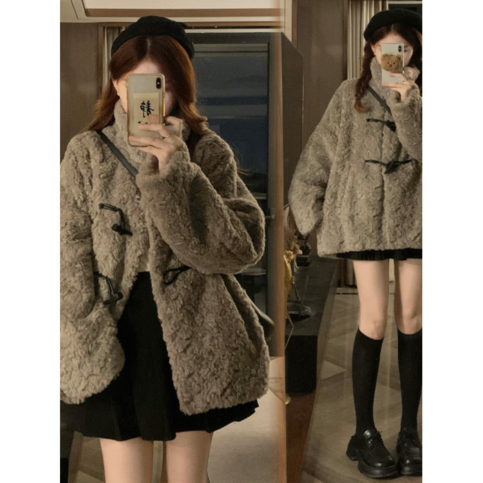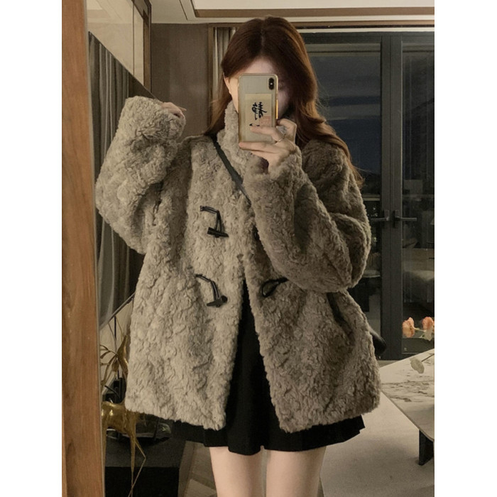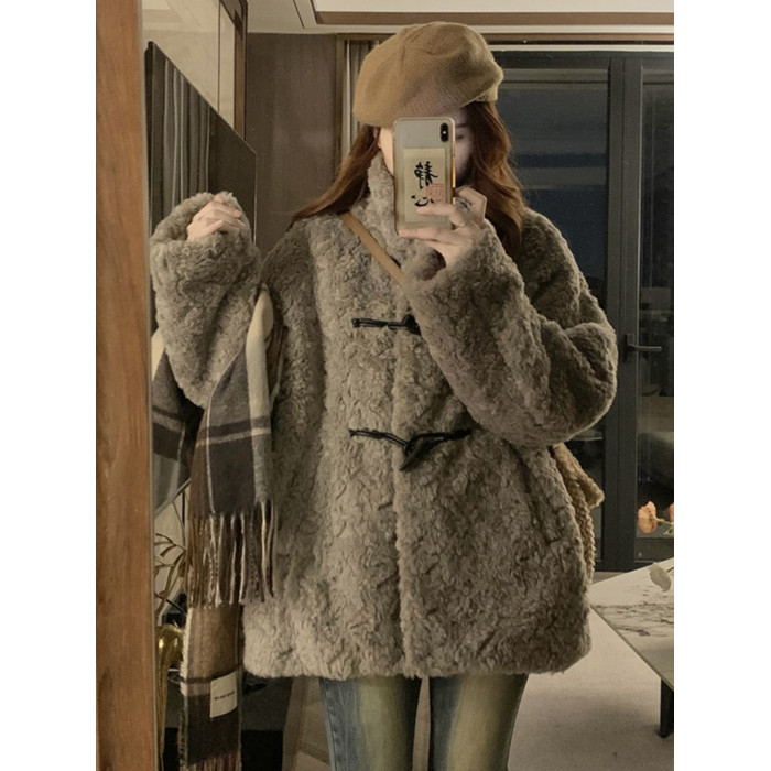 冬季立領羊羔毛外套女加厚寬松高級感毛絨茸茸皮草一體牛角釦棉服