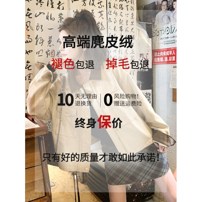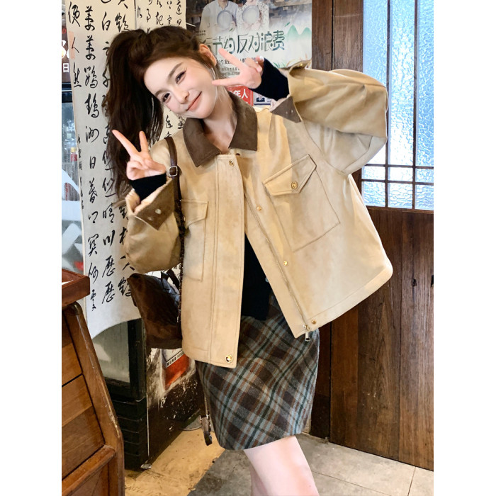 卡其色麂皮絨工裝外套女春秋2025新款小個子復古休閒寬松短款夾克