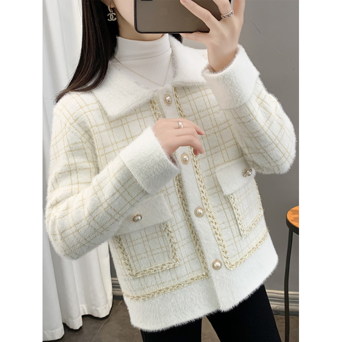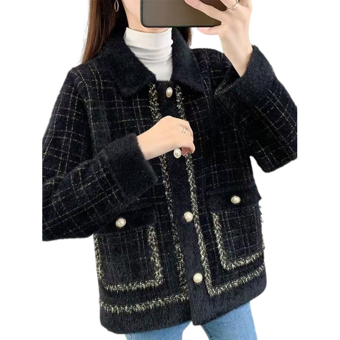 秋冬季水貂絨外套2025新款女裝春秋韓版寬松翻領小衫毛絨格子開衫