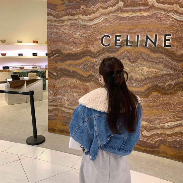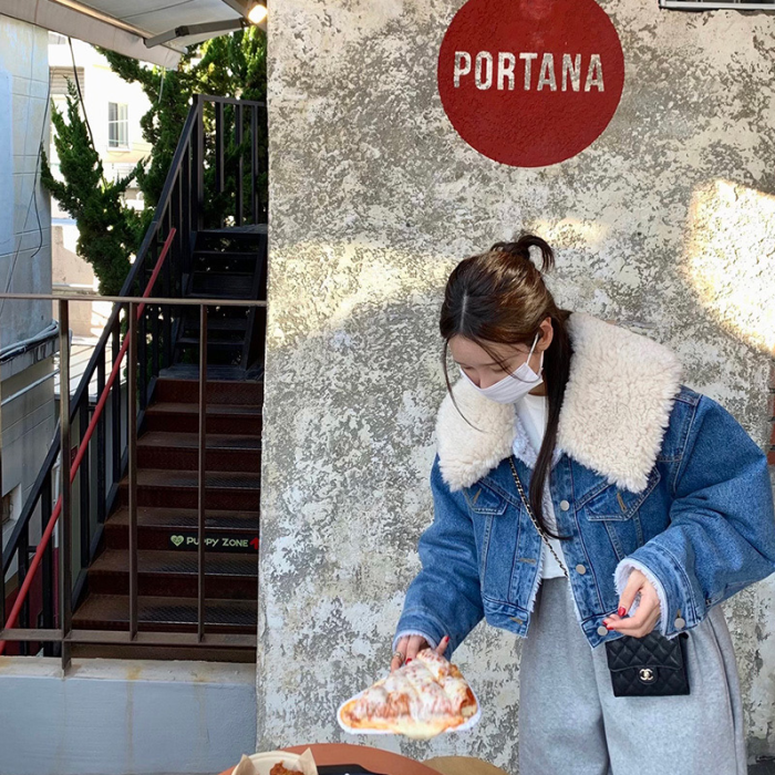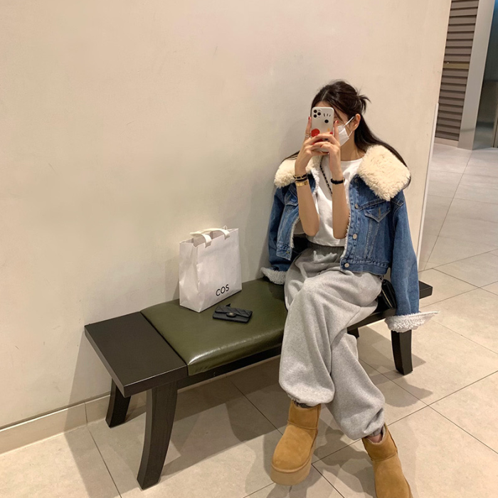 韓國娃娃領羊羔毛短款牛仔外套女冬寬松顯瘦加絨加厚顆粒羊絨上衣