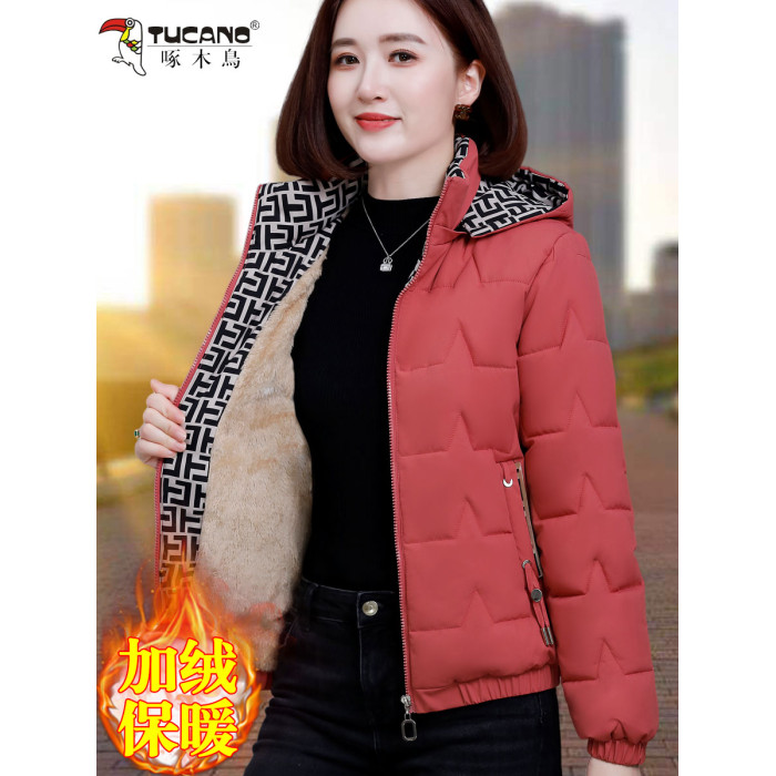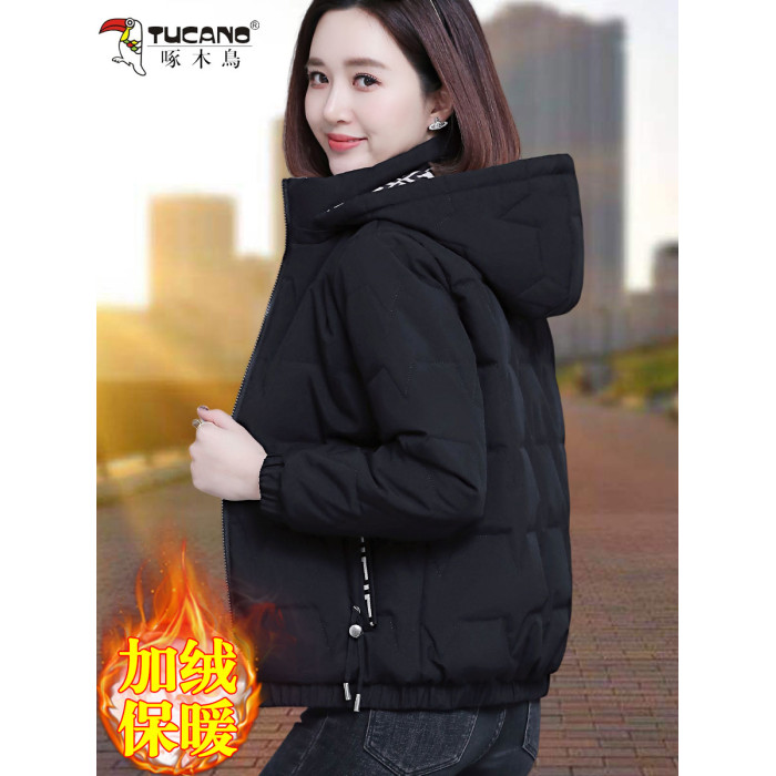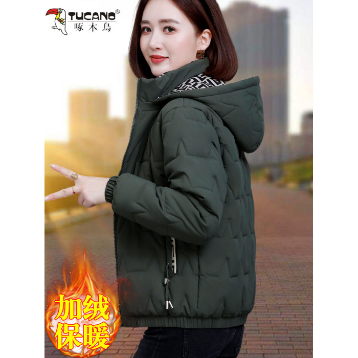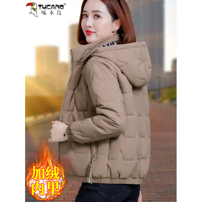 啄木鳥加絨棉衣女冬季2025新款中年媽媽洋氣冬裝棉服加厚棉襖外套