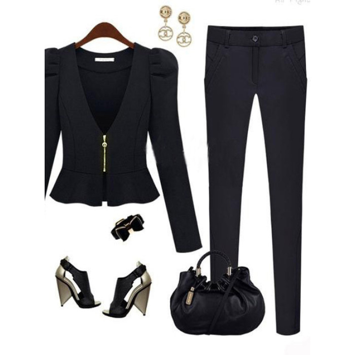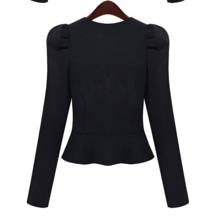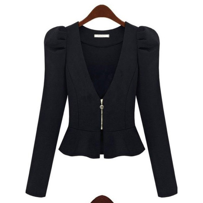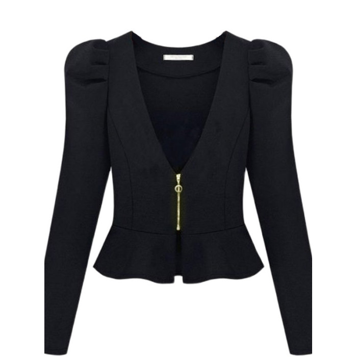 A805大碼新款韓版棉質拉鍊上衣泡泡袖長袖荷葉擺小西服短外套