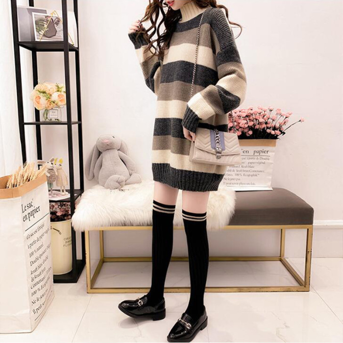 慵懶風毛衣女秋冬寬松中長款套頭半高領針織衫時尚百搭打底裙外套