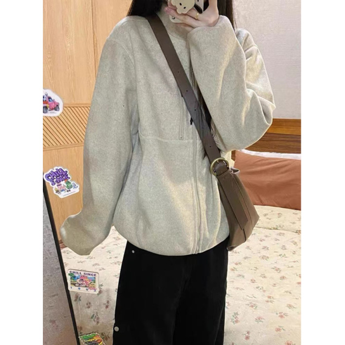 美式復古毛呢夾克女春秋季2024新款寬松休閒百搭立領衛衣開衫外套