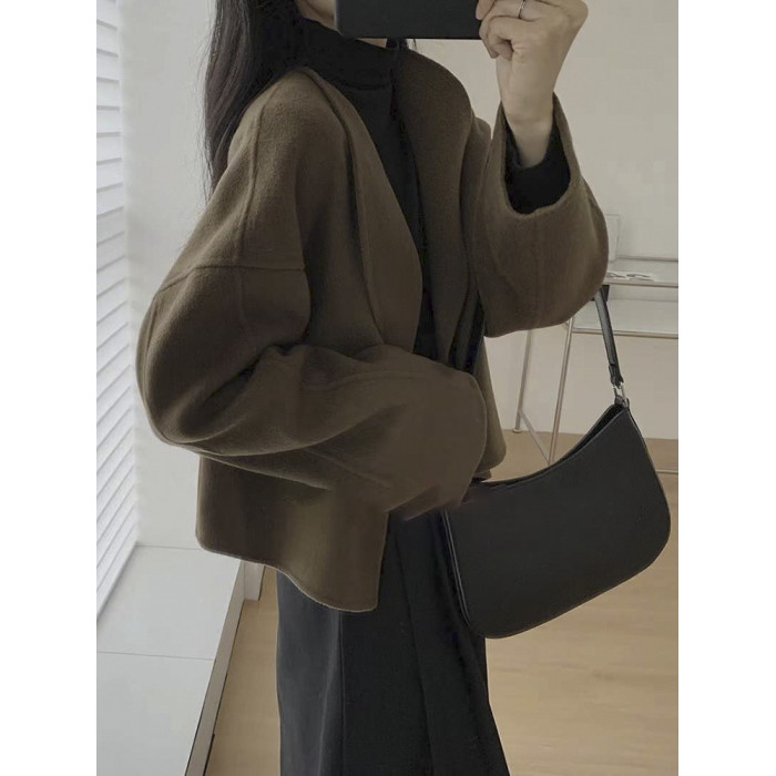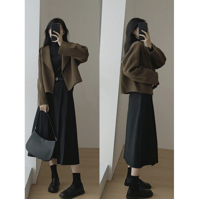 赫本風黑色短款毛呢外套女半身裙秋冬小個子雙面羊絨高級感厚大衣