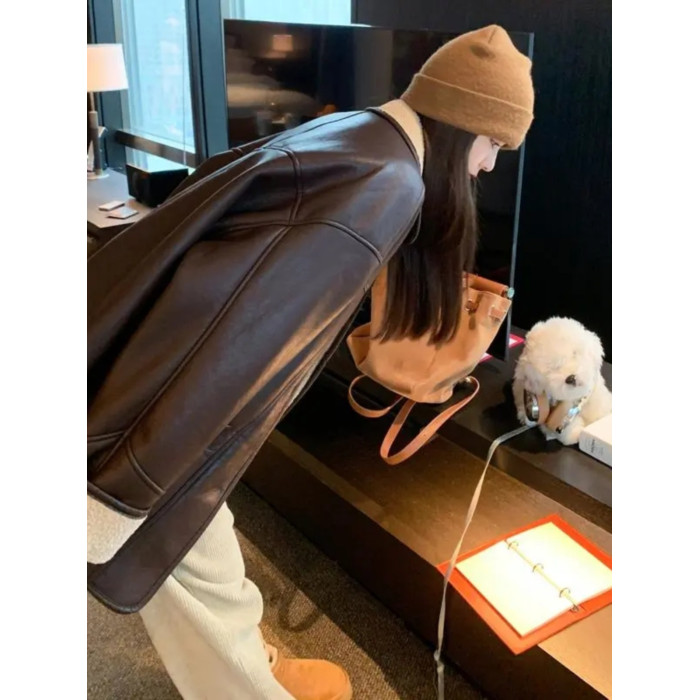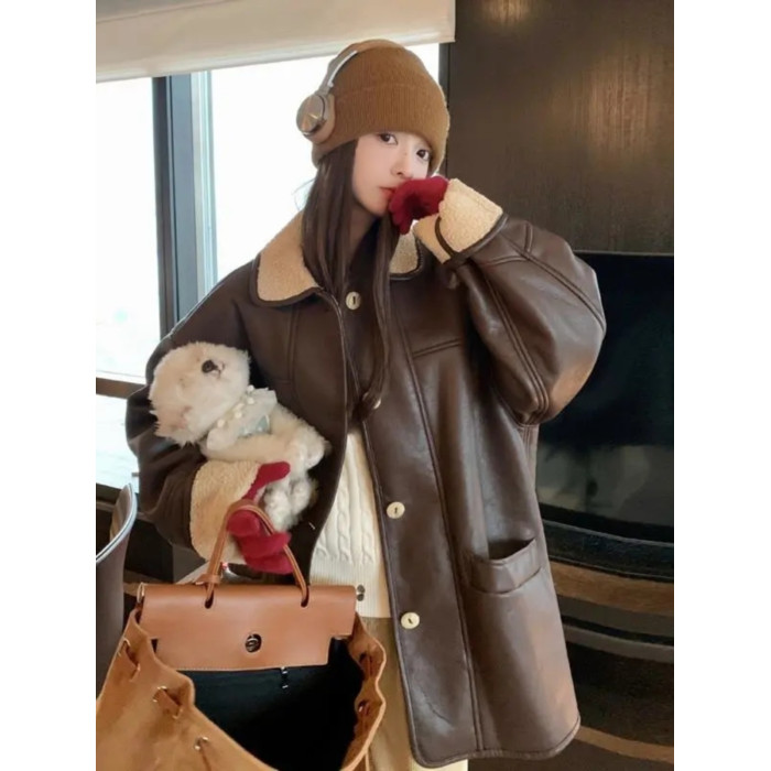 胖mm300斤大碼復古羊羔毛外套女秋冬寬松撞色加厚皮毛一體機車服