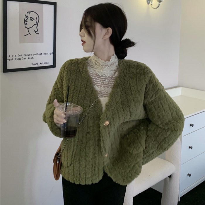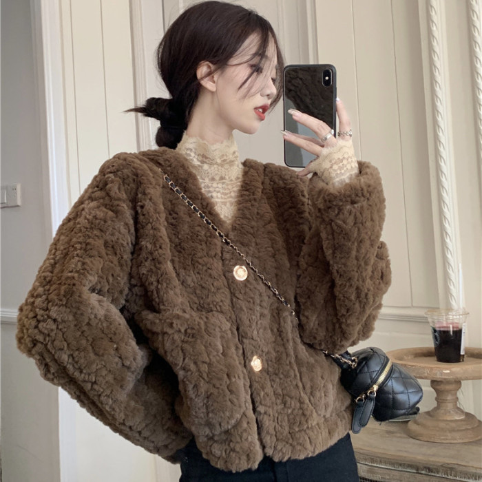高級感仿羊羔毛軟糯外套秋冬2022新款加厚保暖V領洋氣ins上衣女裝