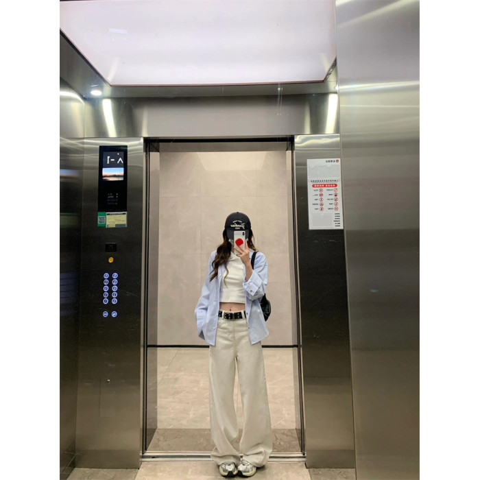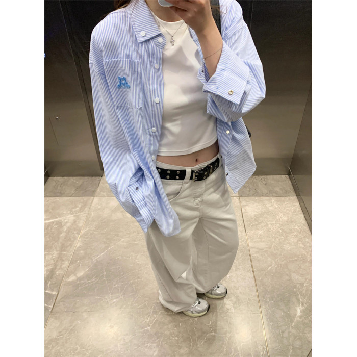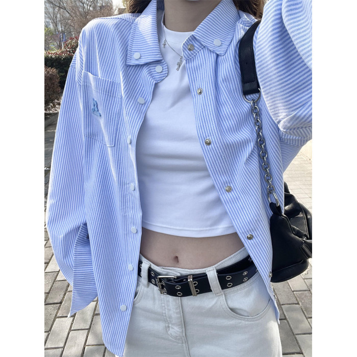韓系藍色條紋小狗刺綉襯衫外套女夏季新款透氣防曬高級感長袖襯衣