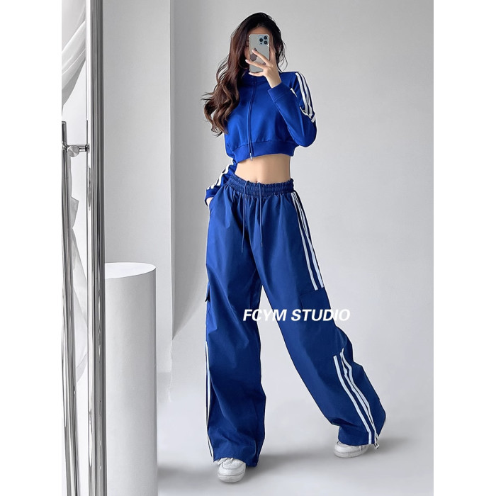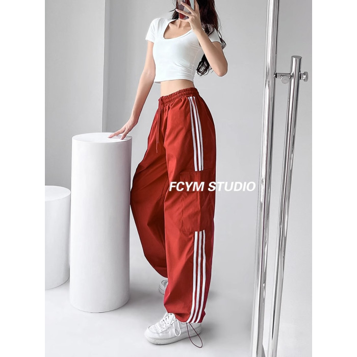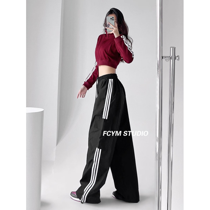 美式工裝褲女小個子jazz舞復古潮牌直筒濶腿休閒褲寬松條紋運動褲