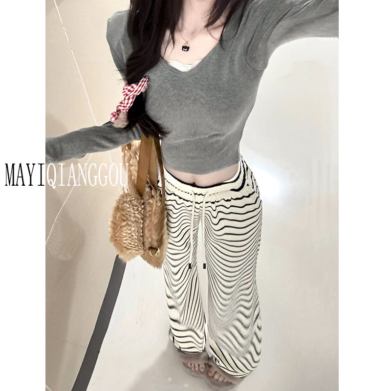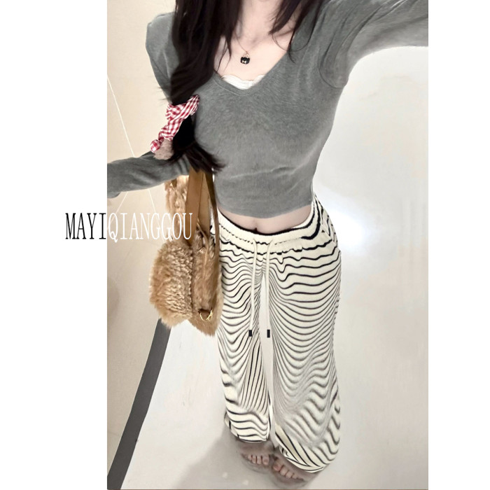 175高個子女裝加長版黑白條紋褲子女春秋高腰直筒寬鬆濶腿拖地褲