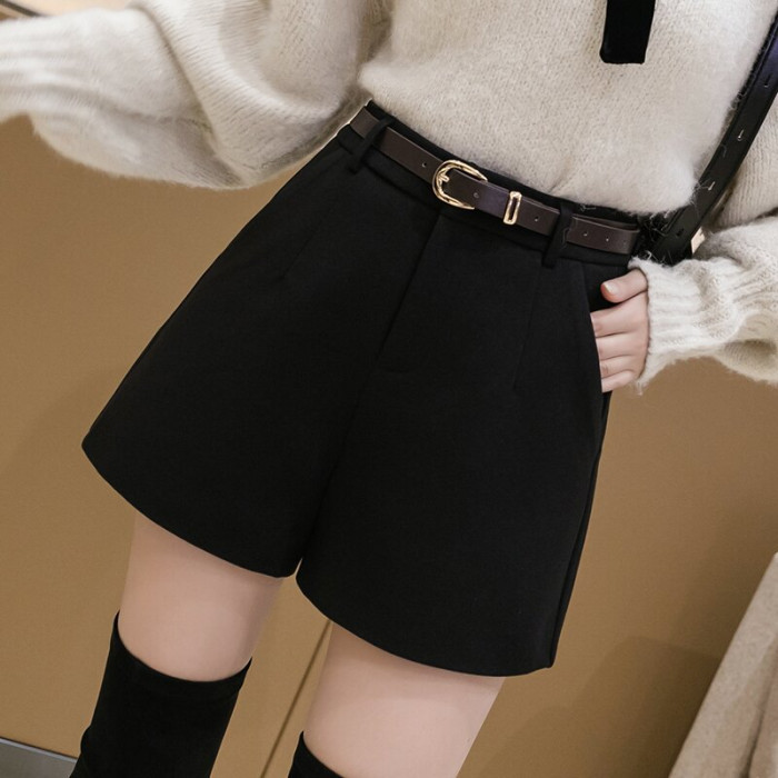 黑色毛呢短褲女秋冬外穿打底靴褲小個子高腰寬松顯瘦a字濶腿褲子