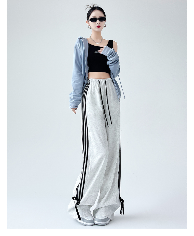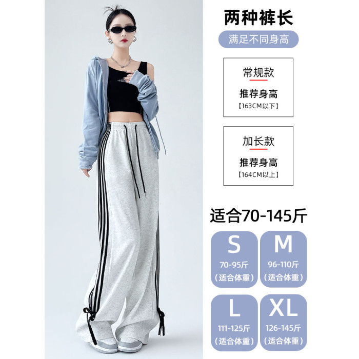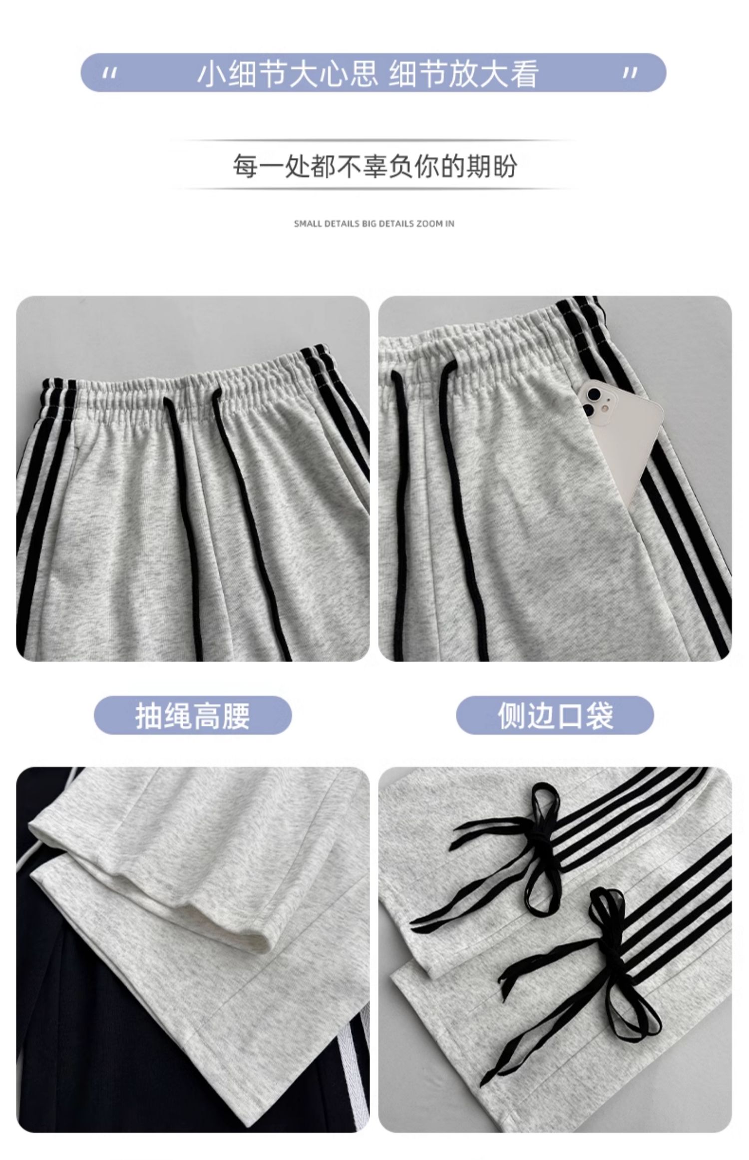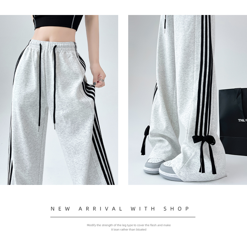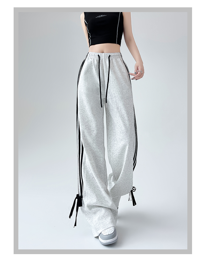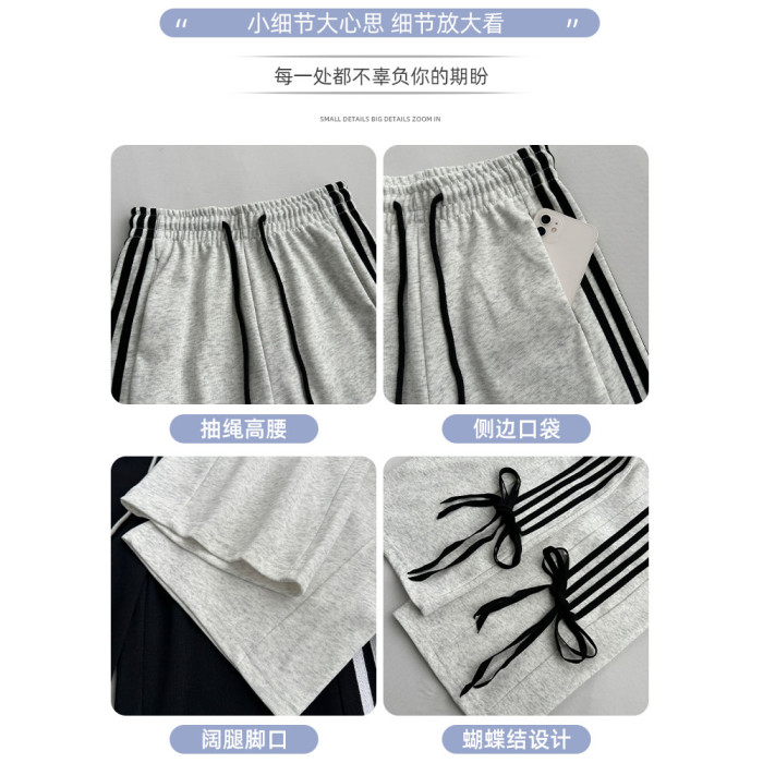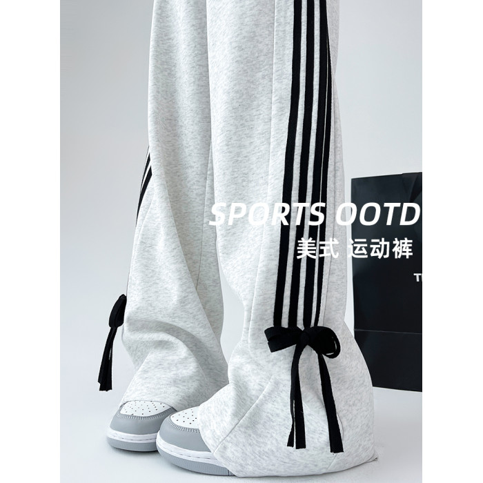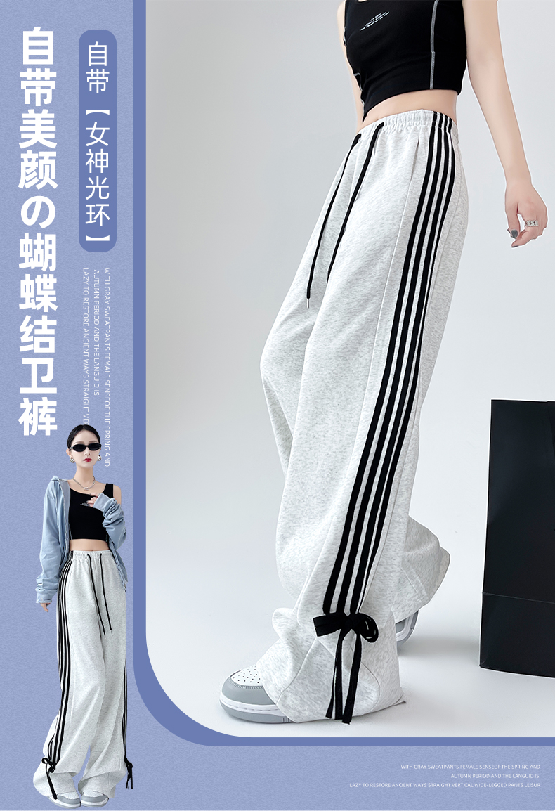 灰色運動褲女直筒秋季2025年新款休閒蝴蝶結條紋濶腿褲小個子衛褲