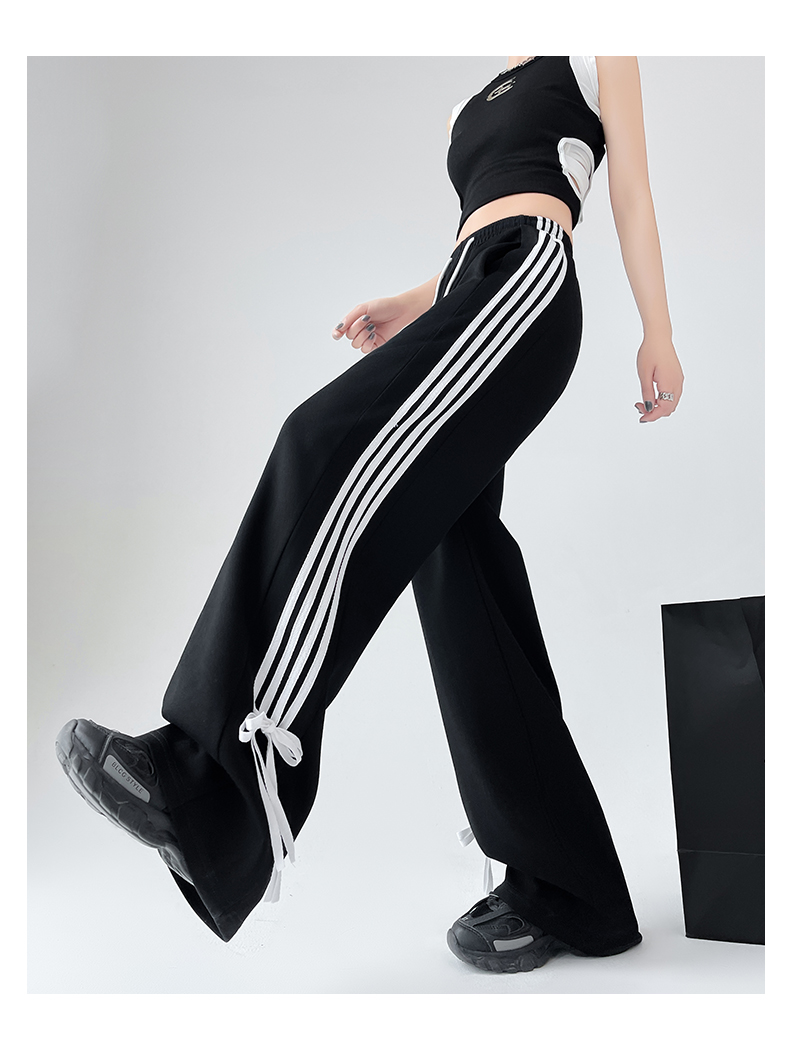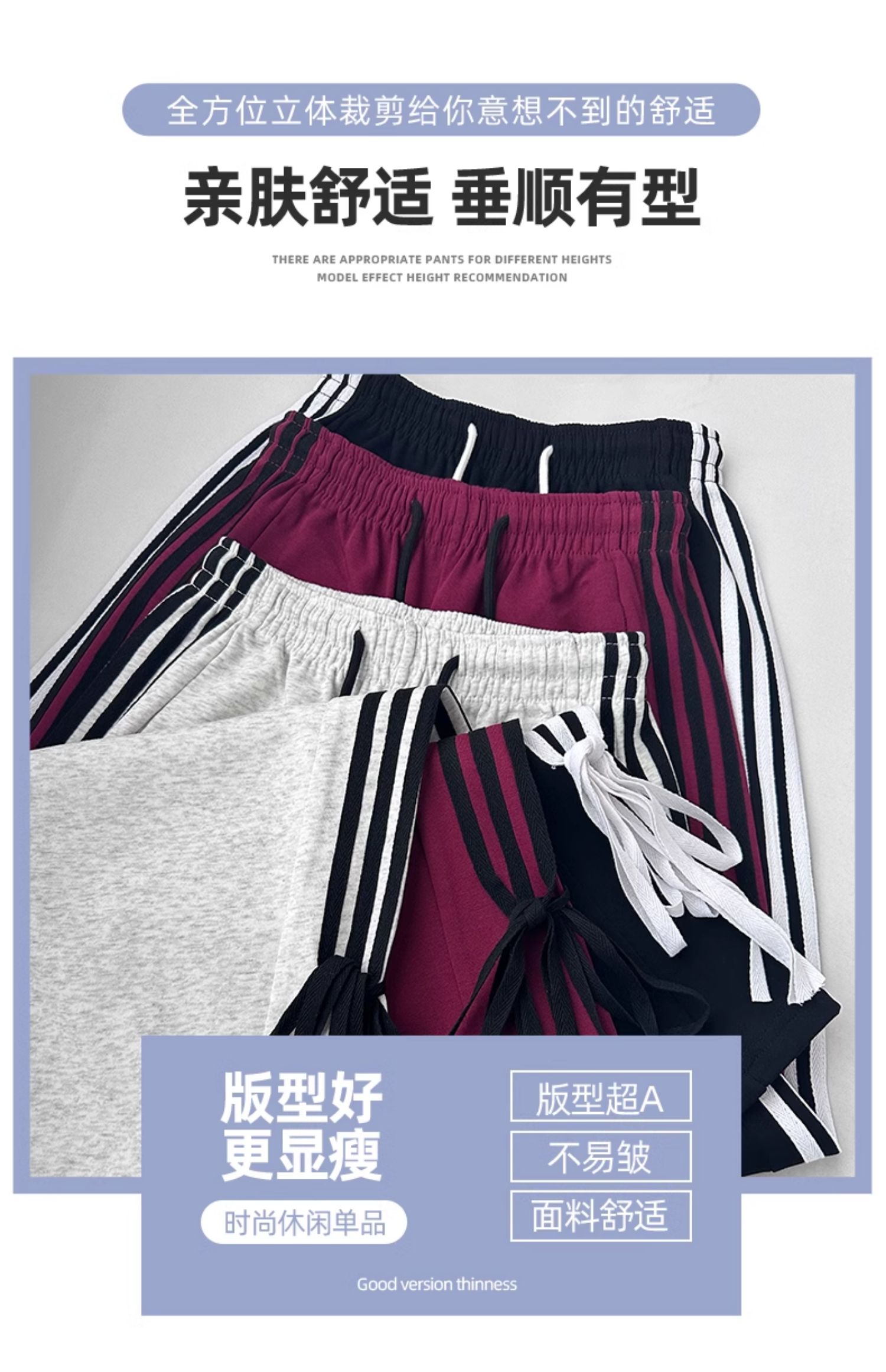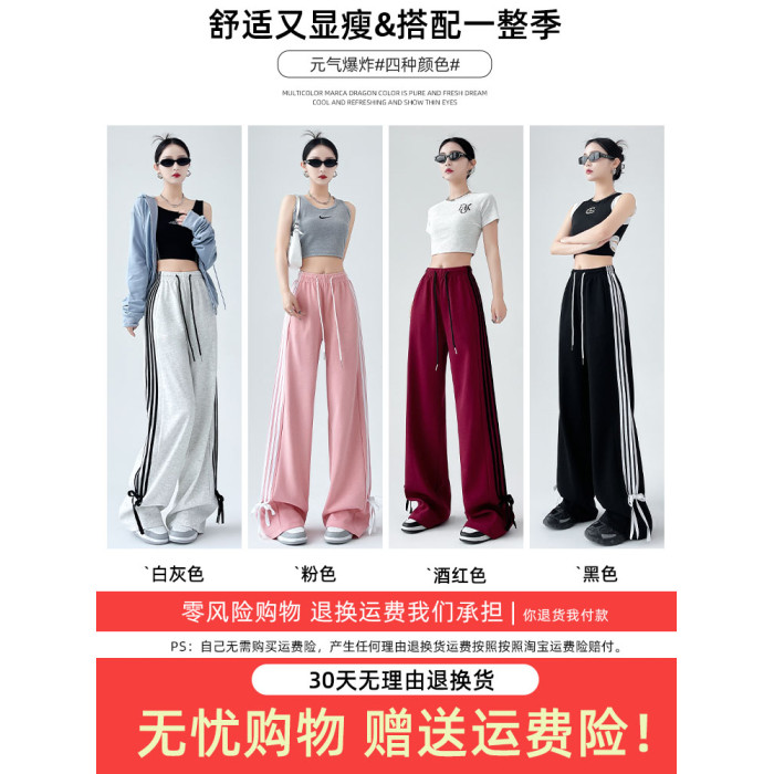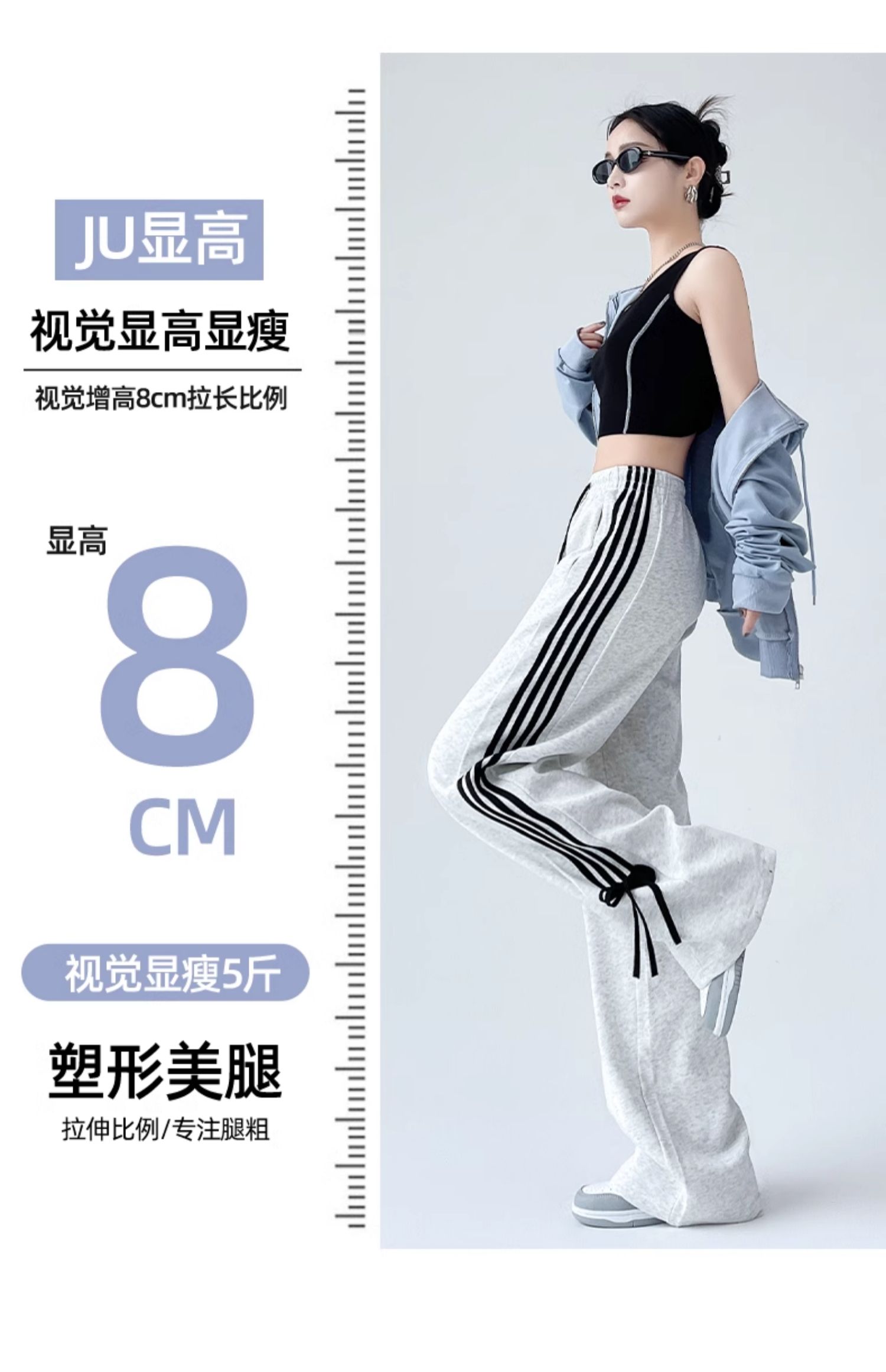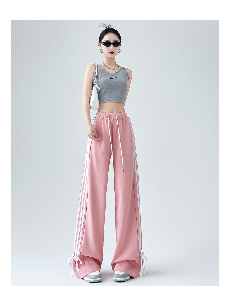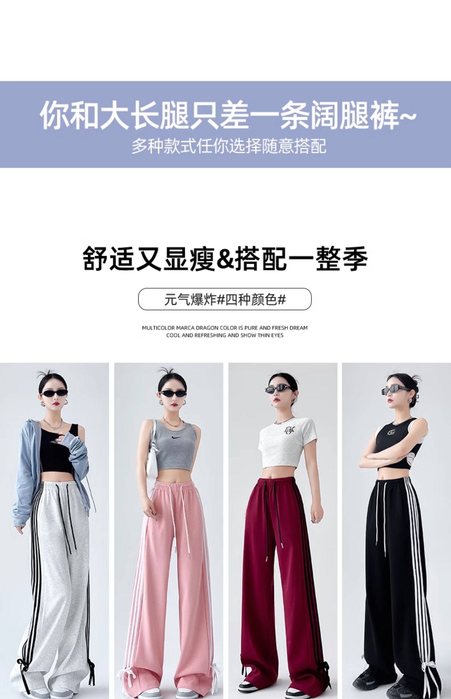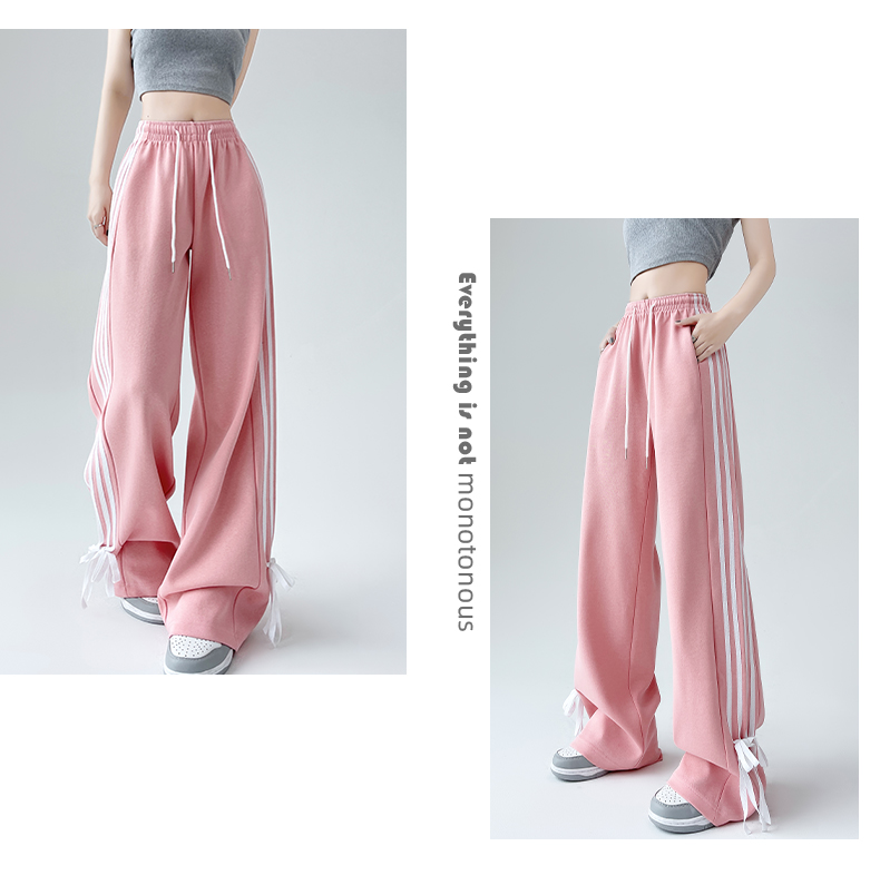 灰色運動褲女直筒秋季2025年新款休閒蝴蝶結條紋濶腿褲小個子衛褲