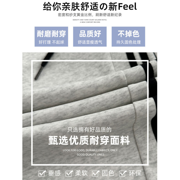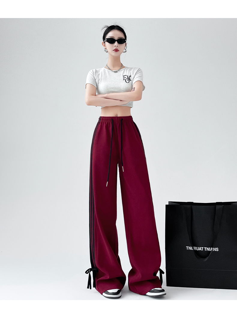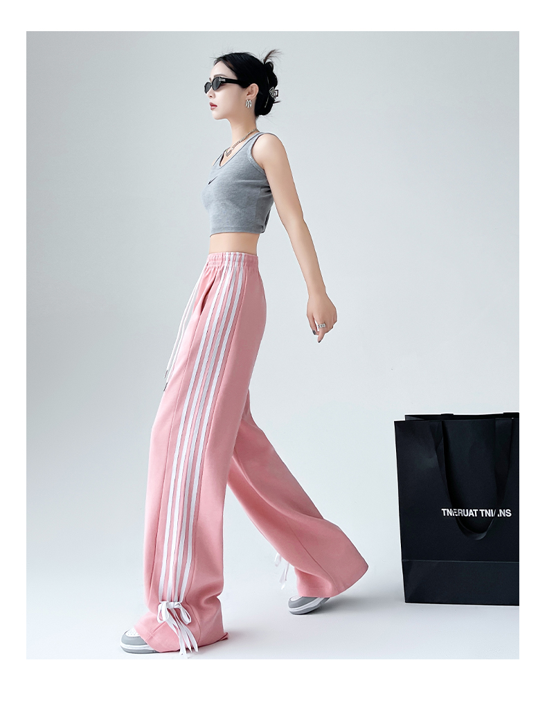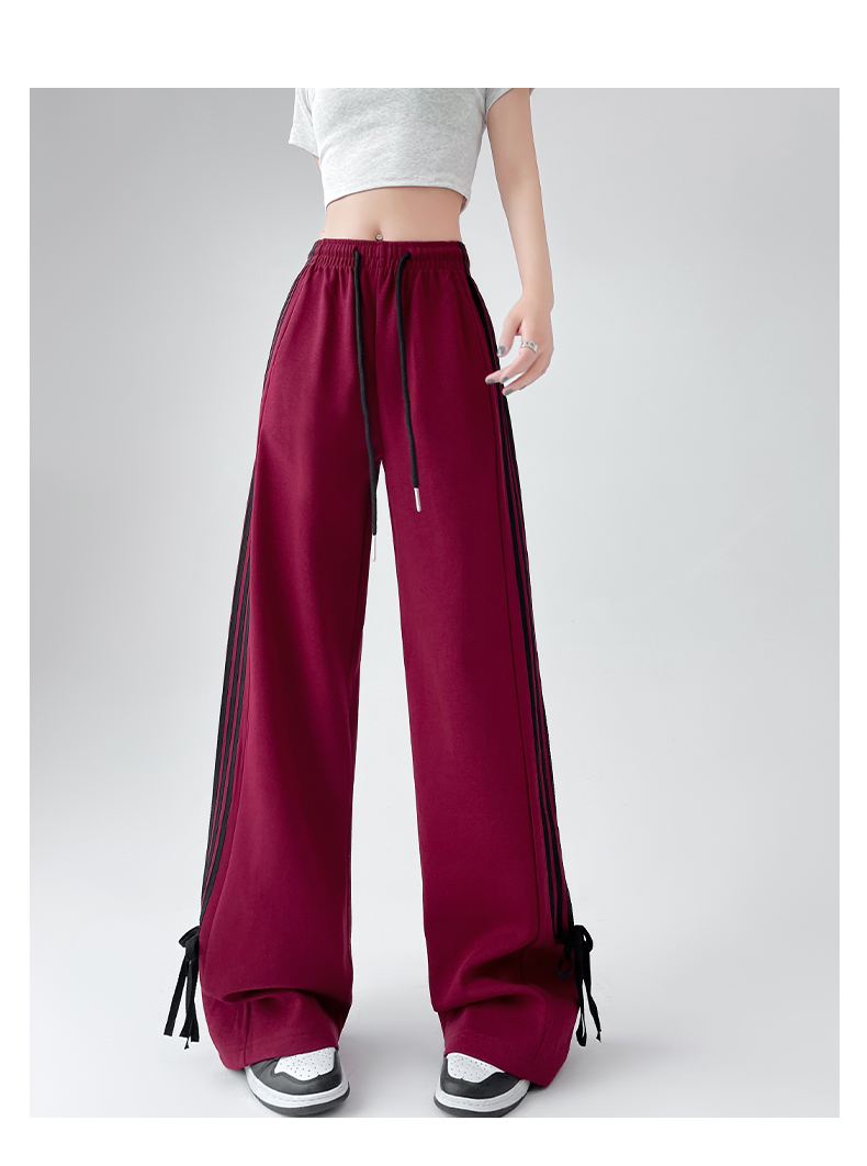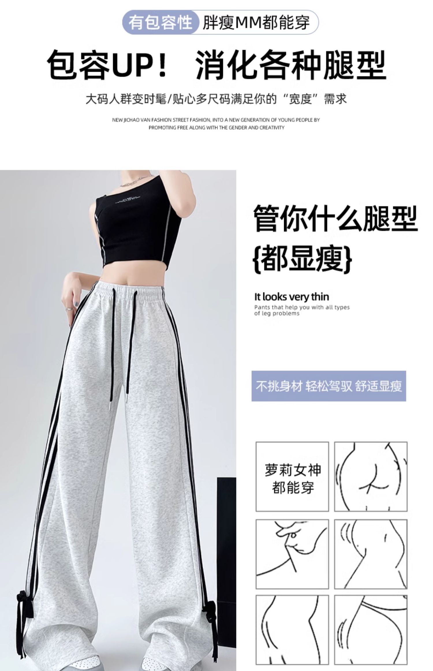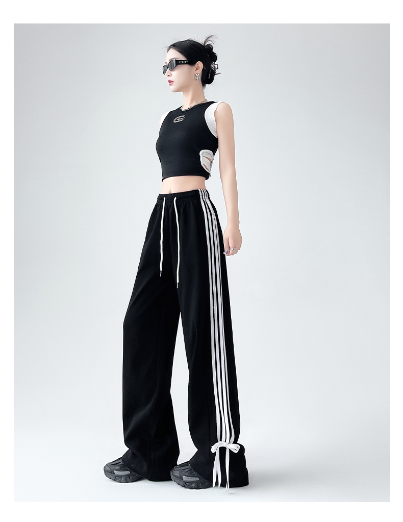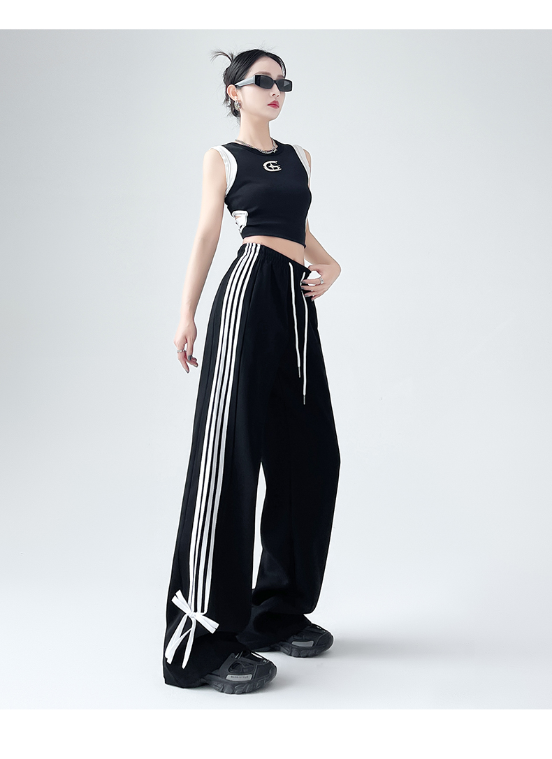 灰色運動褲女直筒秋季2025年新款休閒蝴蝶結條紋濶腿褲小個子衛褲