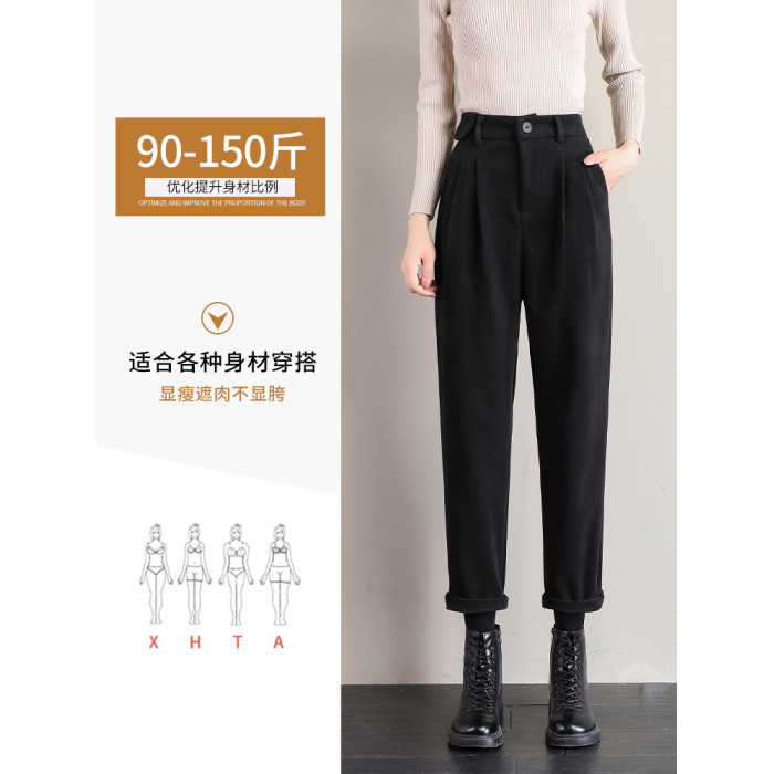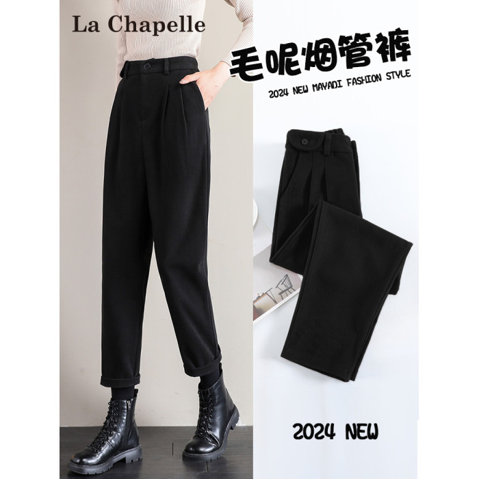 拉夏貝爾黑色毛呢褲女秋冬季高腰顯瘦小個子休閒九分菸管哈倫褲子