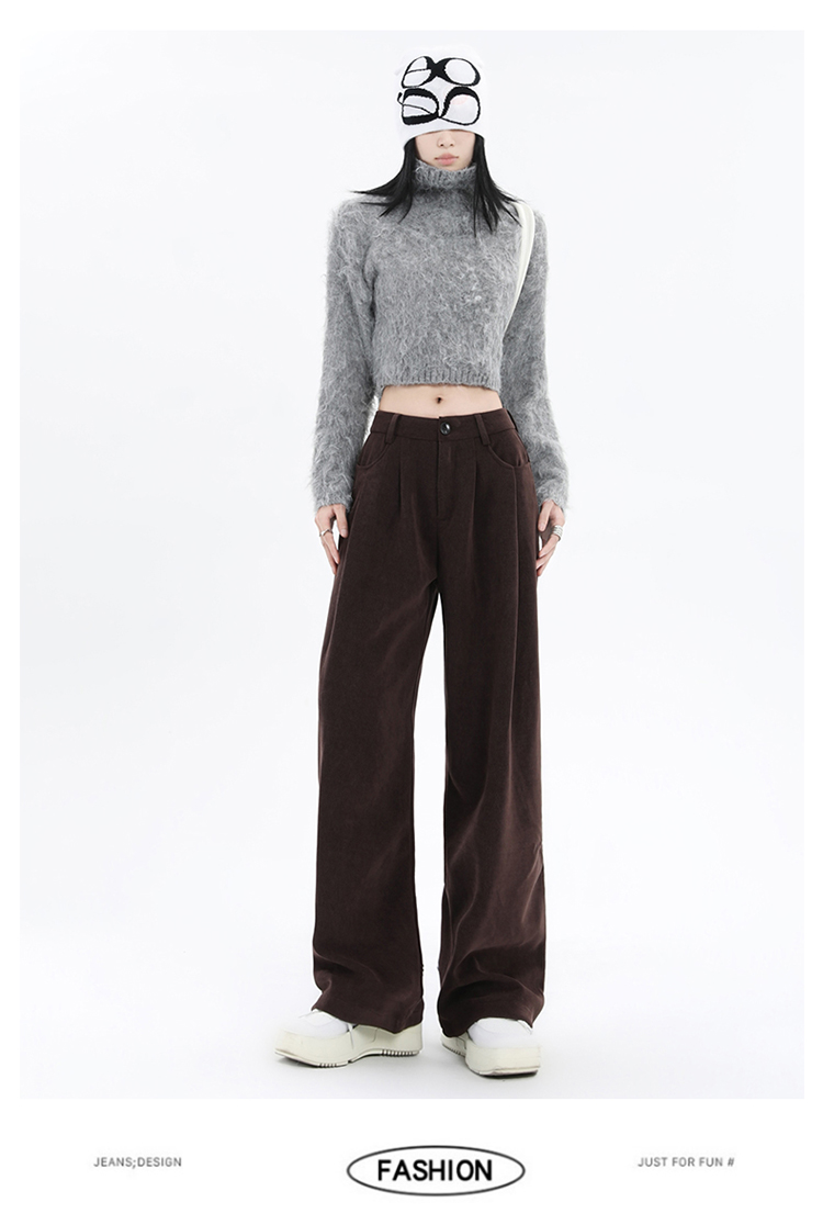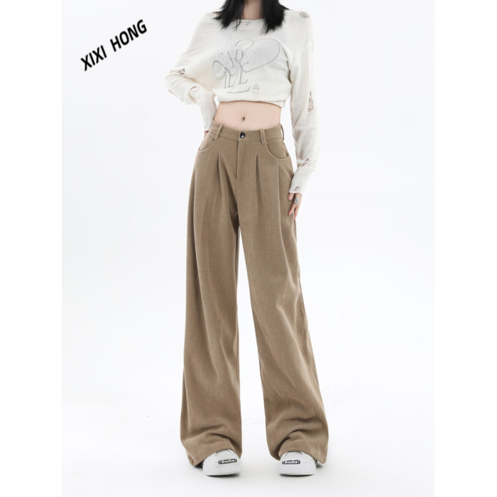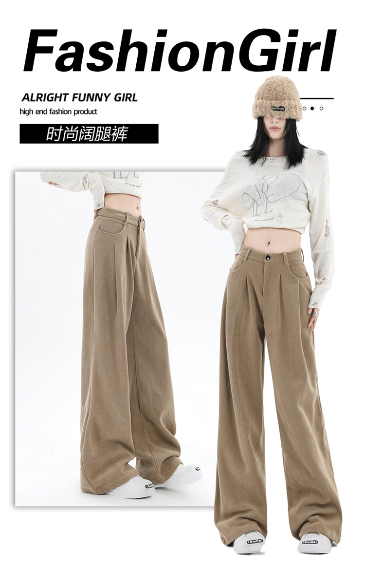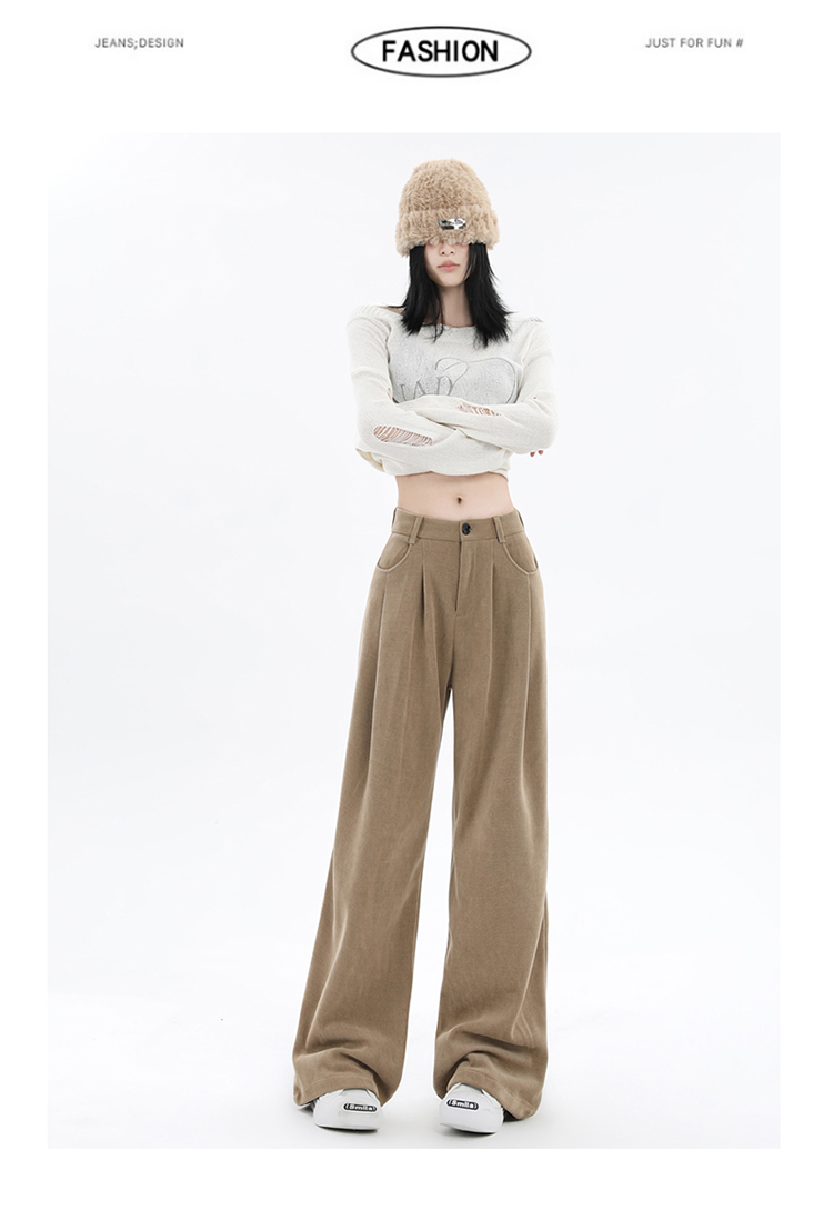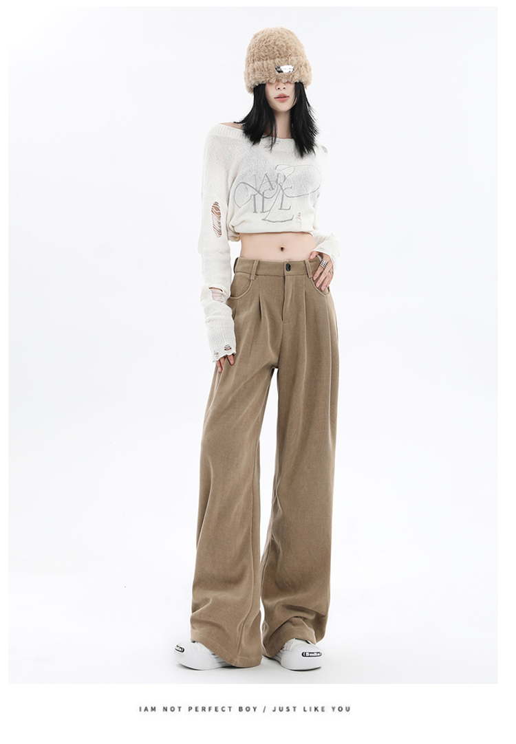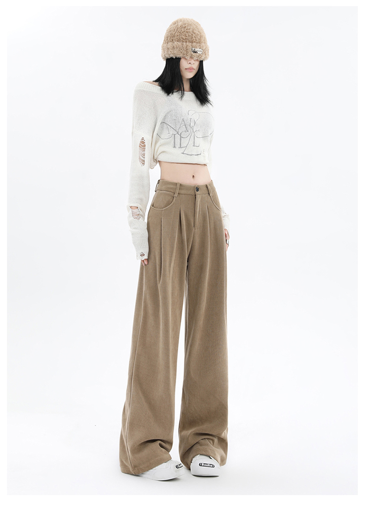 卡其色燈芯絨濶腿休閒褲女春秋新款寬松垂墜感褶皺設計直筒拖地褲