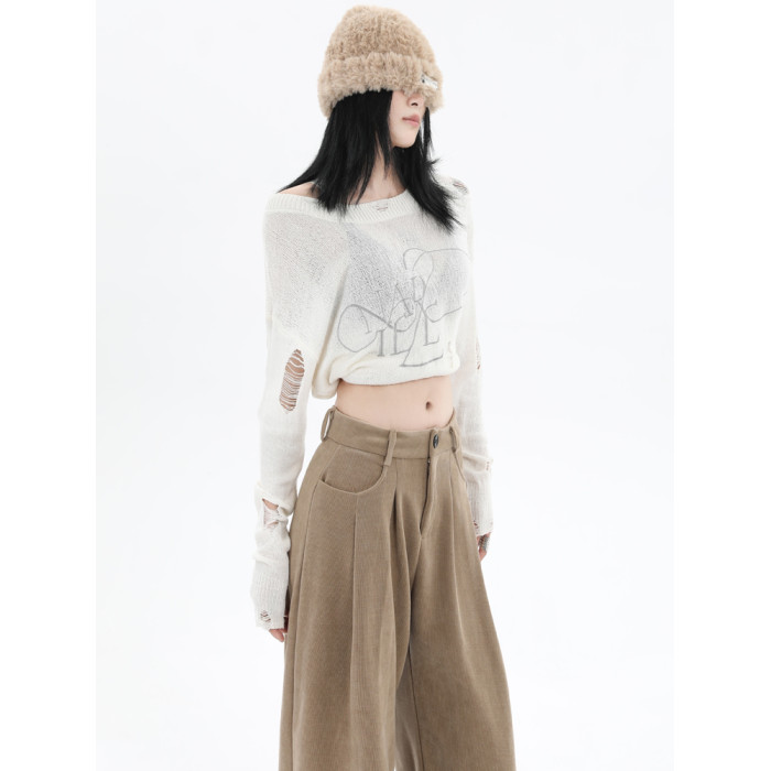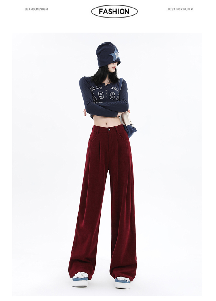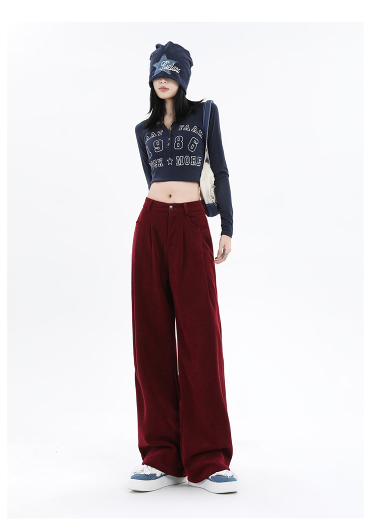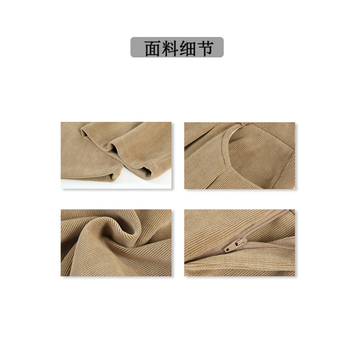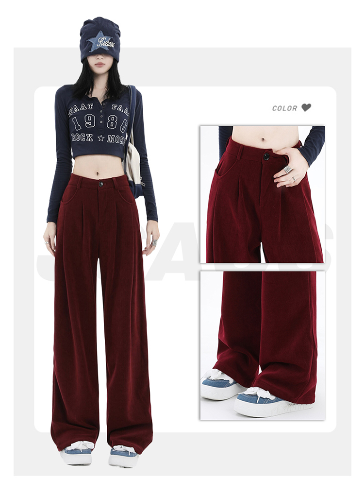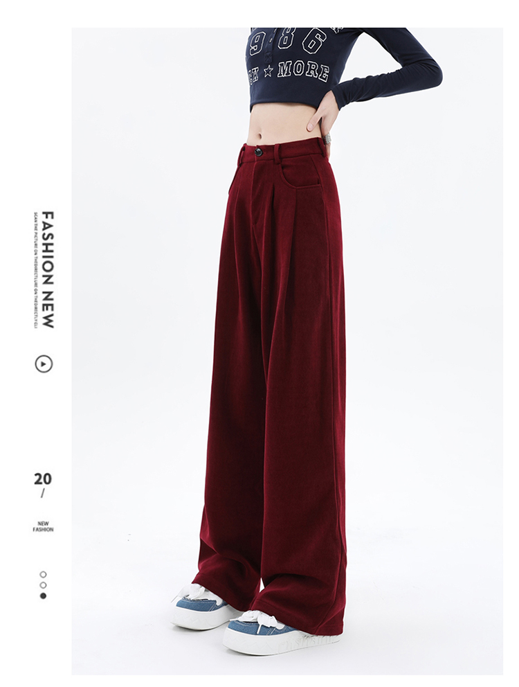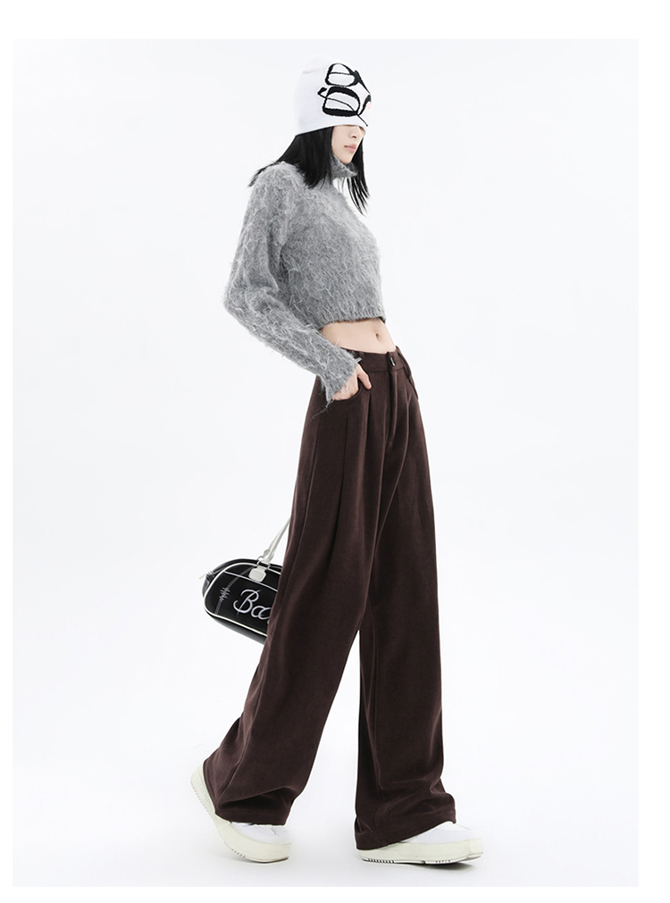 卡其色燈芯絨濶腿休閒褲女春秋新款寬松垂墜感褶皺設計直筒拖地褲