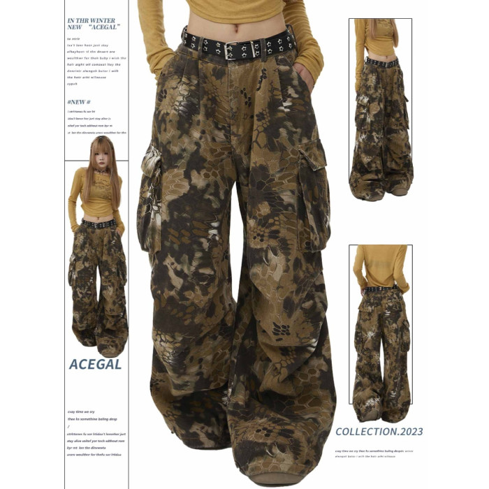 Remedie美式復古迷彩蛇紋工裝褲高街直筒濶腿褲子hiphop休閒長褲