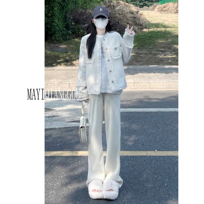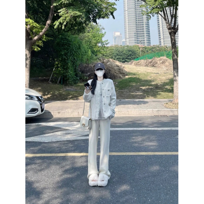 175高個子加長白色褲子女秋冬雪尼爾加絨高腰寬松直筒休閒針織褲