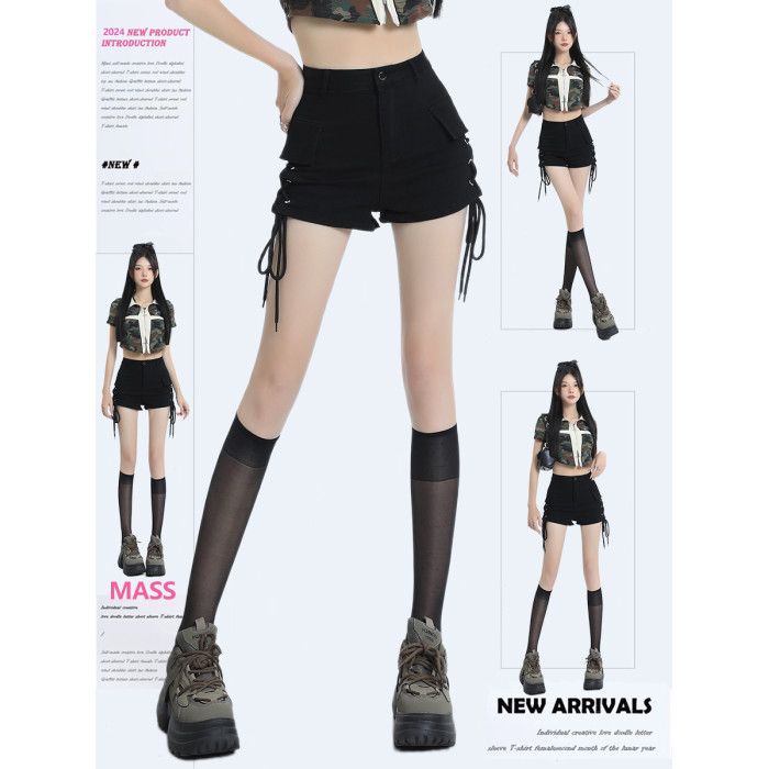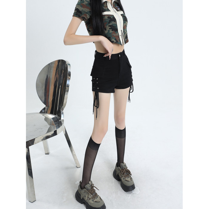 MASS黑色短褲女春夏2025新款辣妹修身顯瘦美式設計感綁帶牛仔熱褲