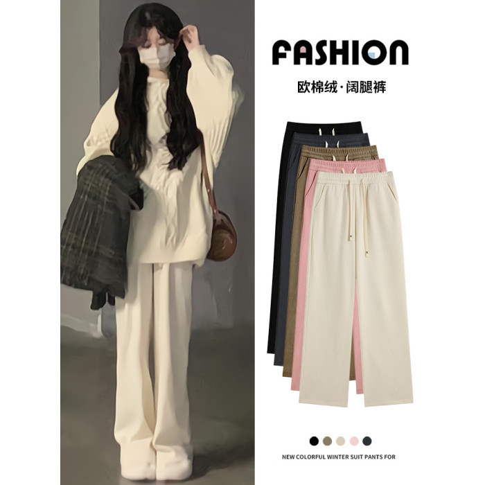 米白色濶腿褲女秋冬2024新款燈芯絨休閒直筒小個子軟糯針織拖地褲