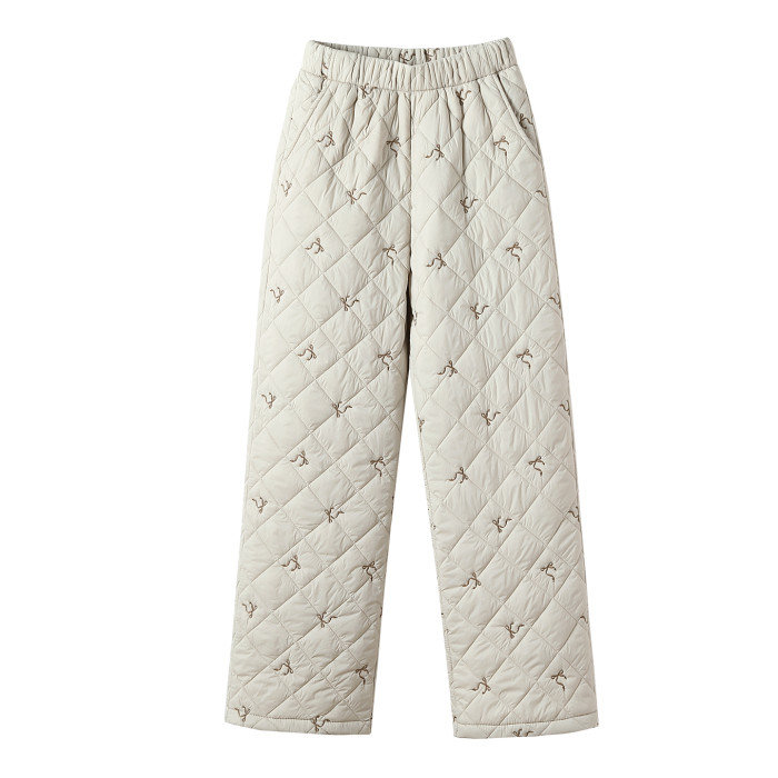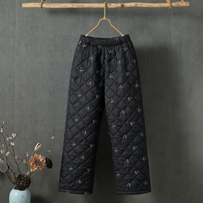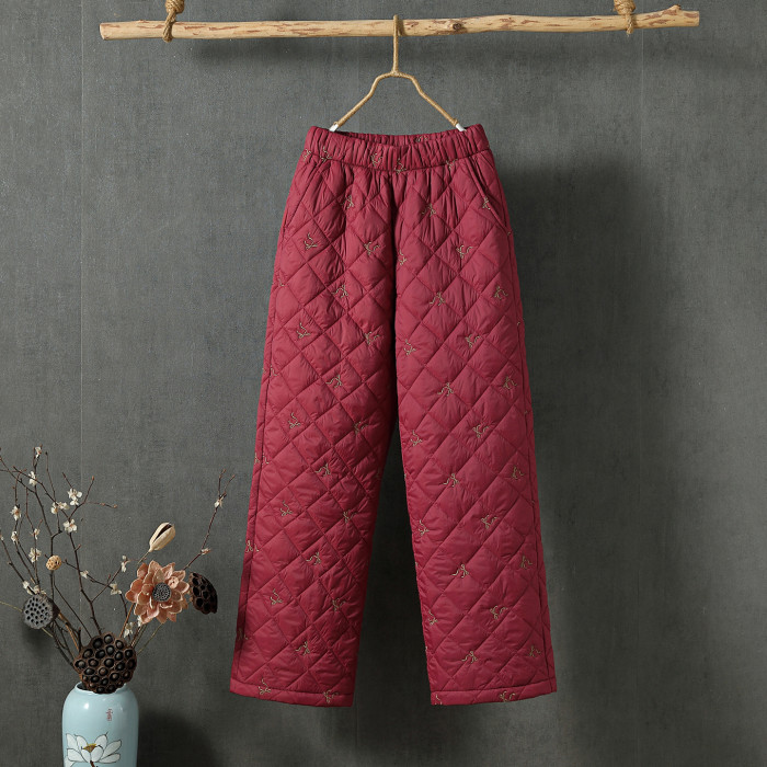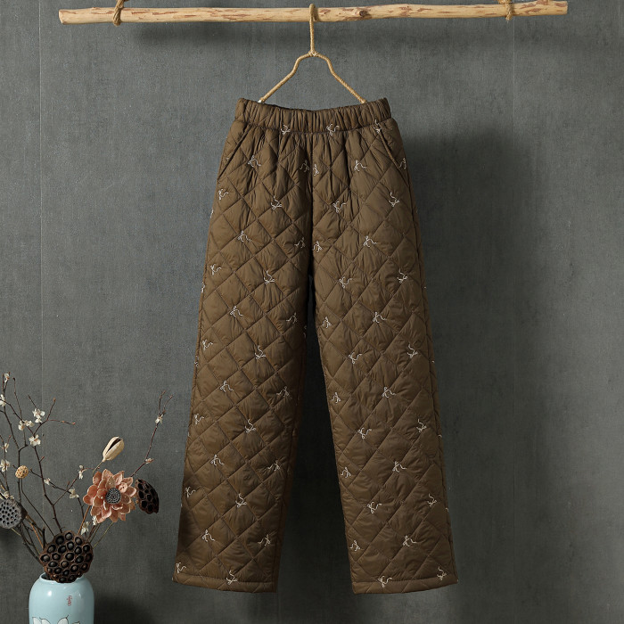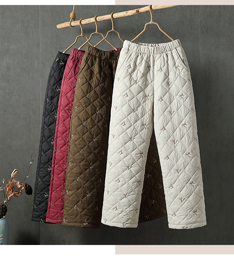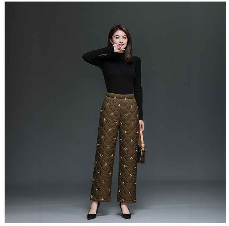 濶腿羽絨棉褲女冬新款保暖外穿高腰時尚綉花休閒直筒外穿媽媽棉褲